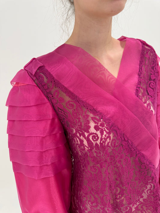 Cămașa vintage statement fucsia din organza și dantela în croi elaborat