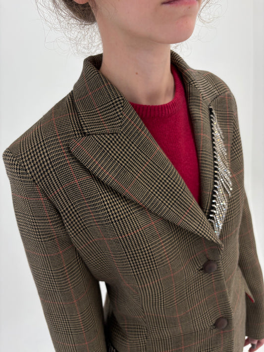 Sacou cambrat camel din lana în carouri pied de coq cu franjuri de cristale