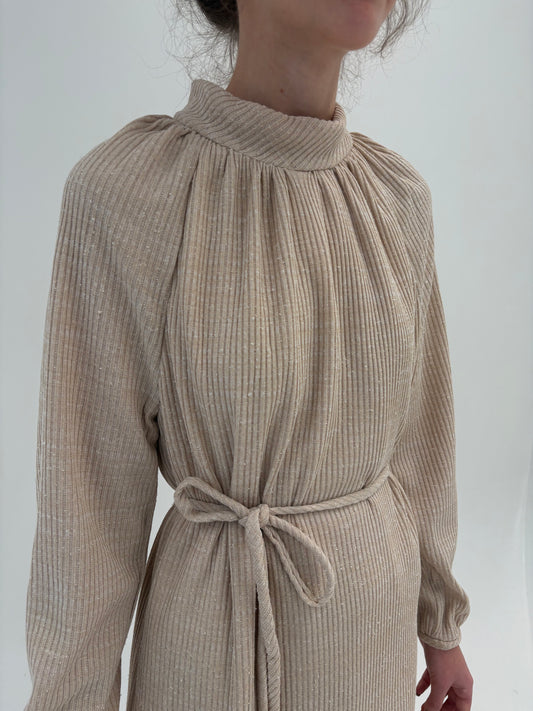 Rochie vintage light nude tricot ribbed cu lana și talie marcată reglabilă