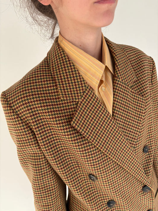 Sacou camel cu închidere dublă în carouri din tweed moale de lana