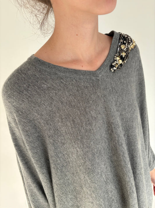 Pulover în croi tip capa din lana merino extrafina cu aplicații