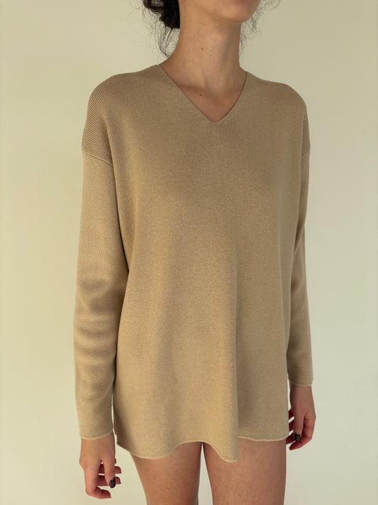 Pulover camel din lana merino extrafina ribbed in croi lejer