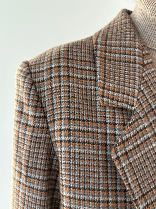 Sacou cambrat chocolate brown în carouri fine camel din lana extrafina