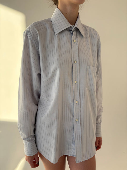 Oversized/ L/XLCămașa baby blue în croi actual cu dungi fine verticale taupe