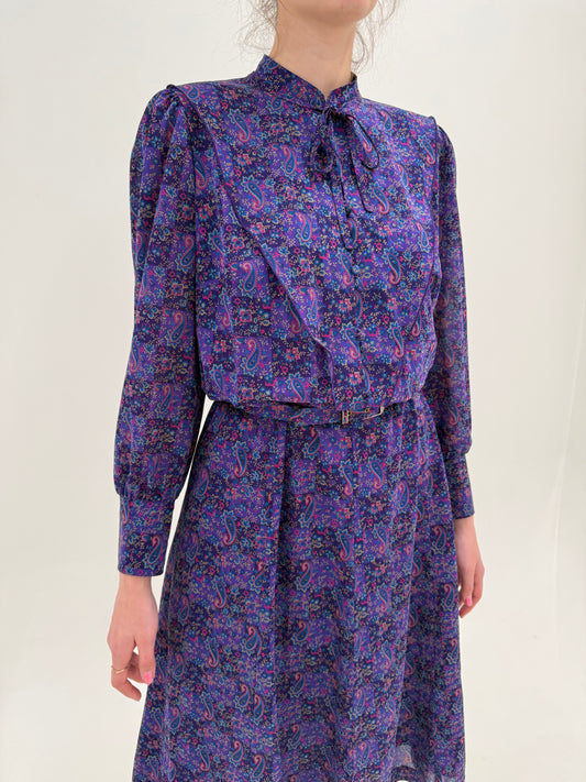 Rochie vintage indigo purple cu print paisley cu roz tare și talie elastică înaltă