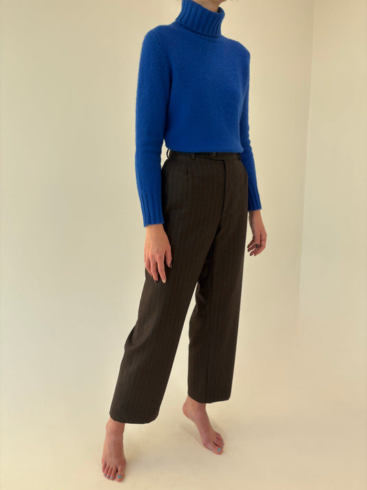 Costum italian chocolate brown cu dungi fine verticale albastru regal