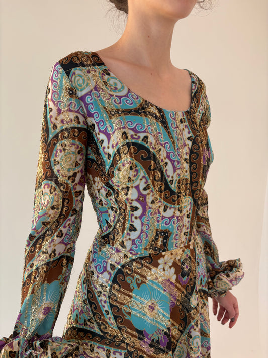 Rochie vintage maxi de seară cu print paisley și inserții fine aurii