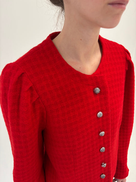 Sacou cambrat cherry red in stil Chanel din tweed de lana certificată
