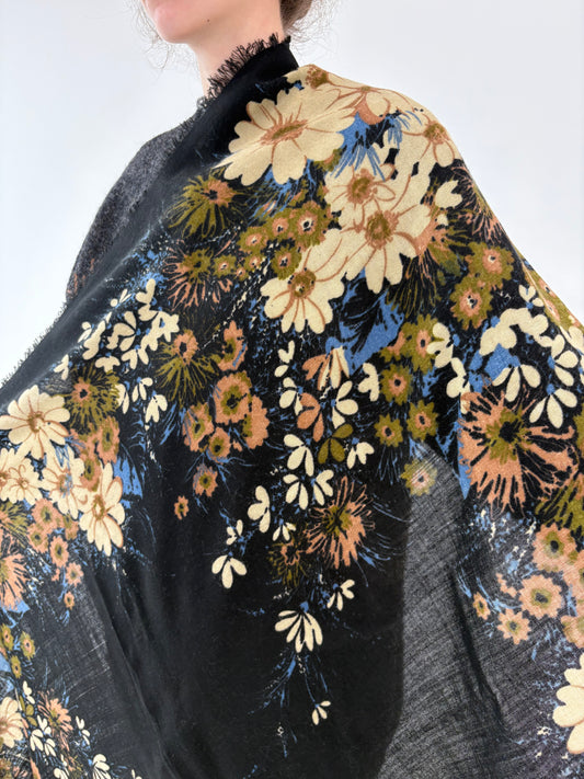 Eșarfă XXXXL neagră cu print floral superb din lana extrafina