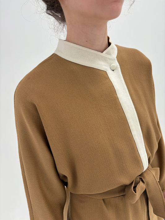 Rochie old vintage camel anii 70 cu talie ultra înaltă reglabilă din lana extrafina
