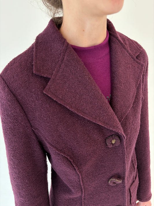 Sacou dark burgundy cambrat din boiled wool cu inserții extrafine de lurex