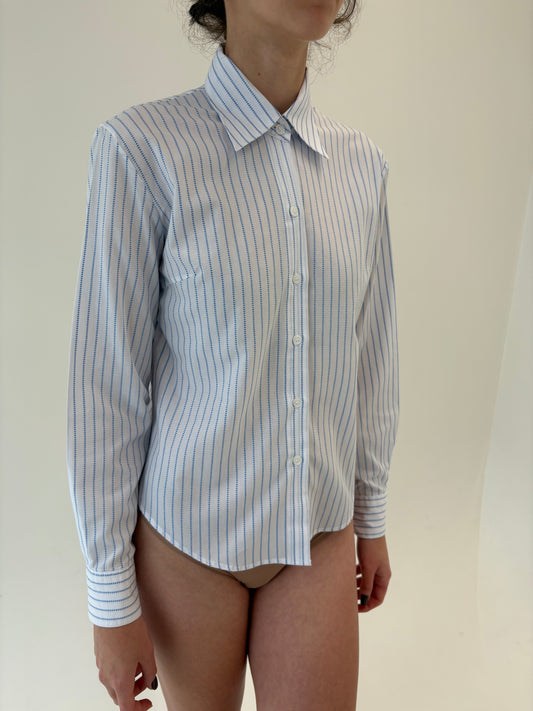 Cămașa cu dungi baby blue în croi ușor cambrat