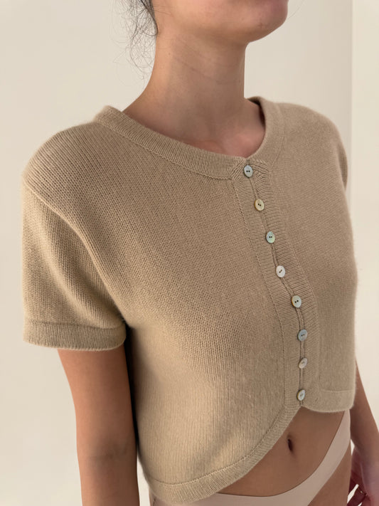 Top camel din cașmir în croi ușor cropped și nasturi decorativi
