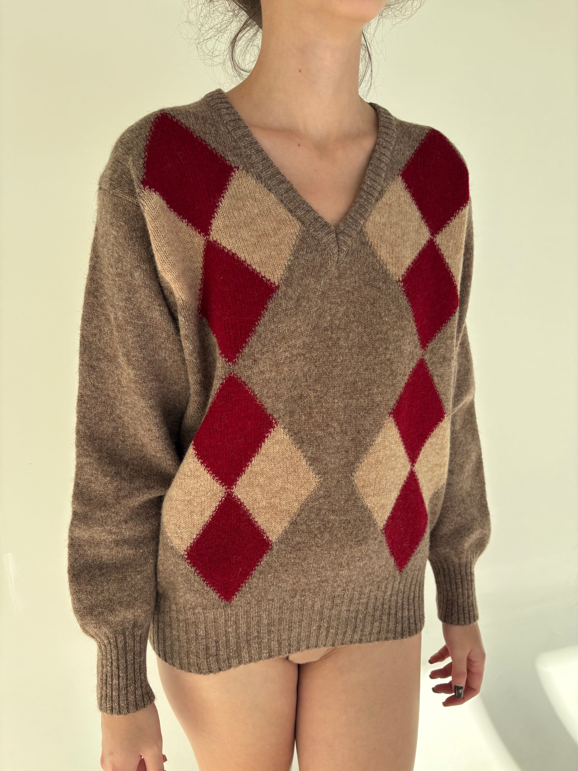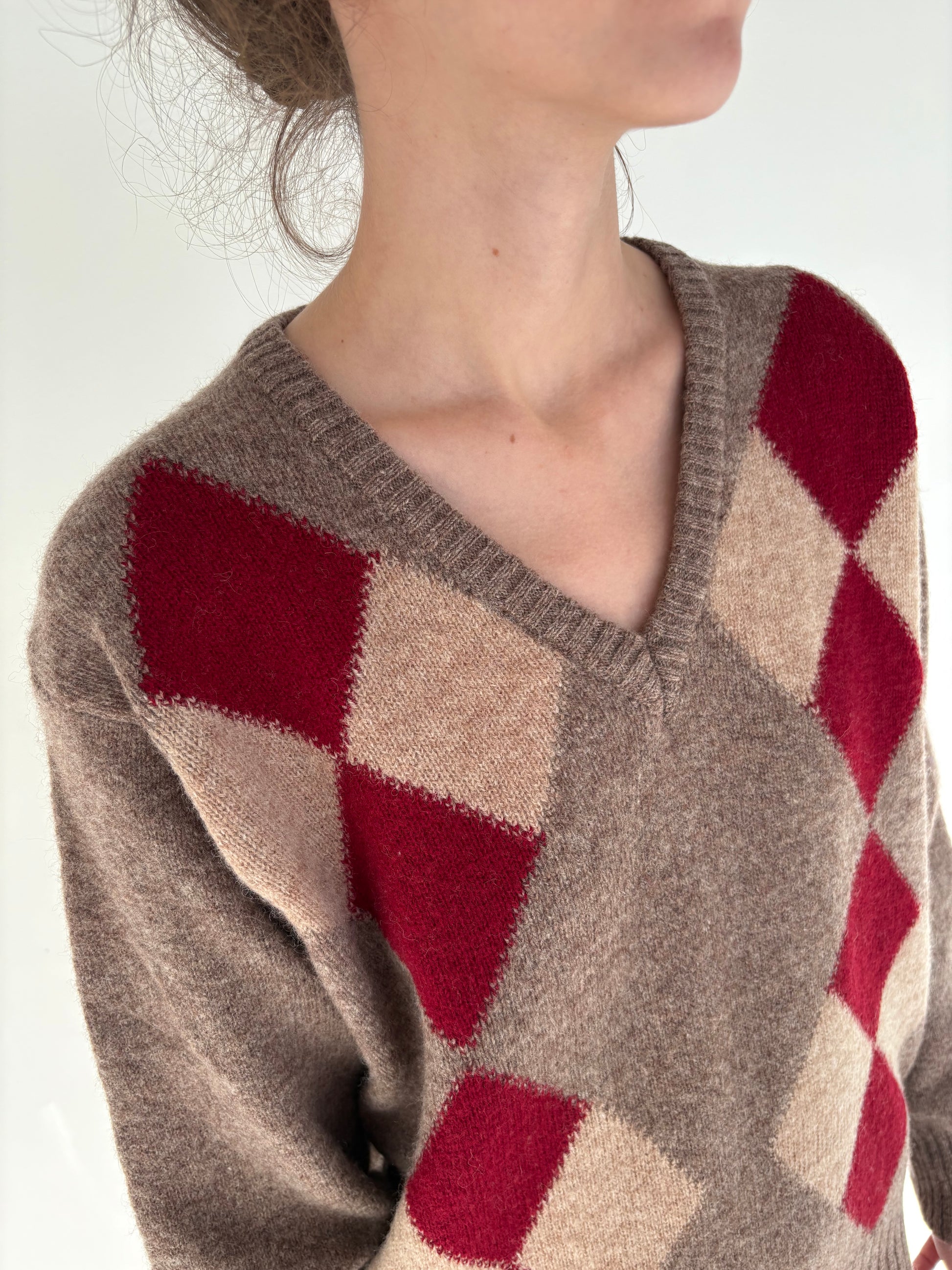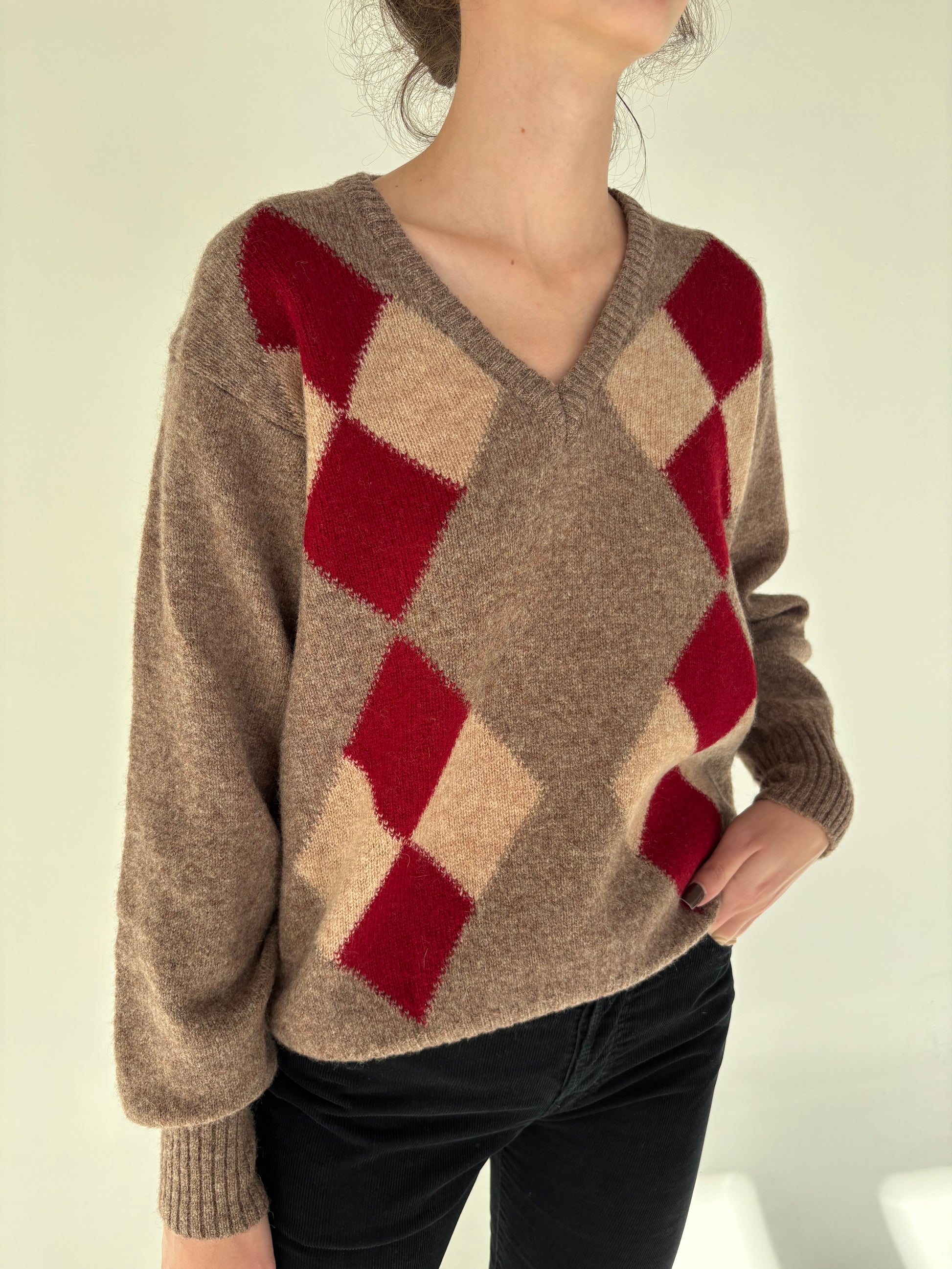 Pulover din lana groasă dark nude cu romburi și manșete îngustate