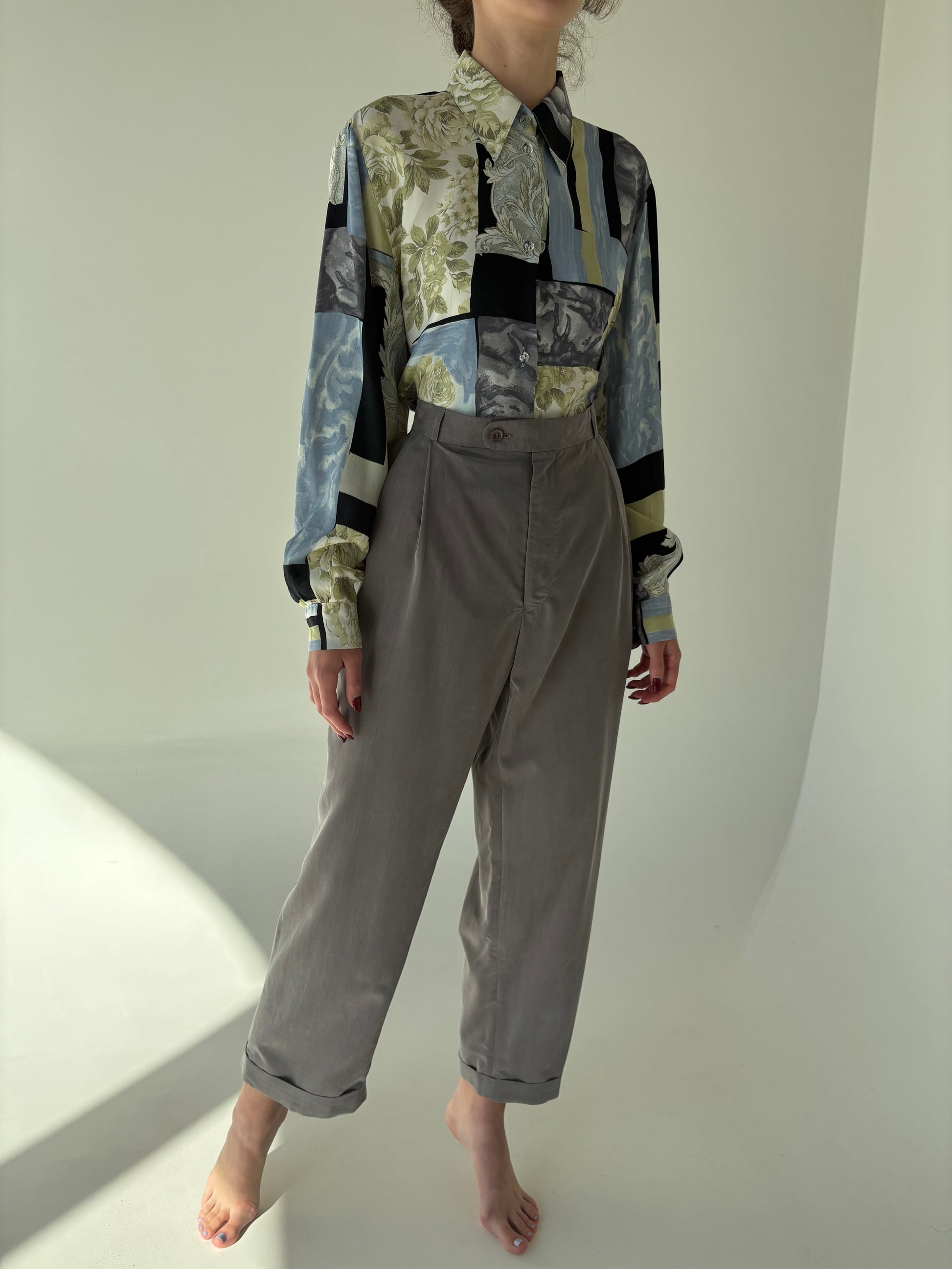 Pantaloni cu talie mai generoasă, pense și aspect de piele întoarsă