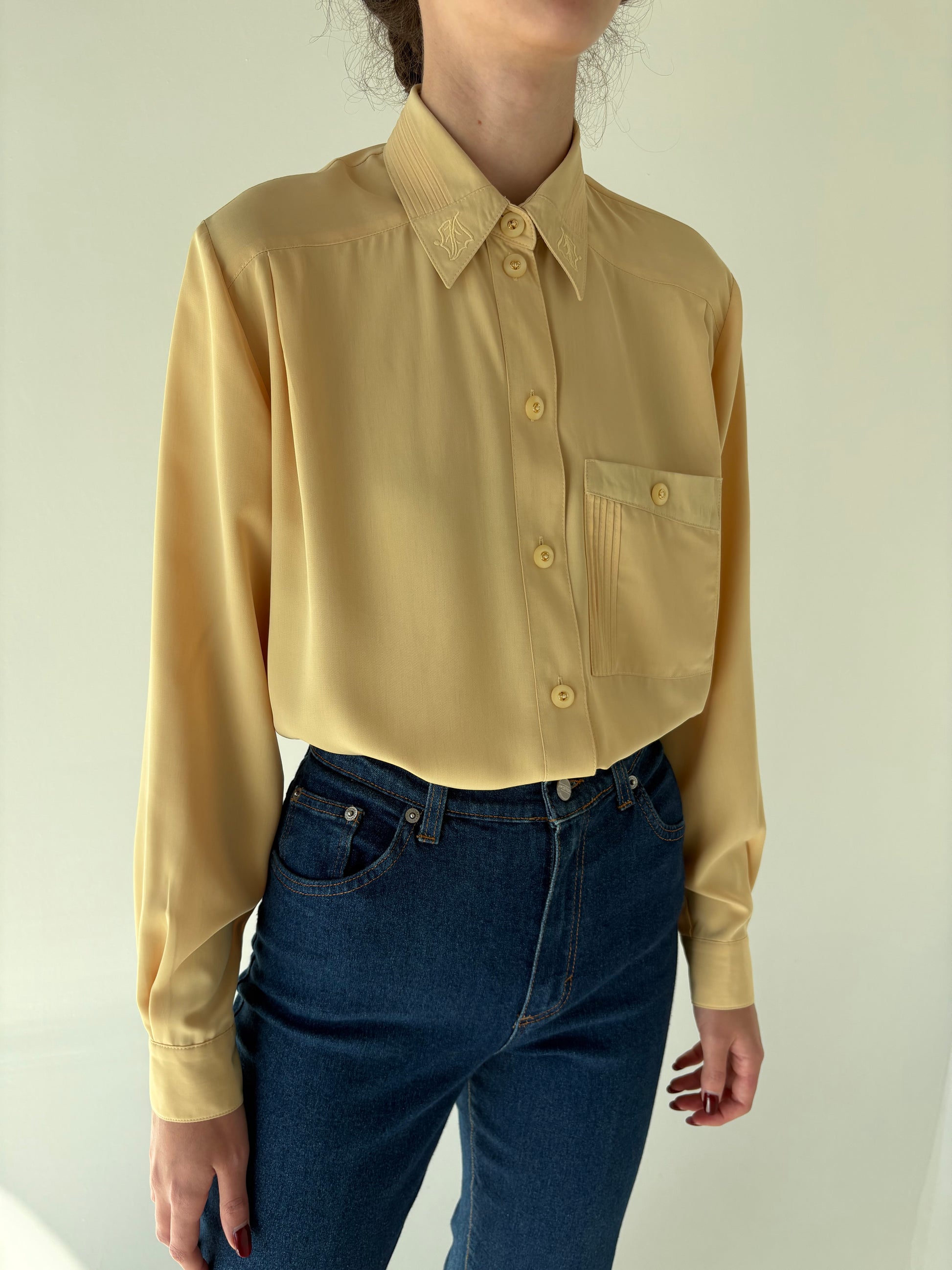 Cămașa vinatge butter yellow din poplin texturat și guler brodat