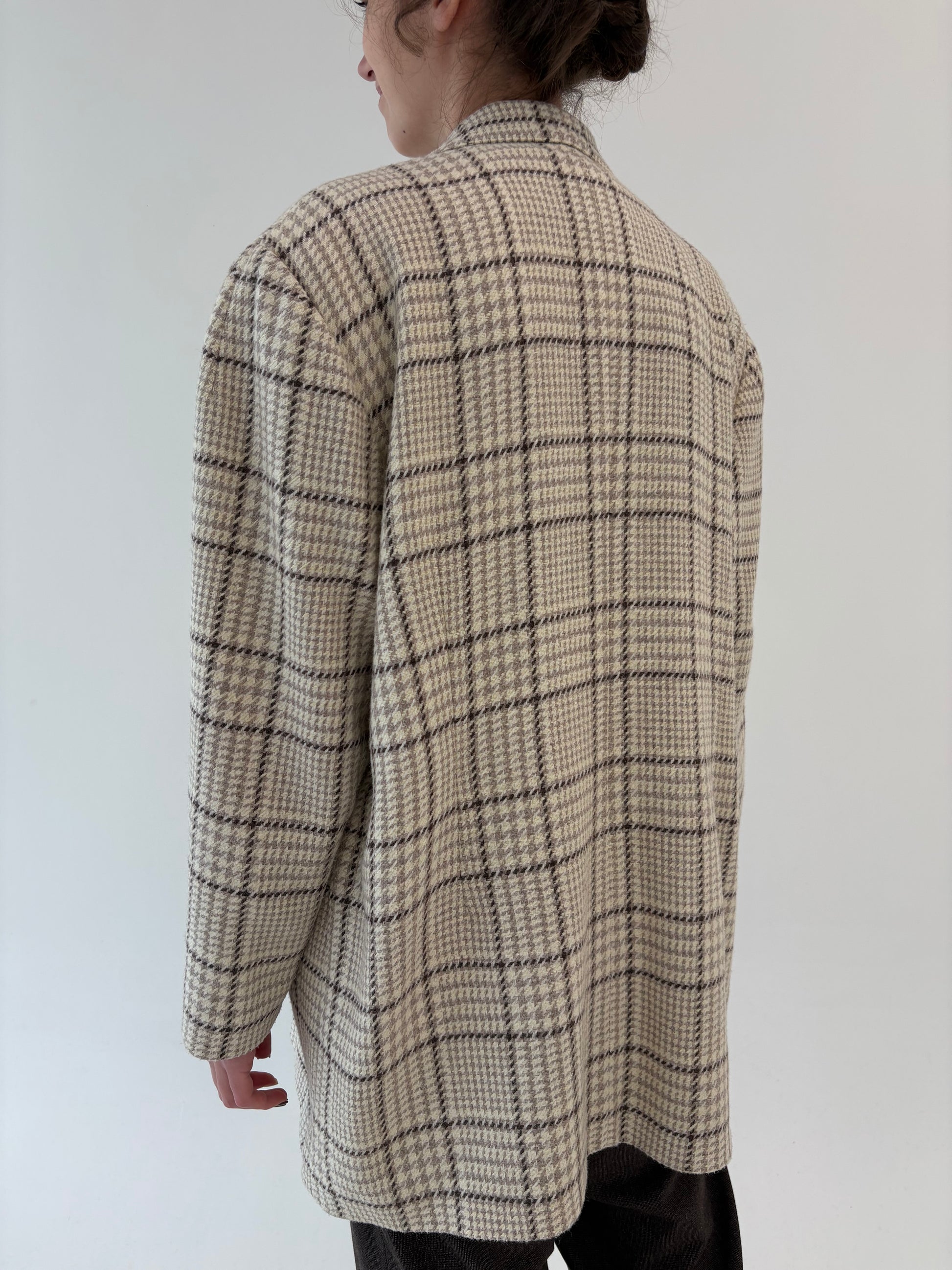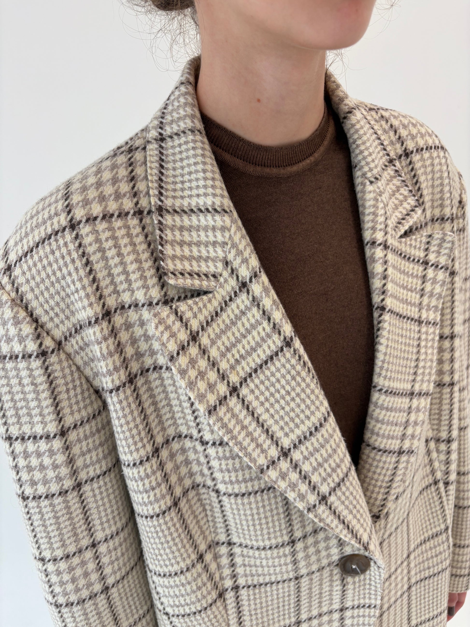 Sacou lung light nude în carouri din tweed moale de lana extrafina