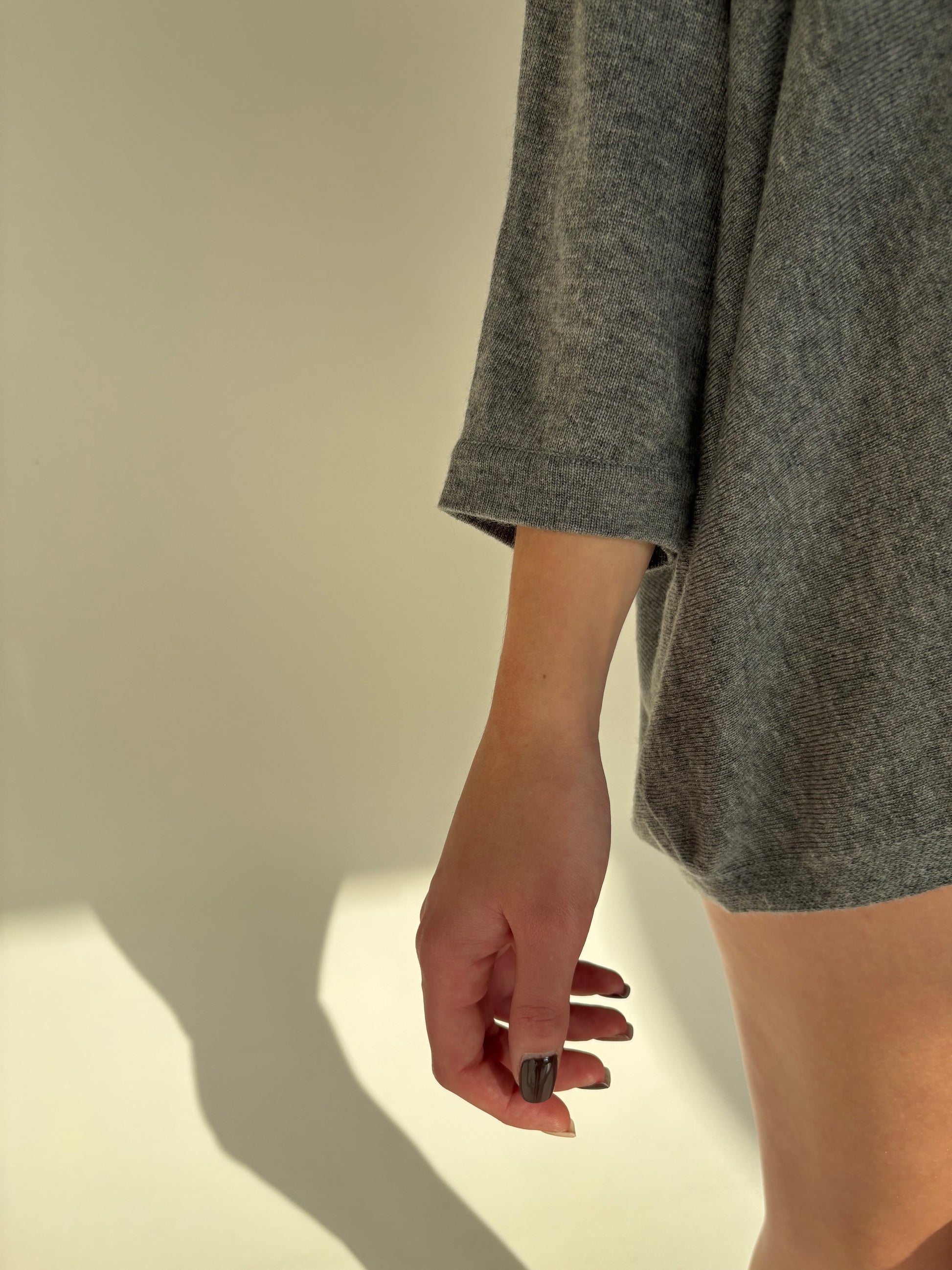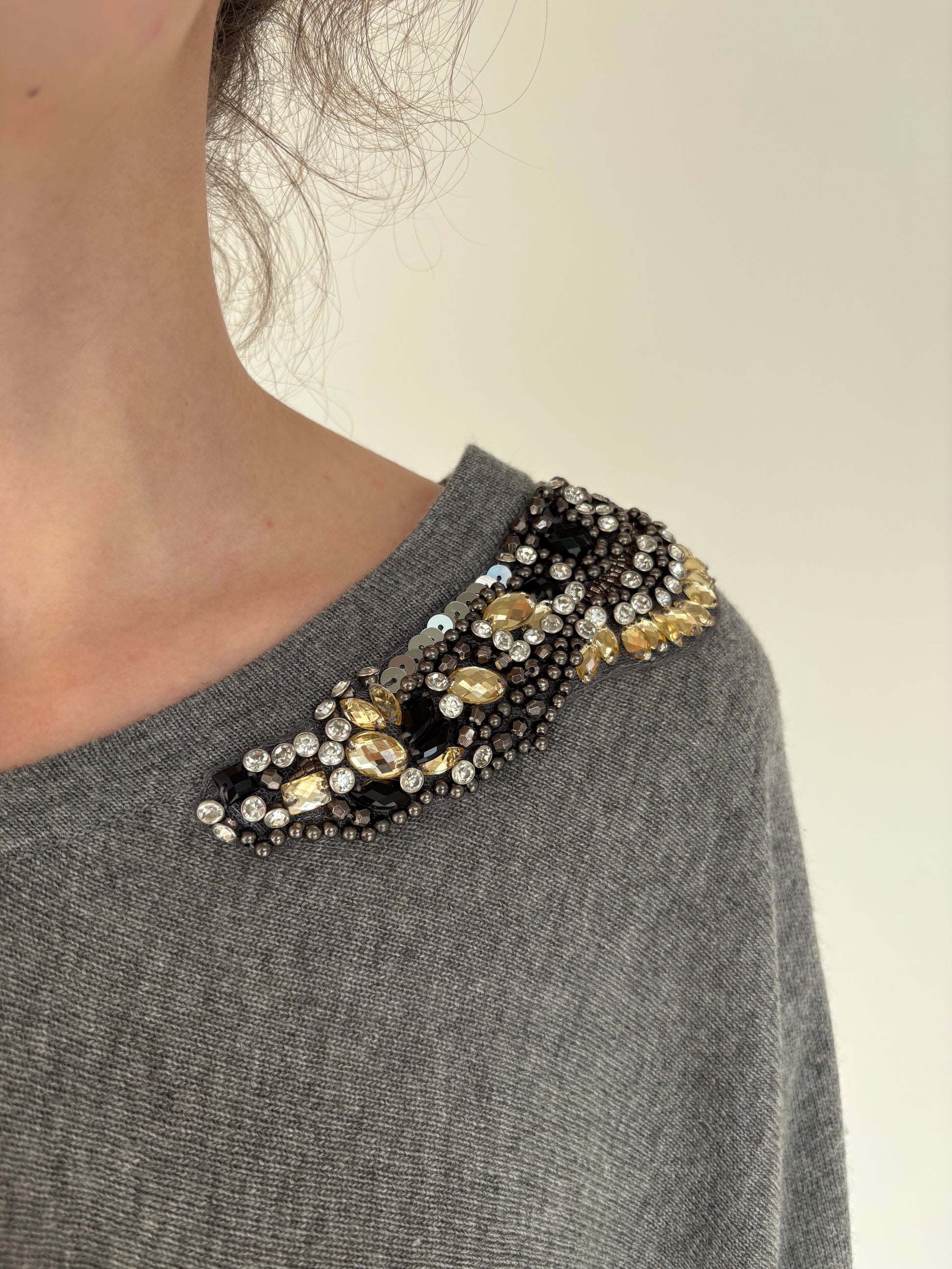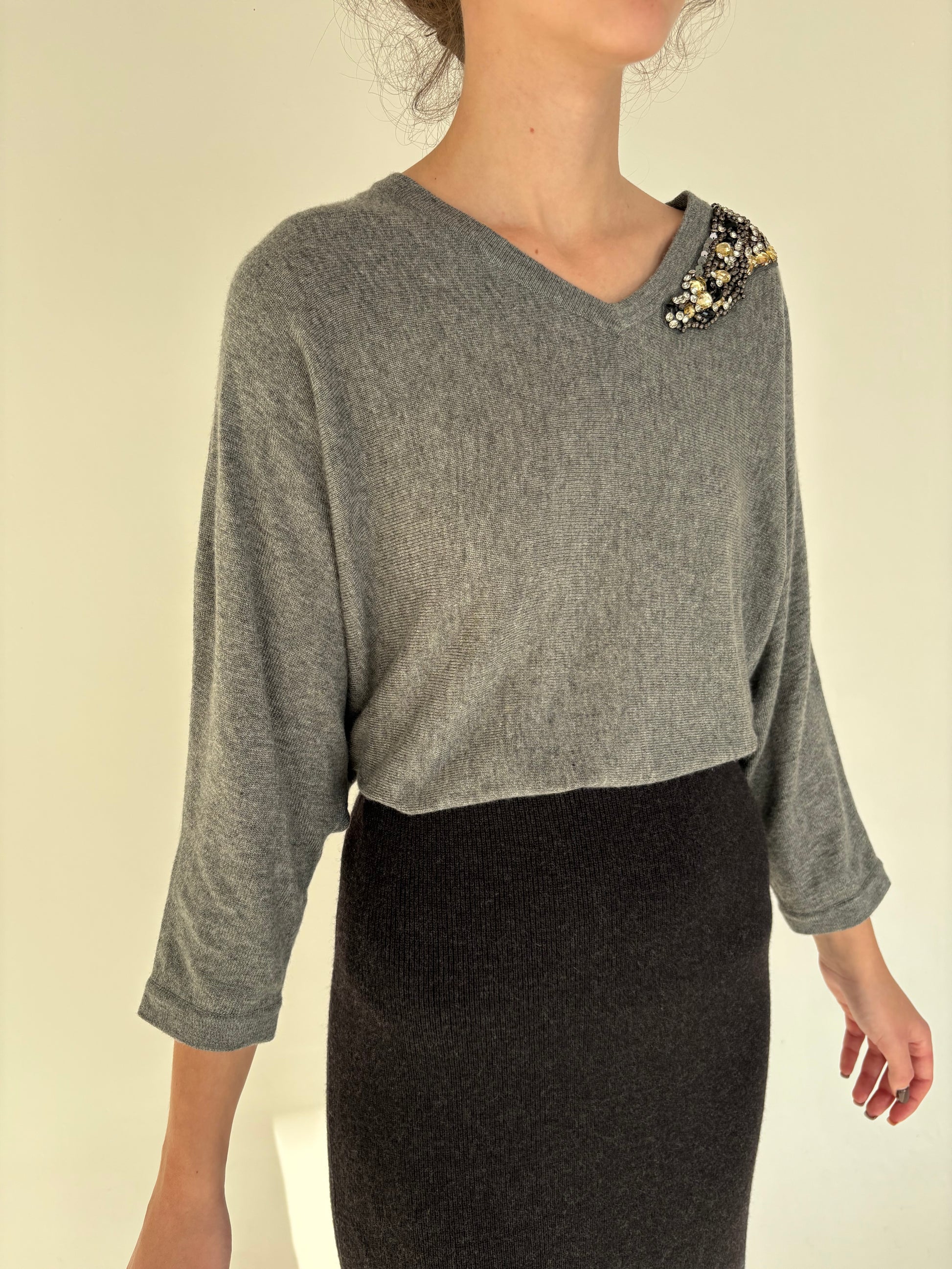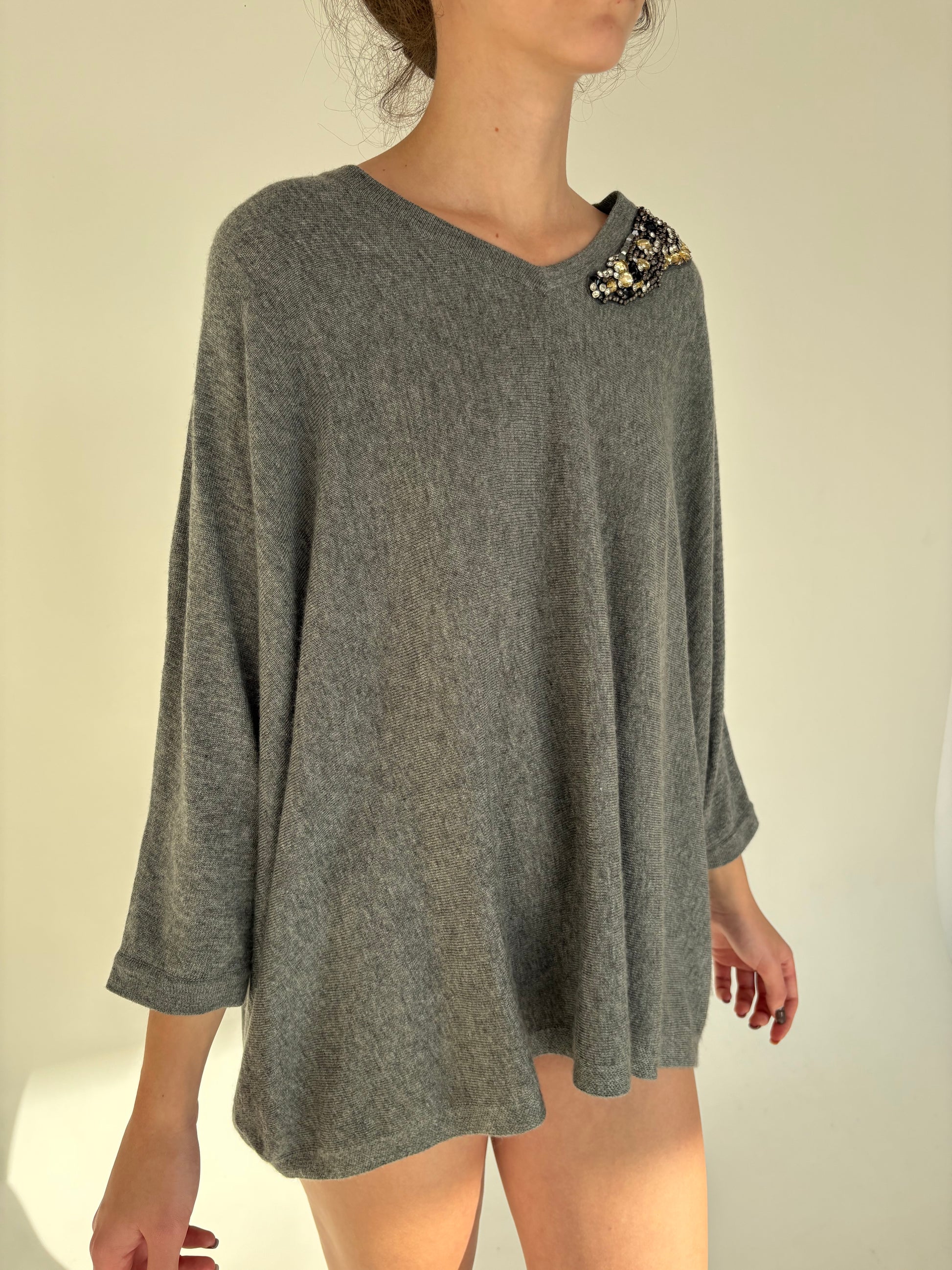 Pulover în croi tip capa din lana merino extrafina cu aplicații
