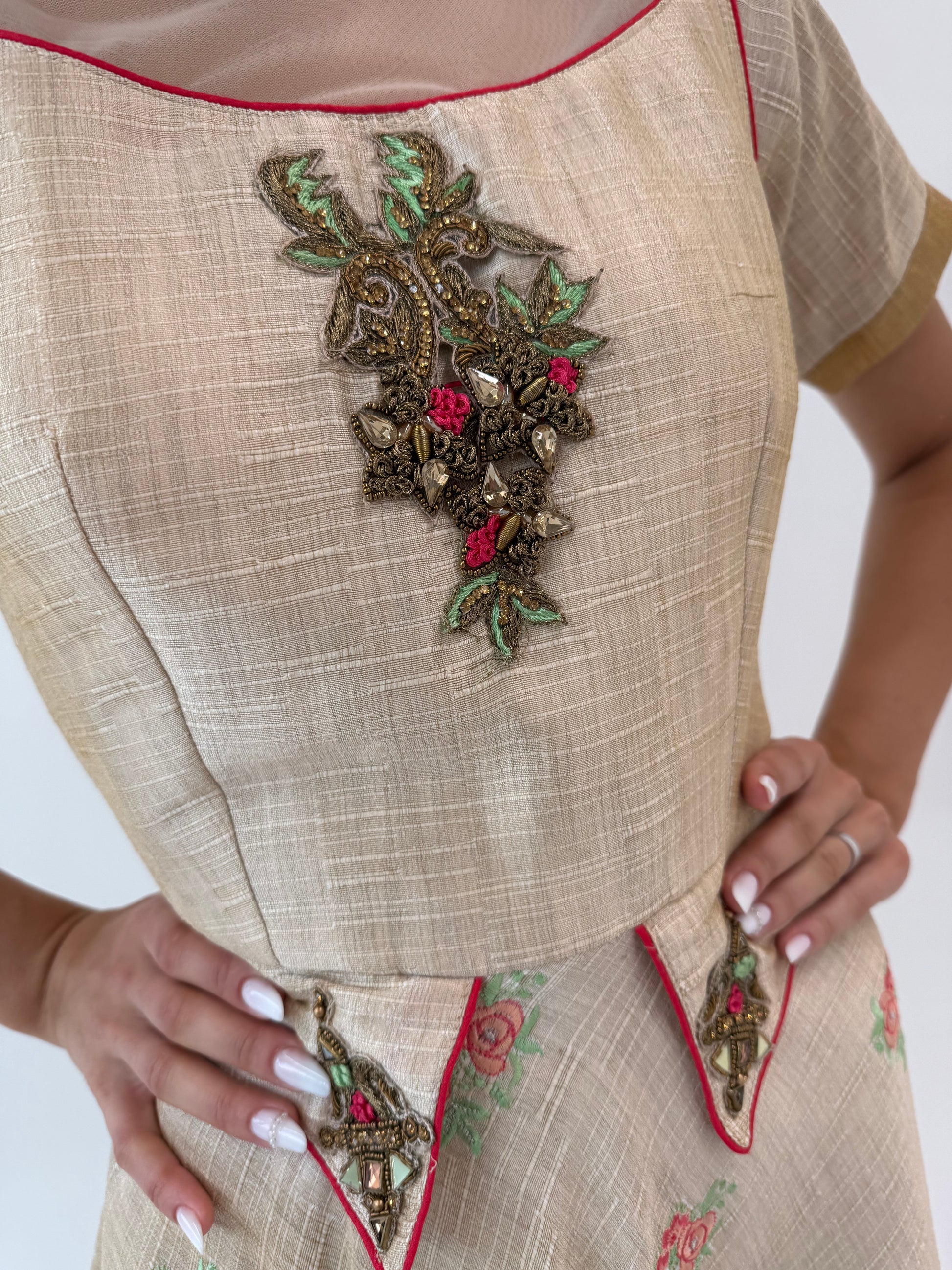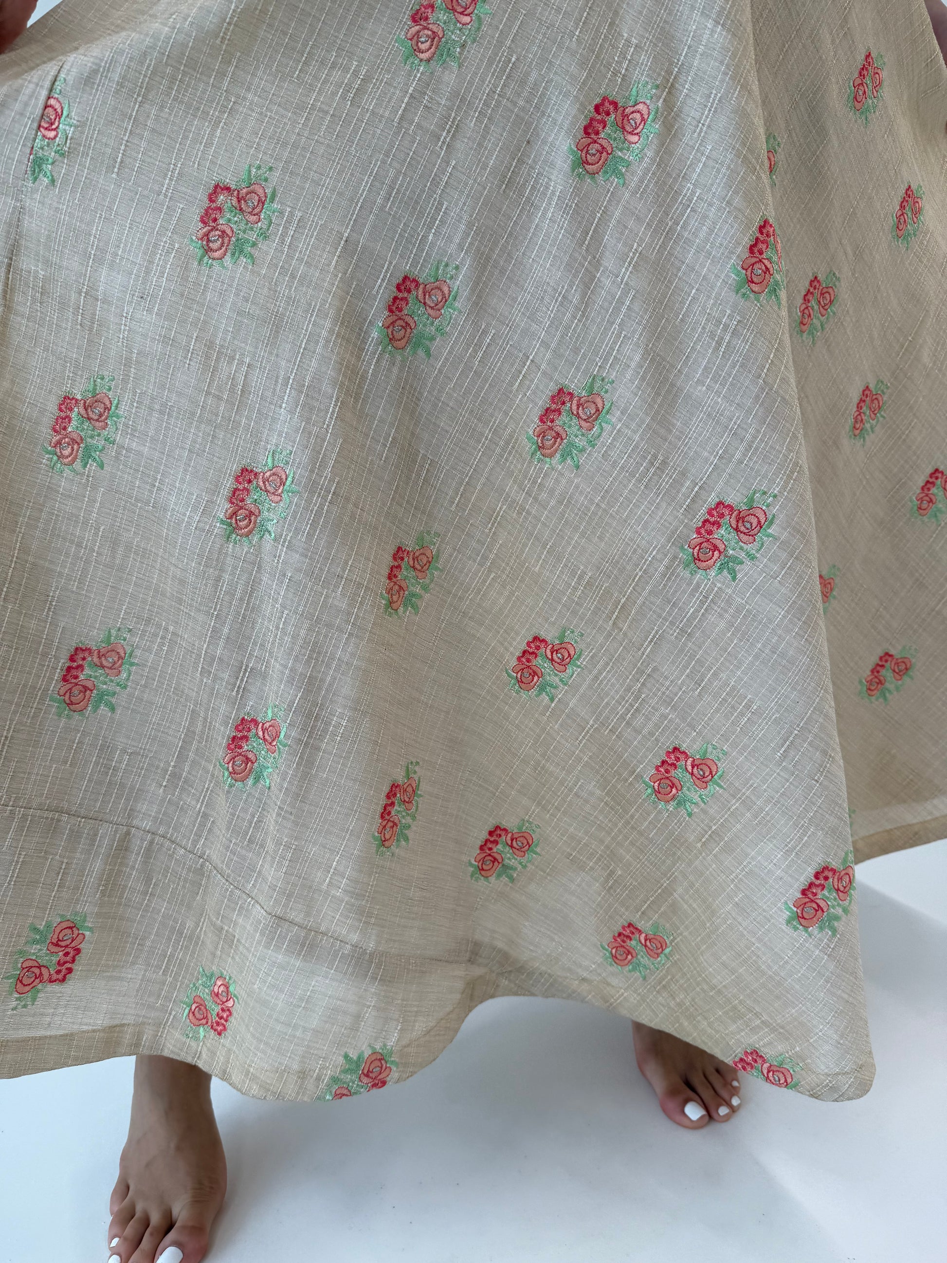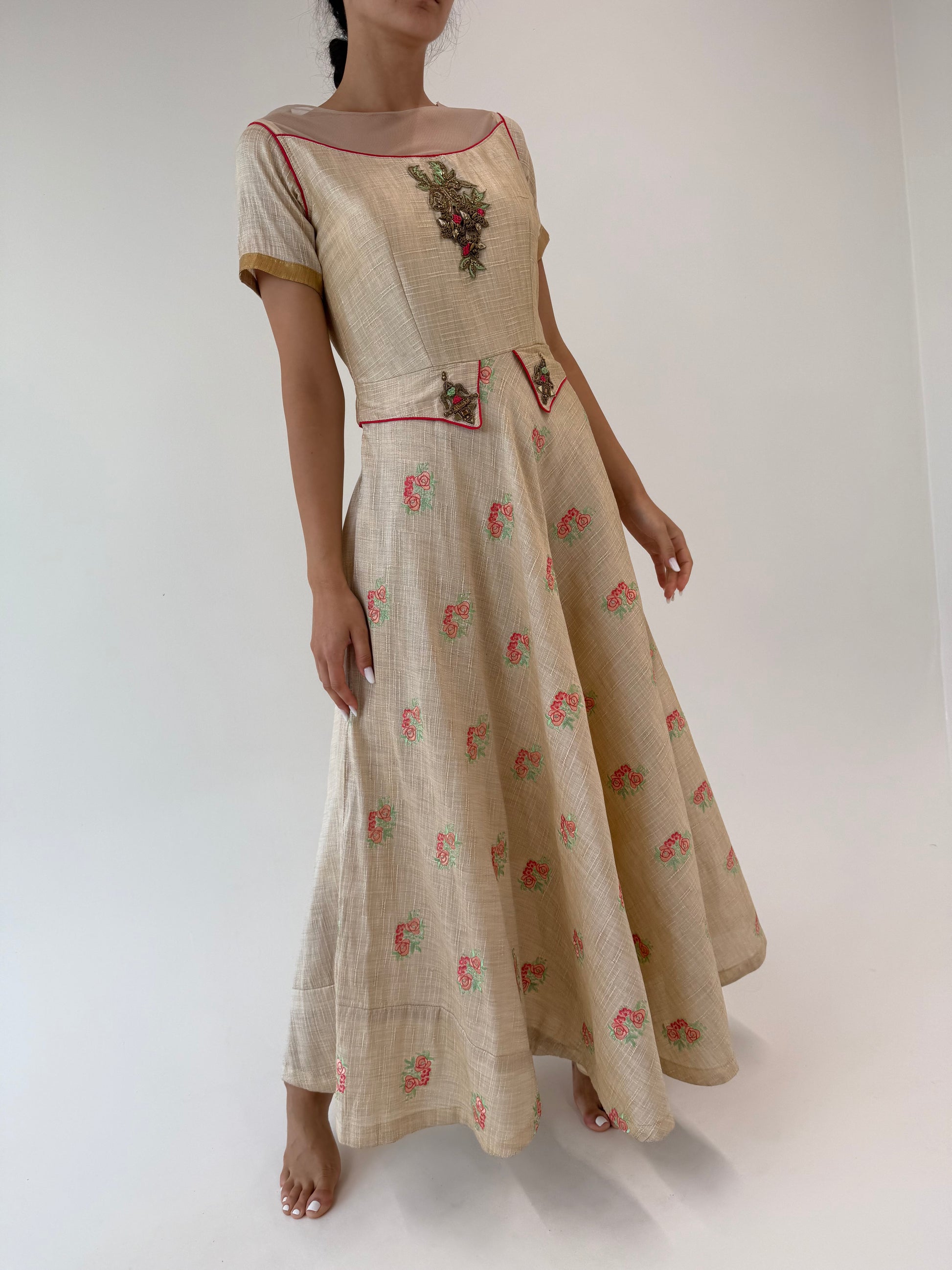 Rochie maxi light camel cu corsaj și aplicații manuale superbe