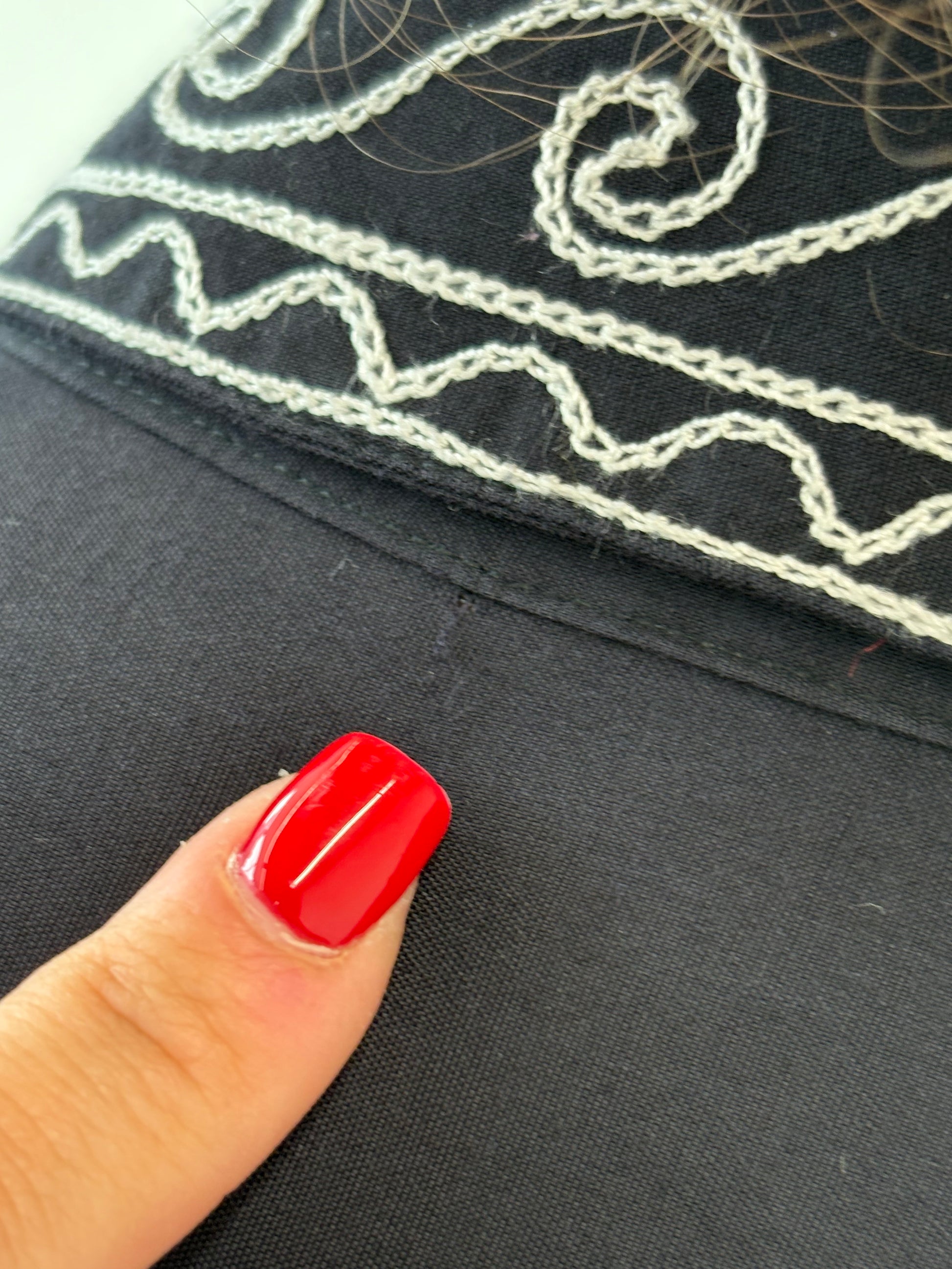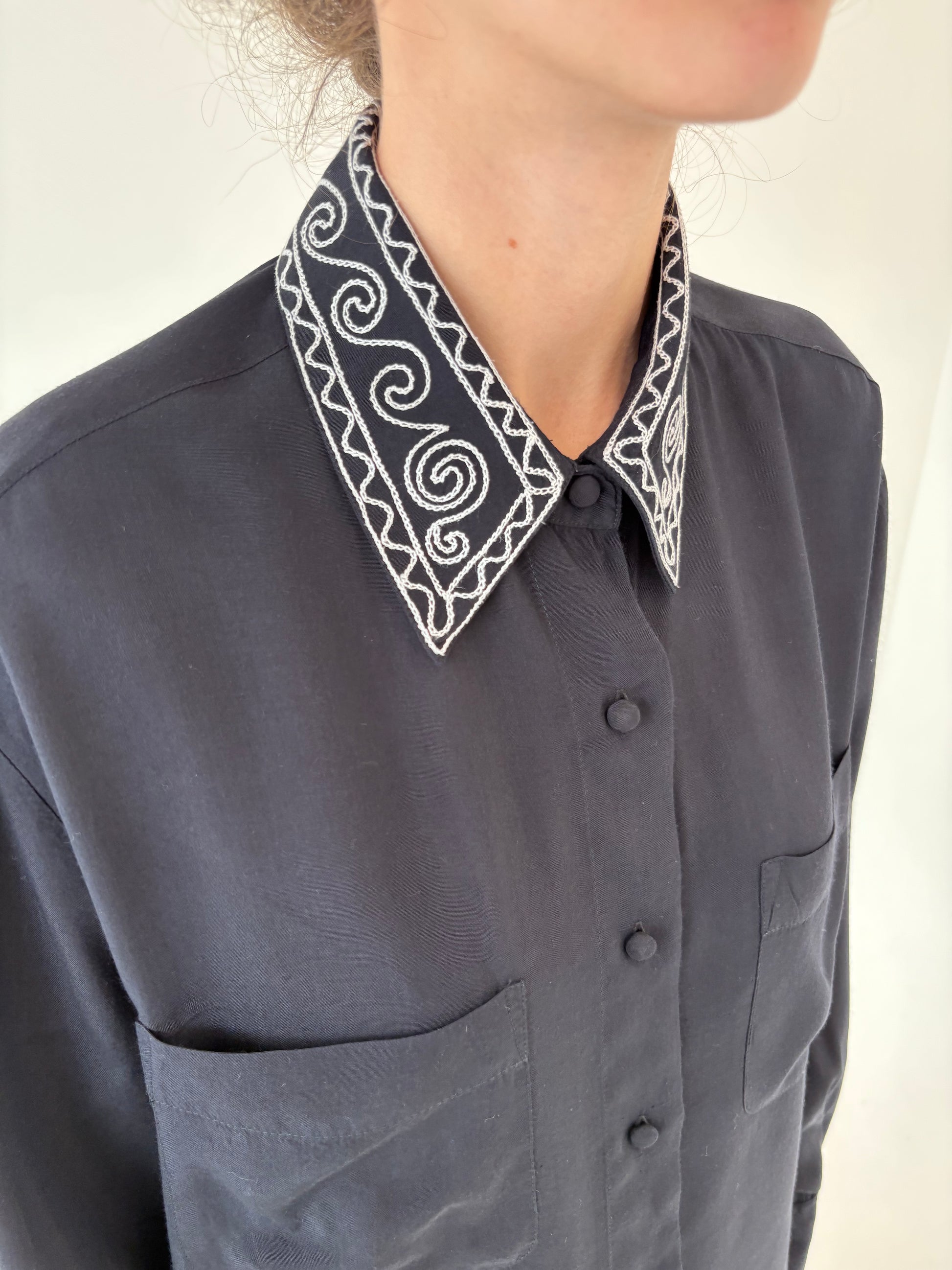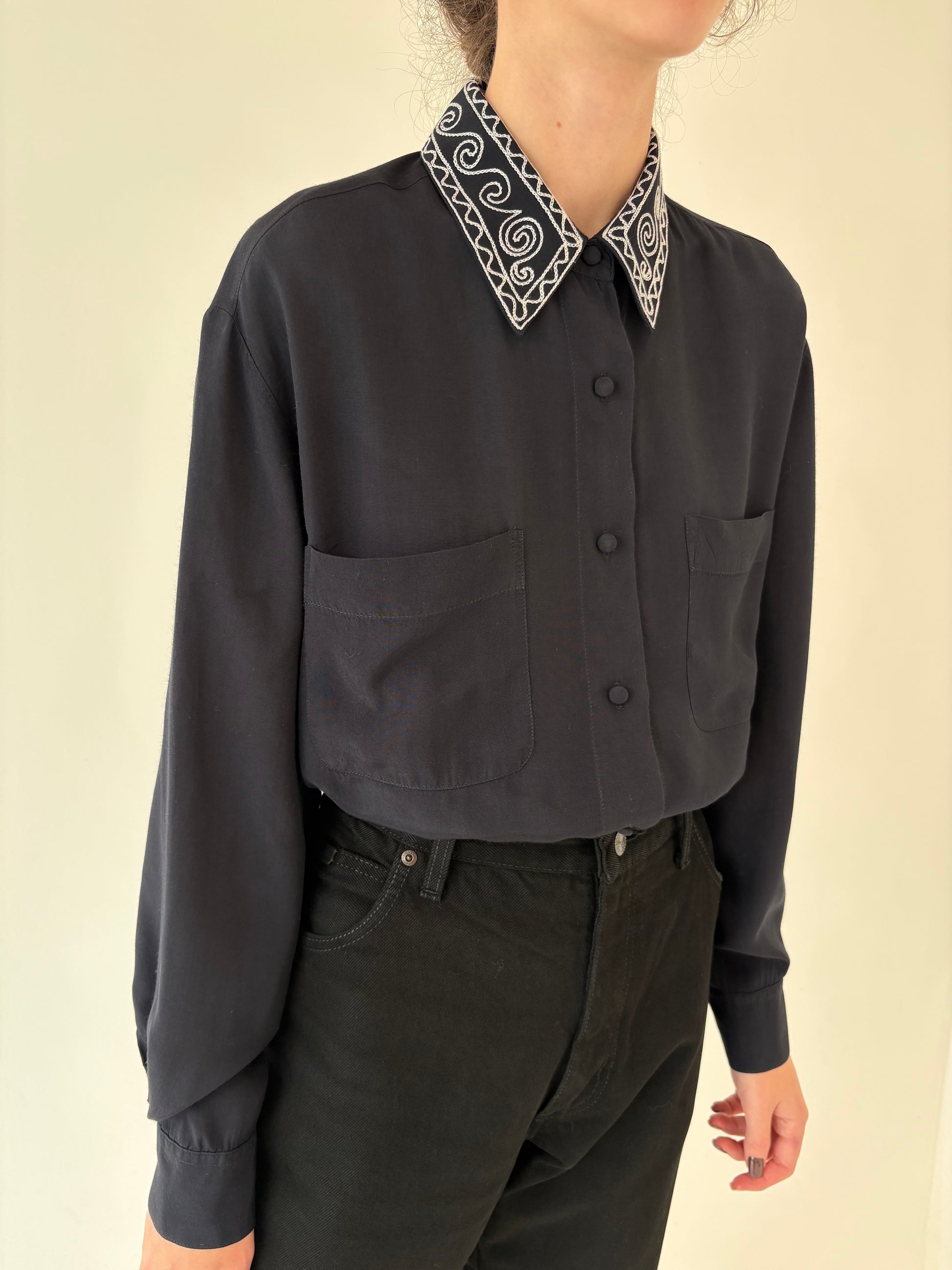 Cămașa neagră cu broderie contrastanta pe revere