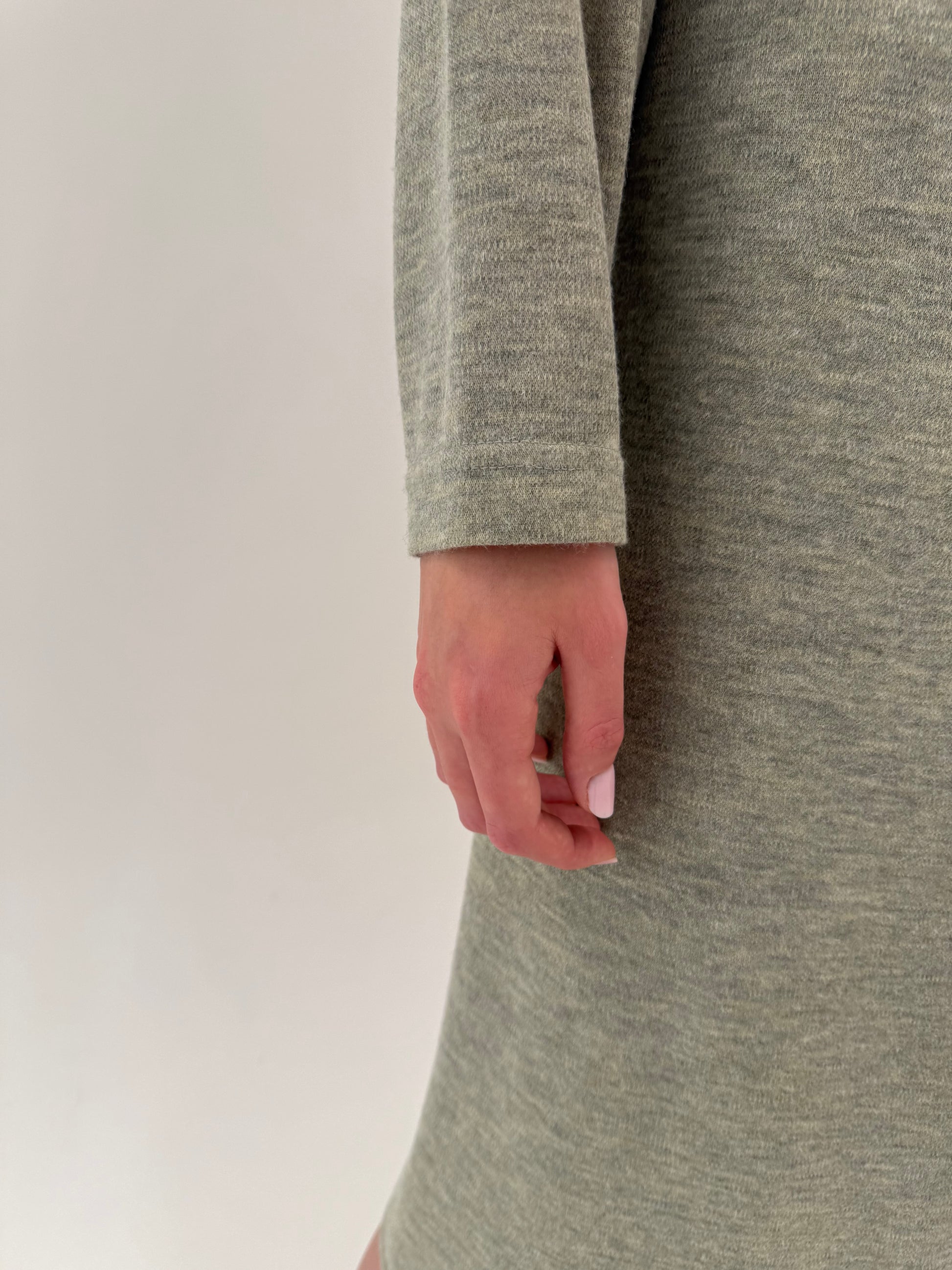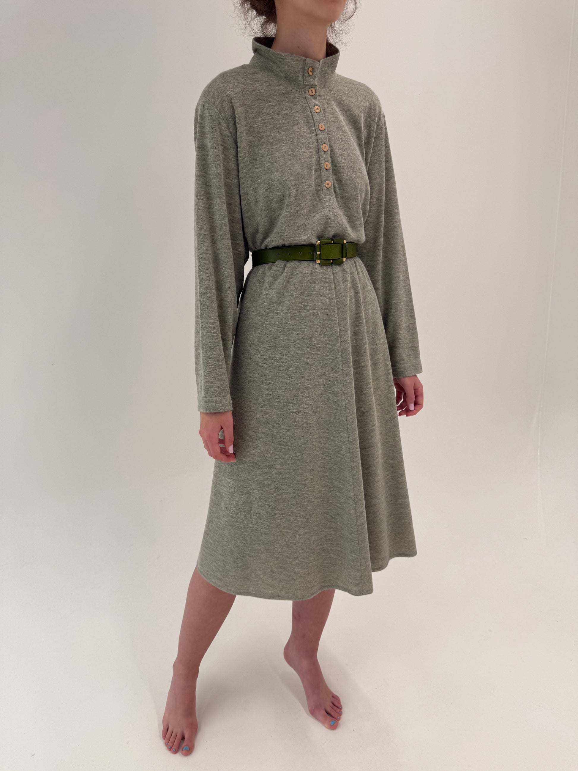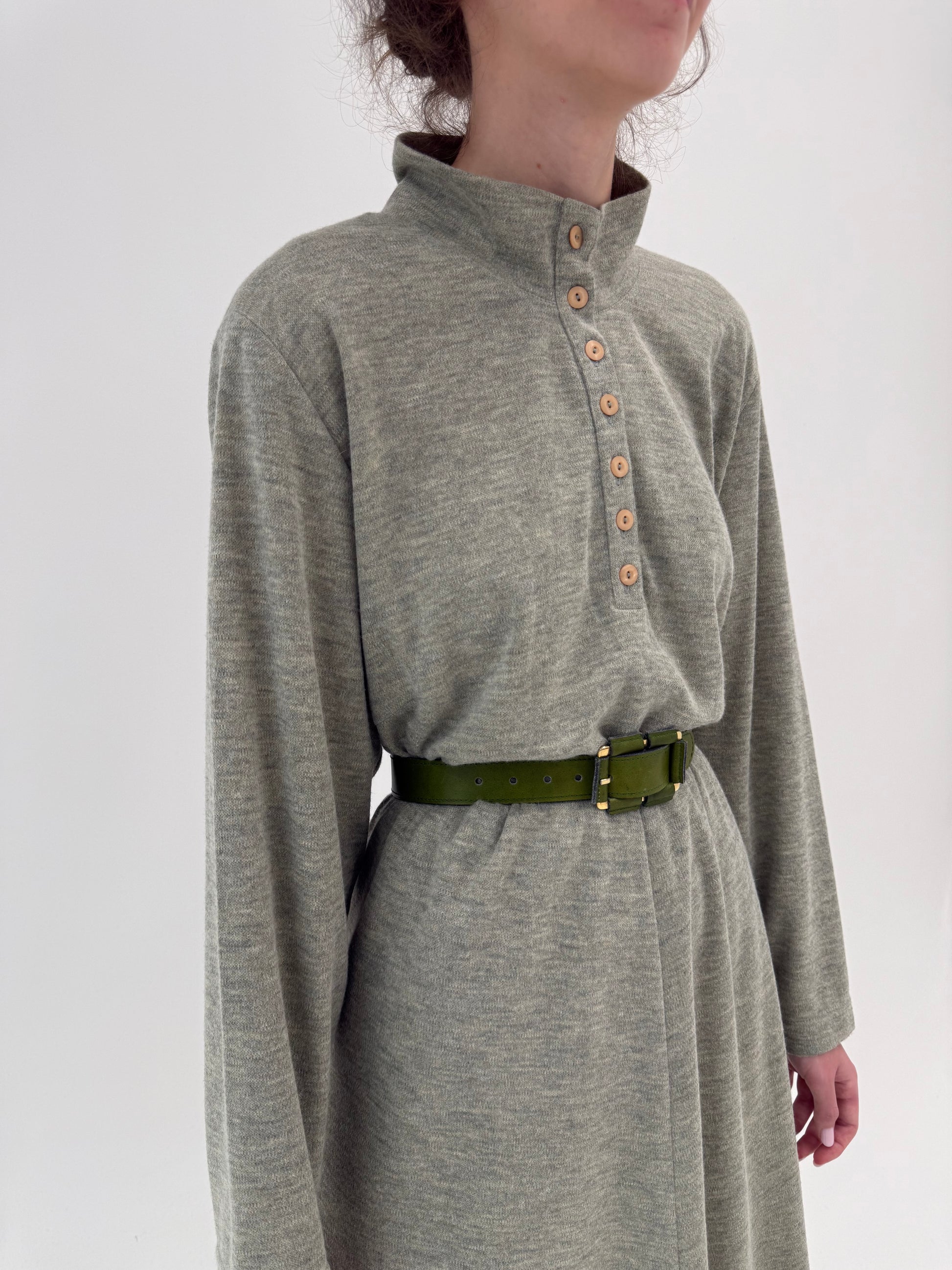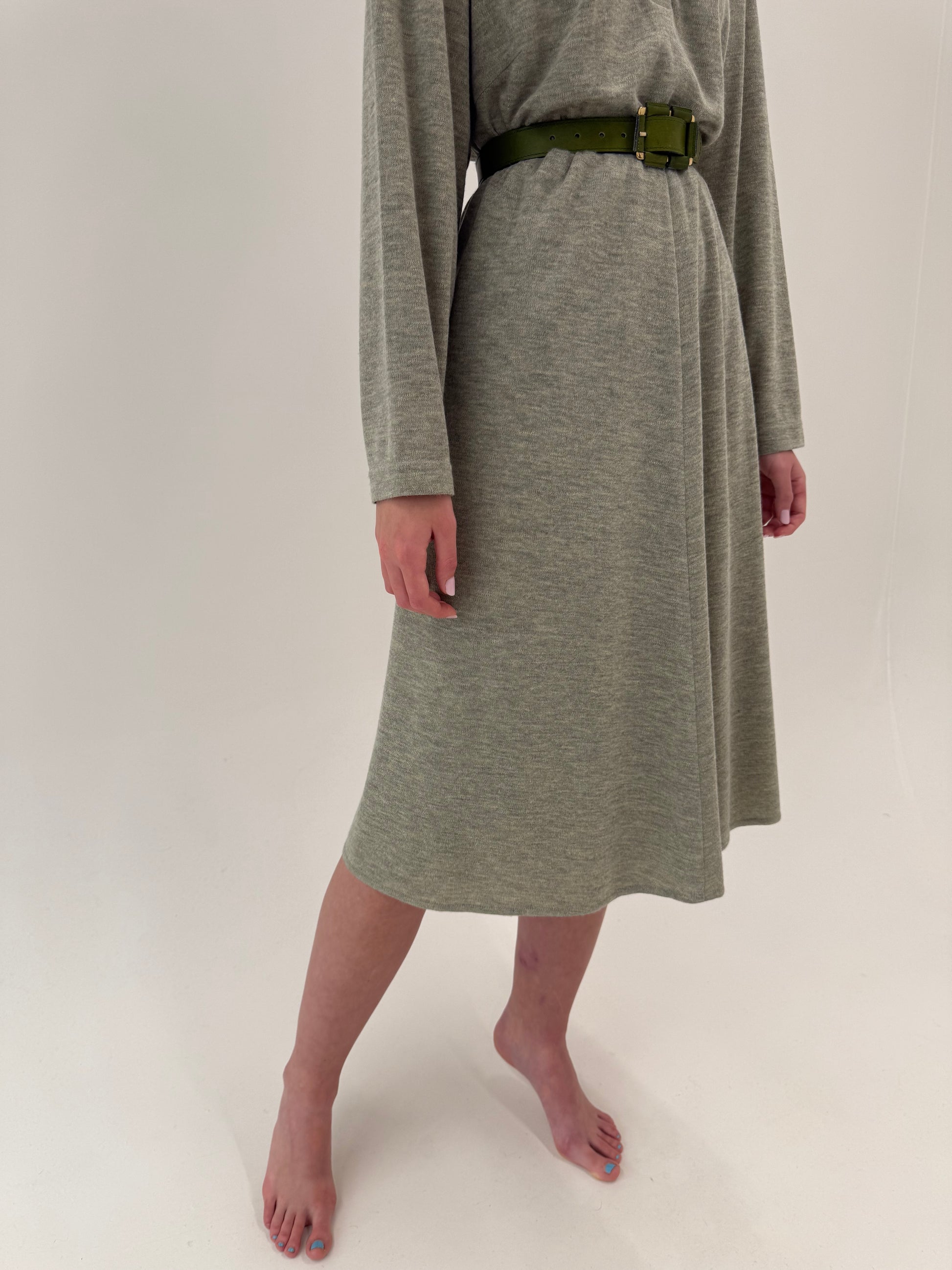 Lungimea midi spre maxi și jerseul de lână melanj în vacel-verzui sunt tot în estetica 80s