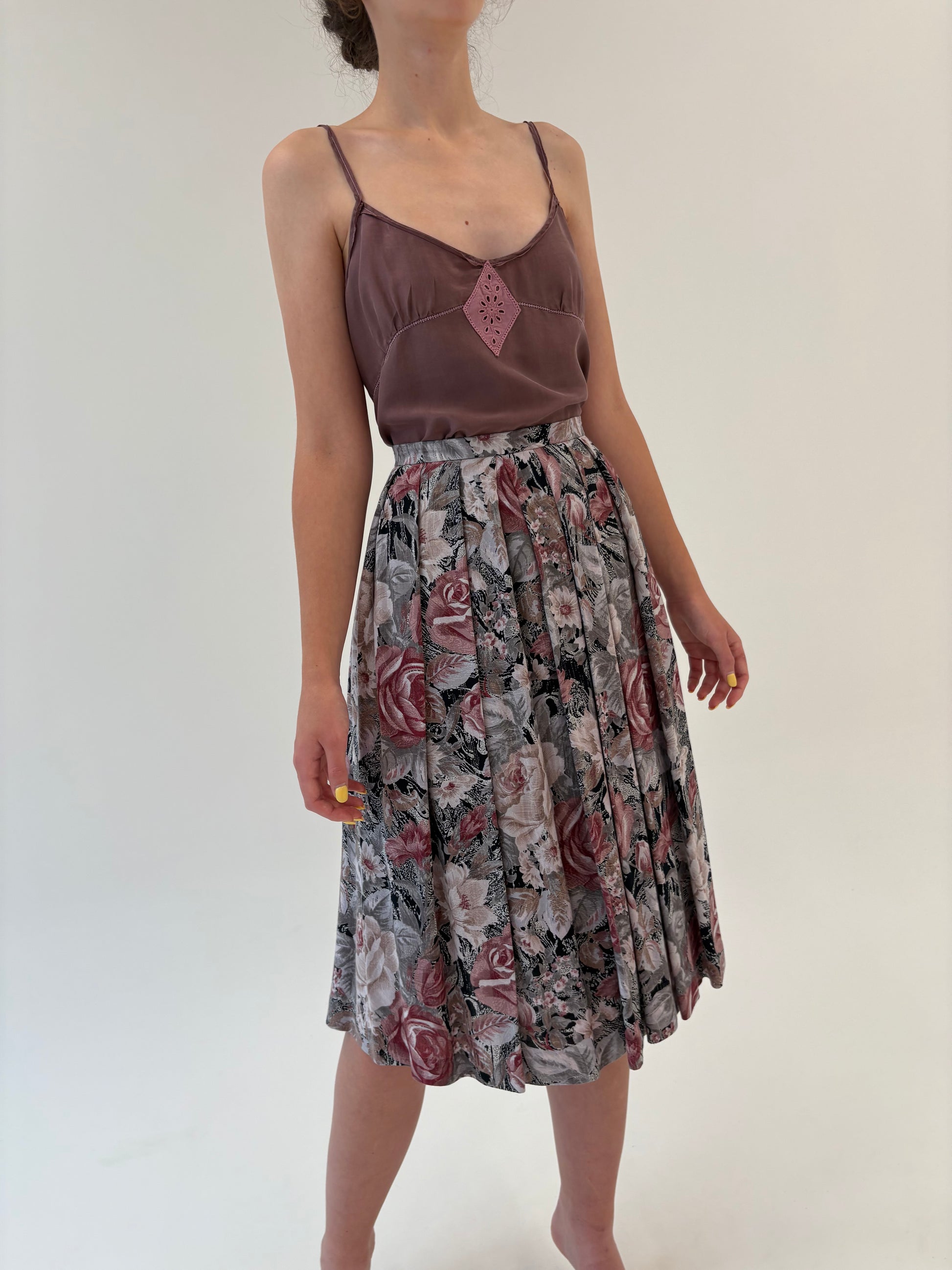 Fustă vinatge cu print floral superb old rose pink și talie ultra înaltă
