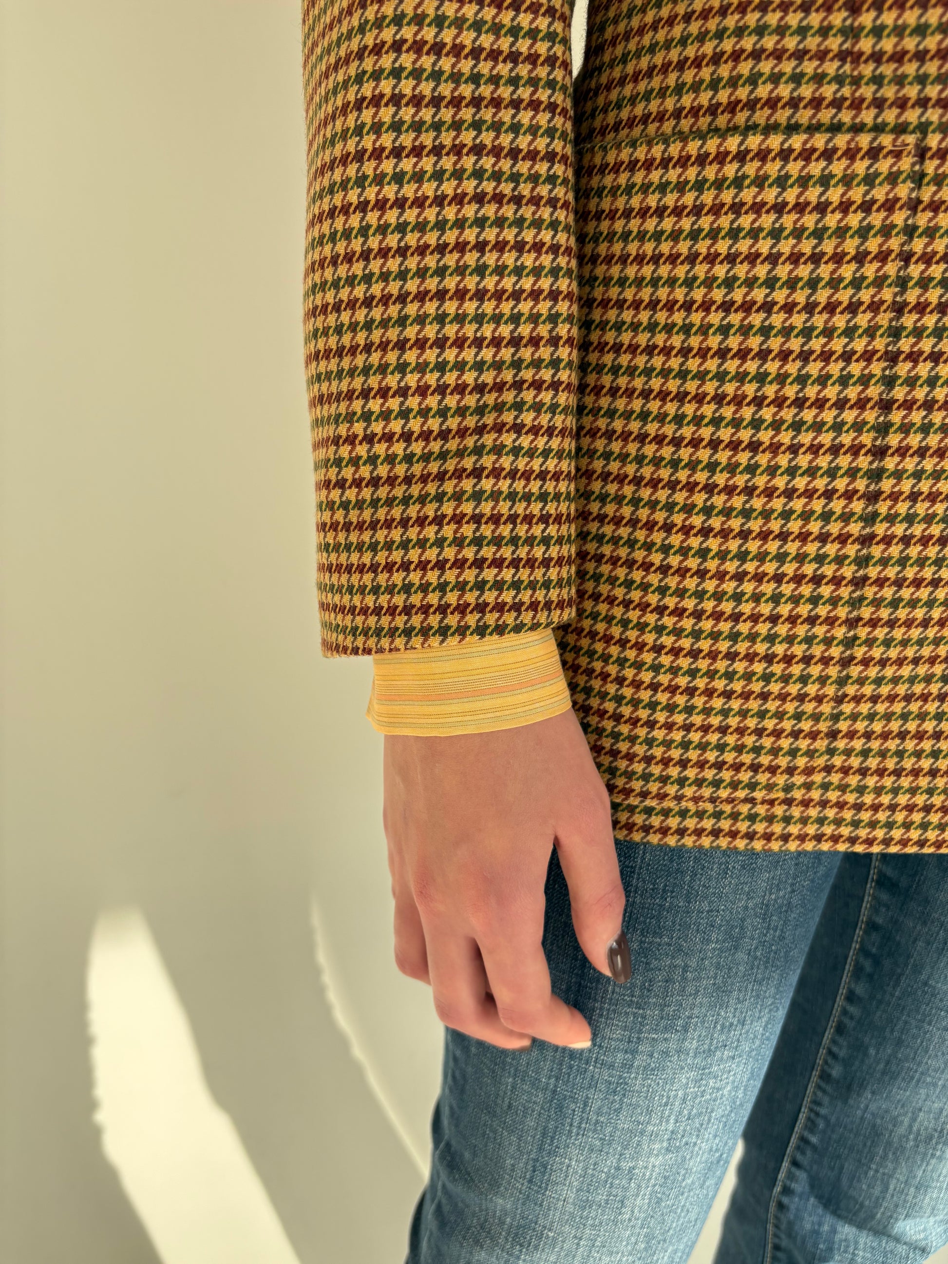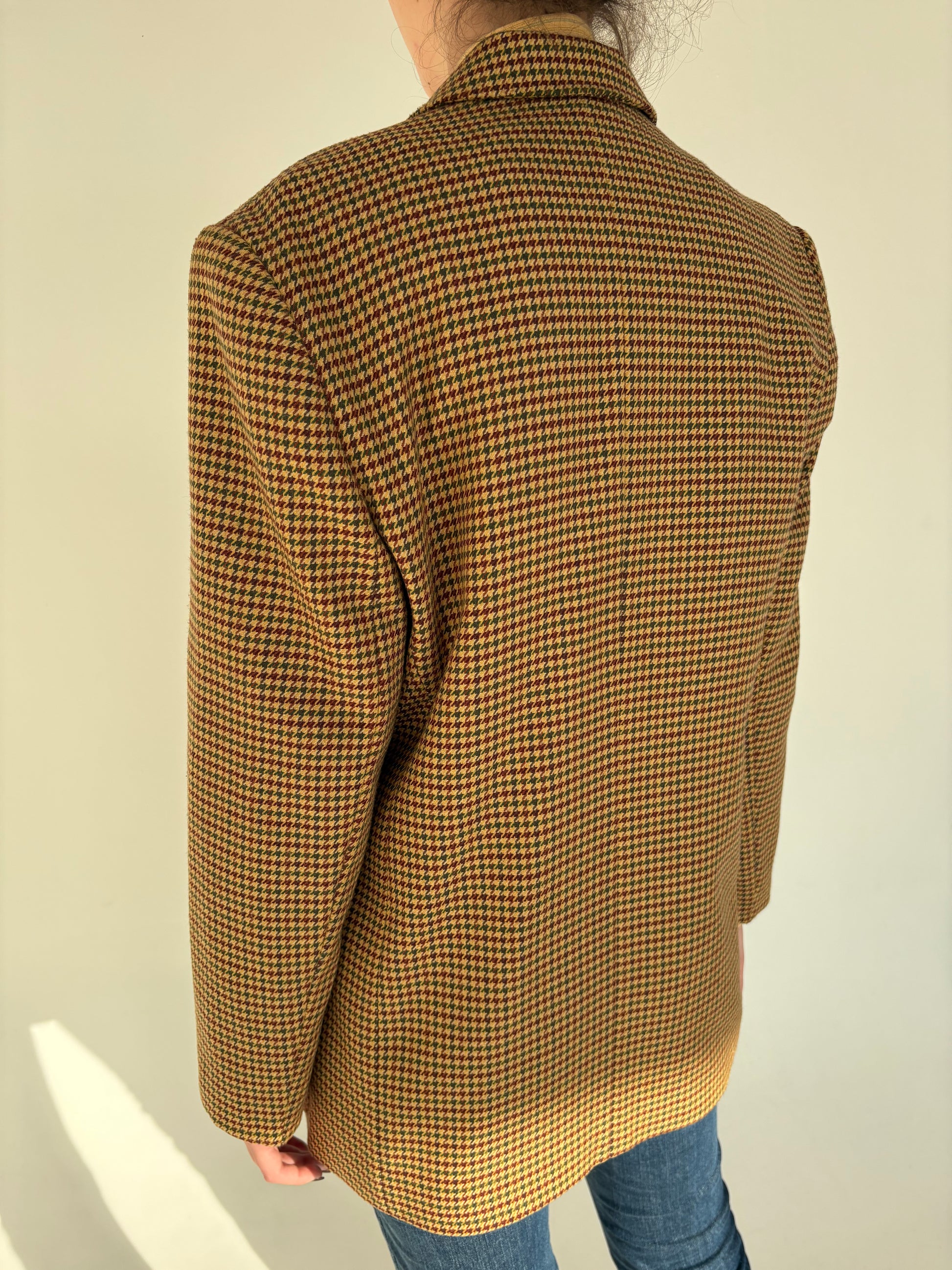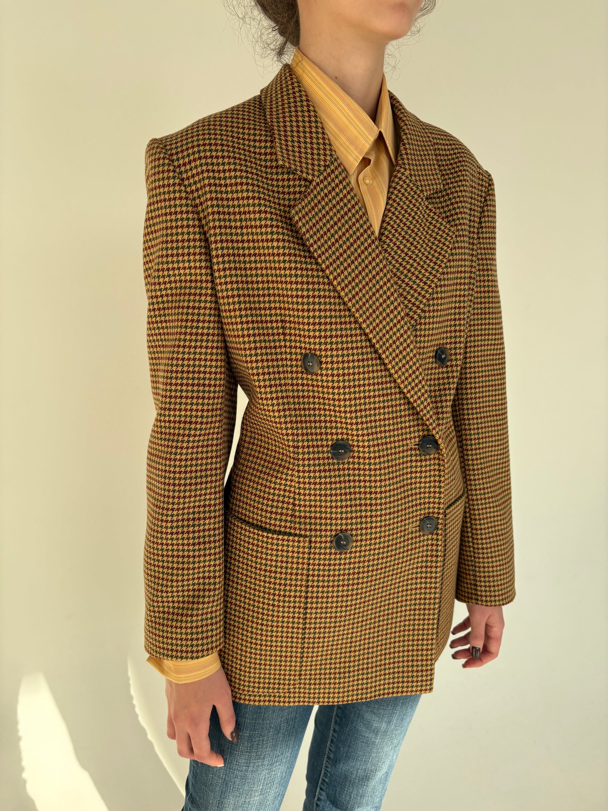 Sacou camel cu închidere dublă în carouri din tweed moale de lana