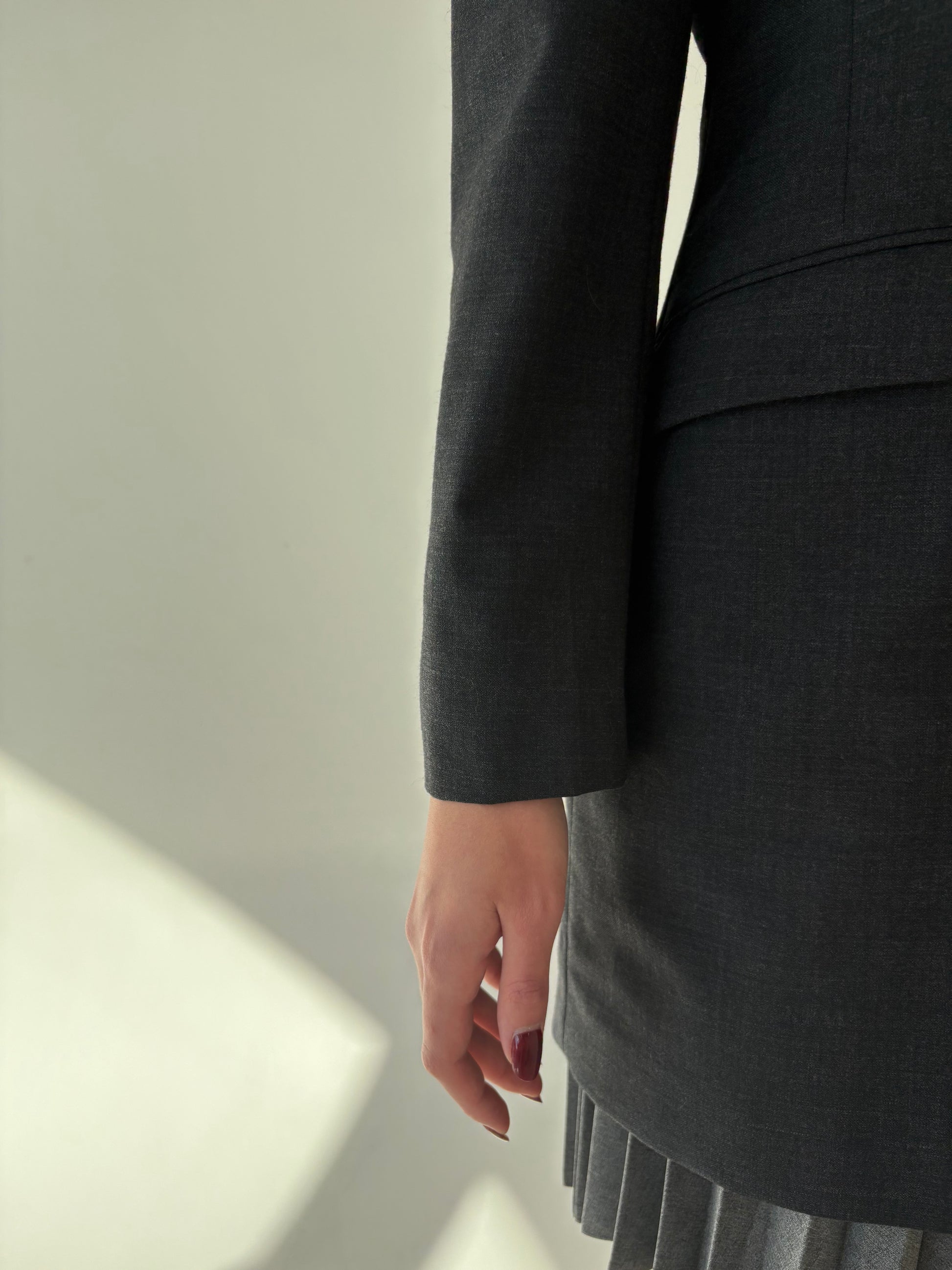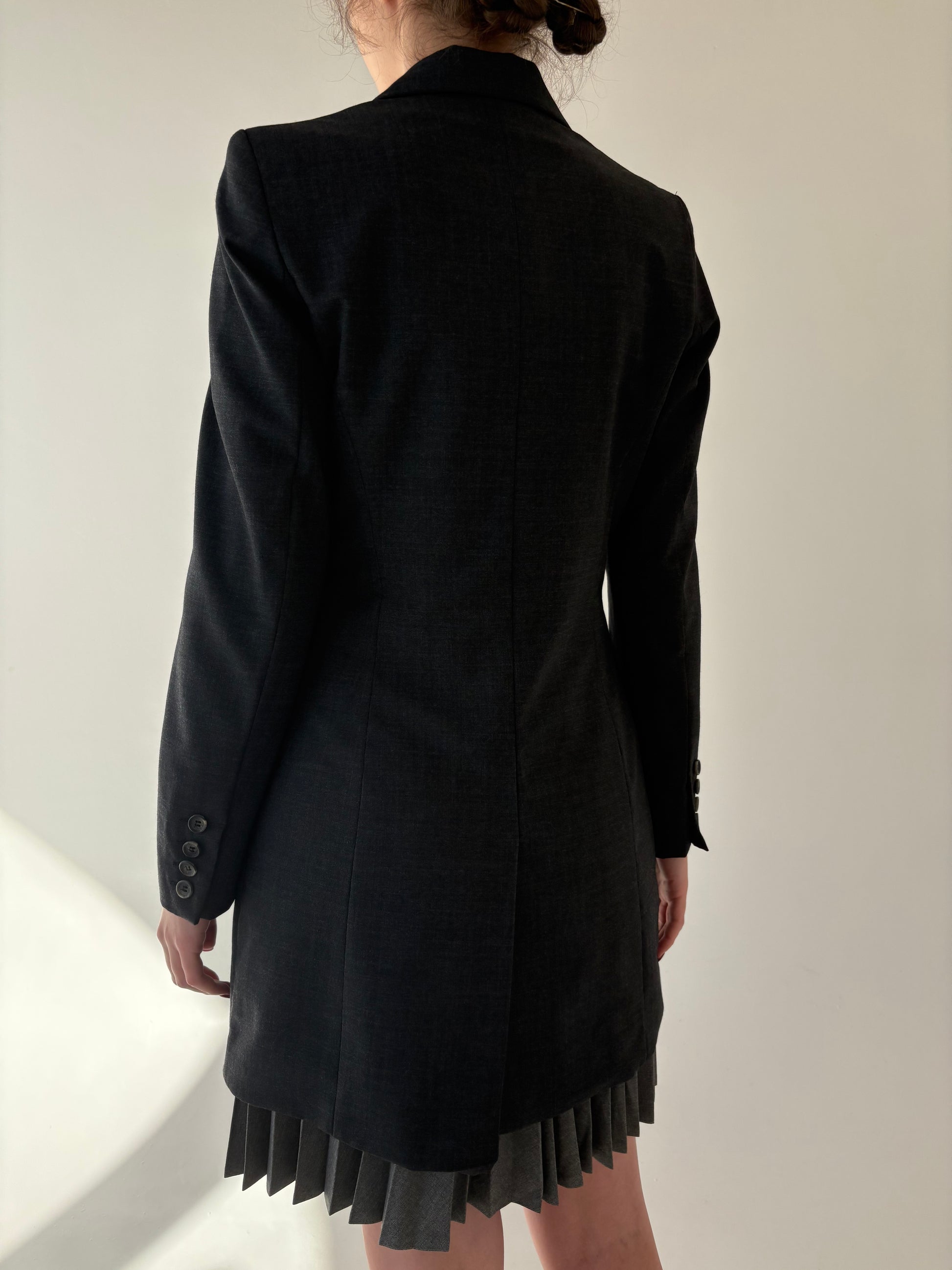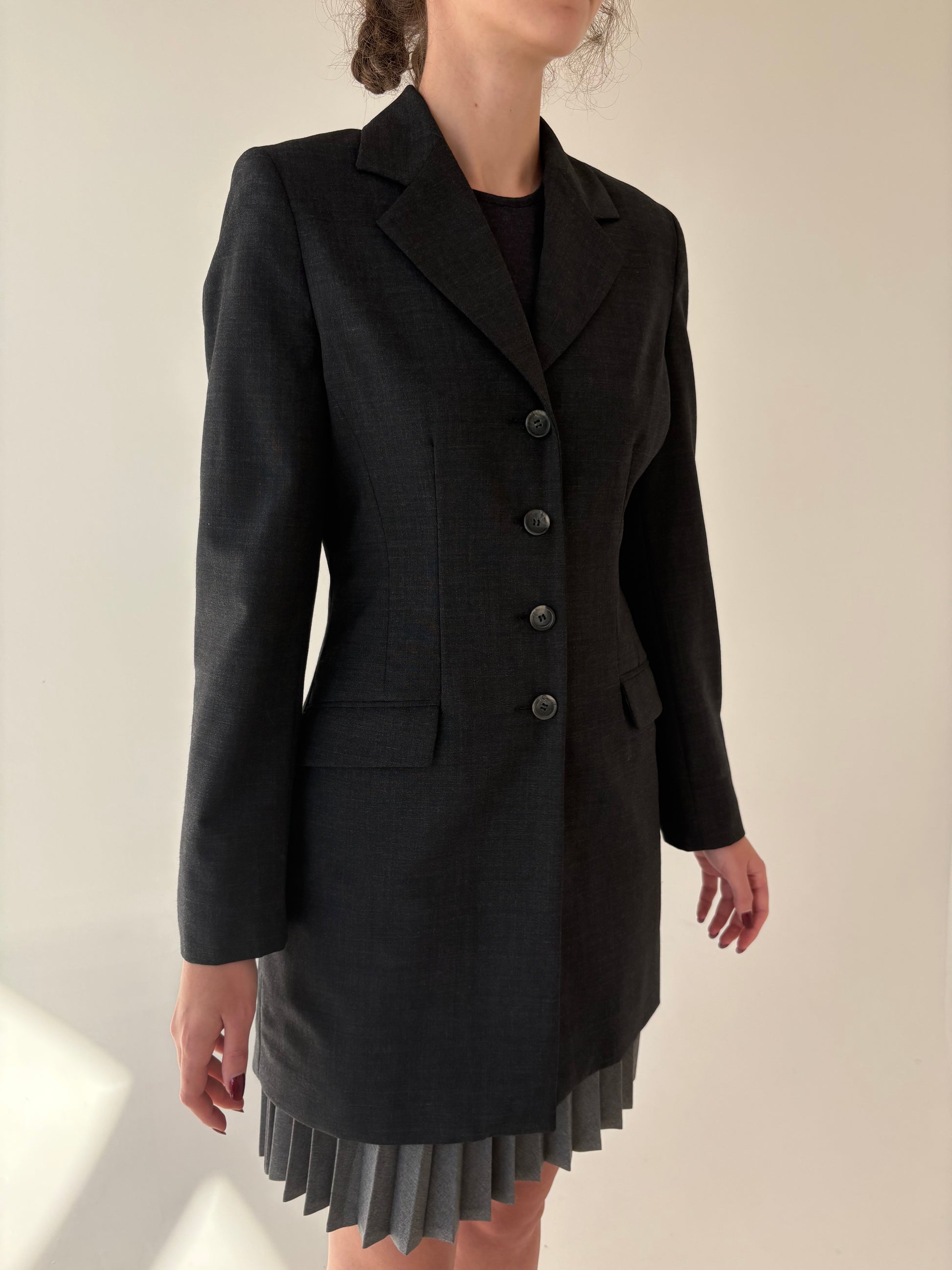 Sacou charcoal gray în croi lung ușor cambrat din lana extrafina