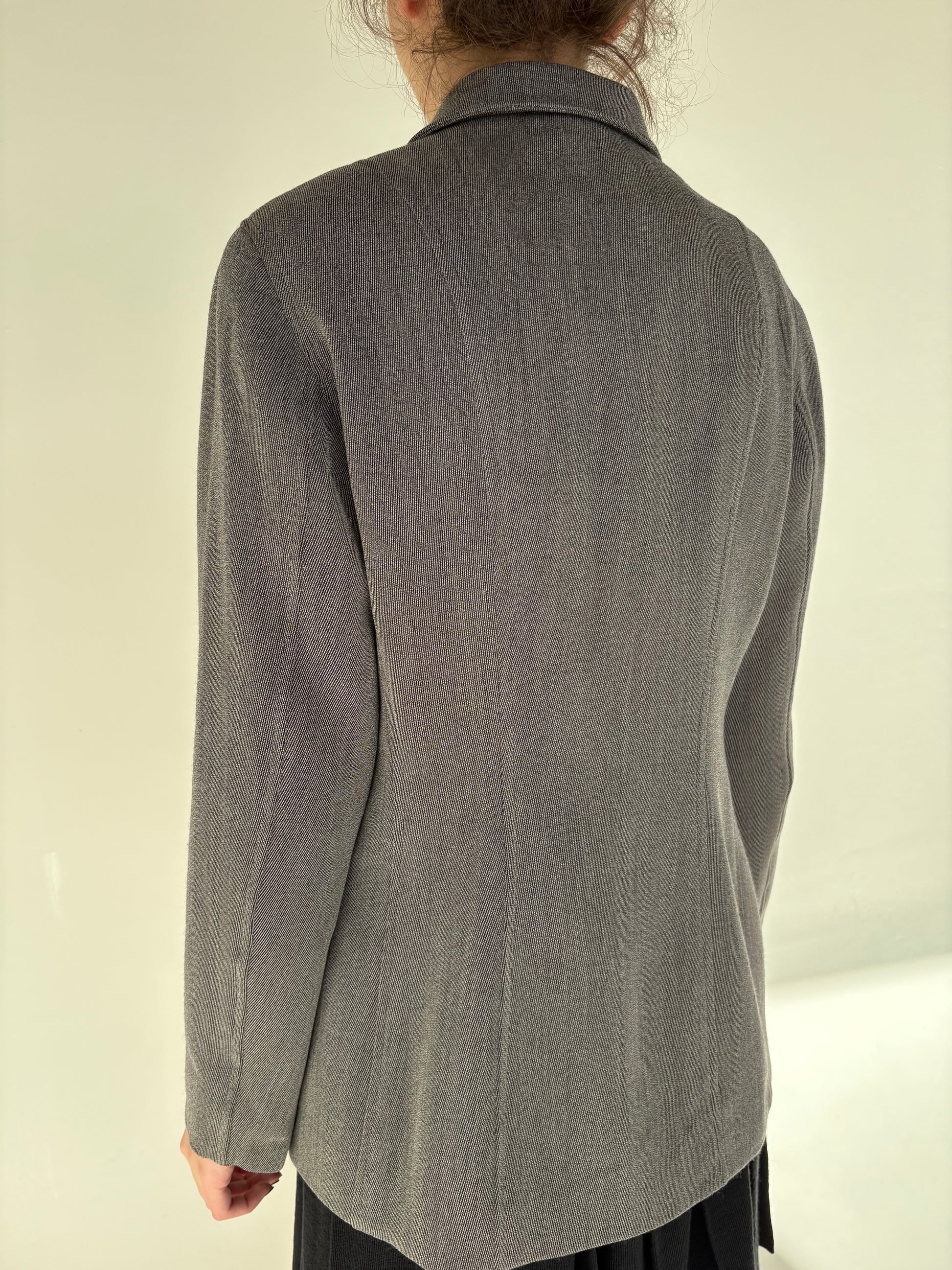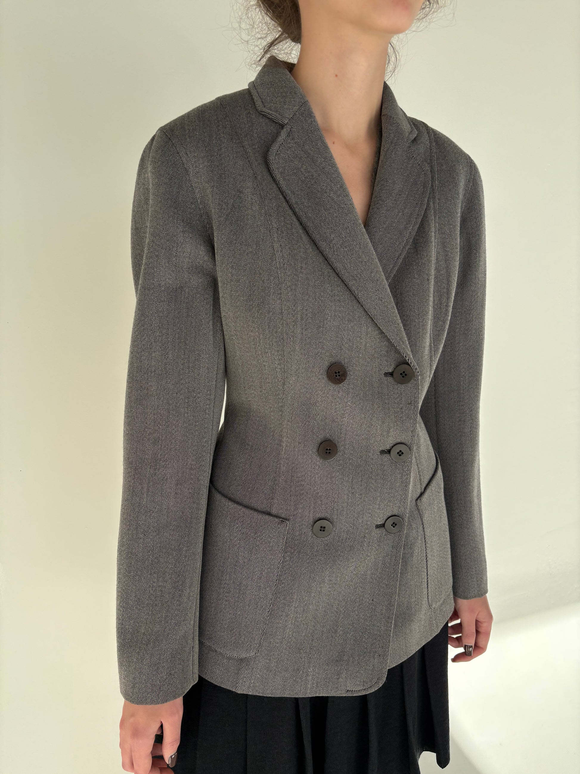 Croiul dublu rând de nasturi, umerii ușor structurați și lână virgină de calitate foarte înaltă corespund perfect cu sacourile Max Mara din perioada aceea.