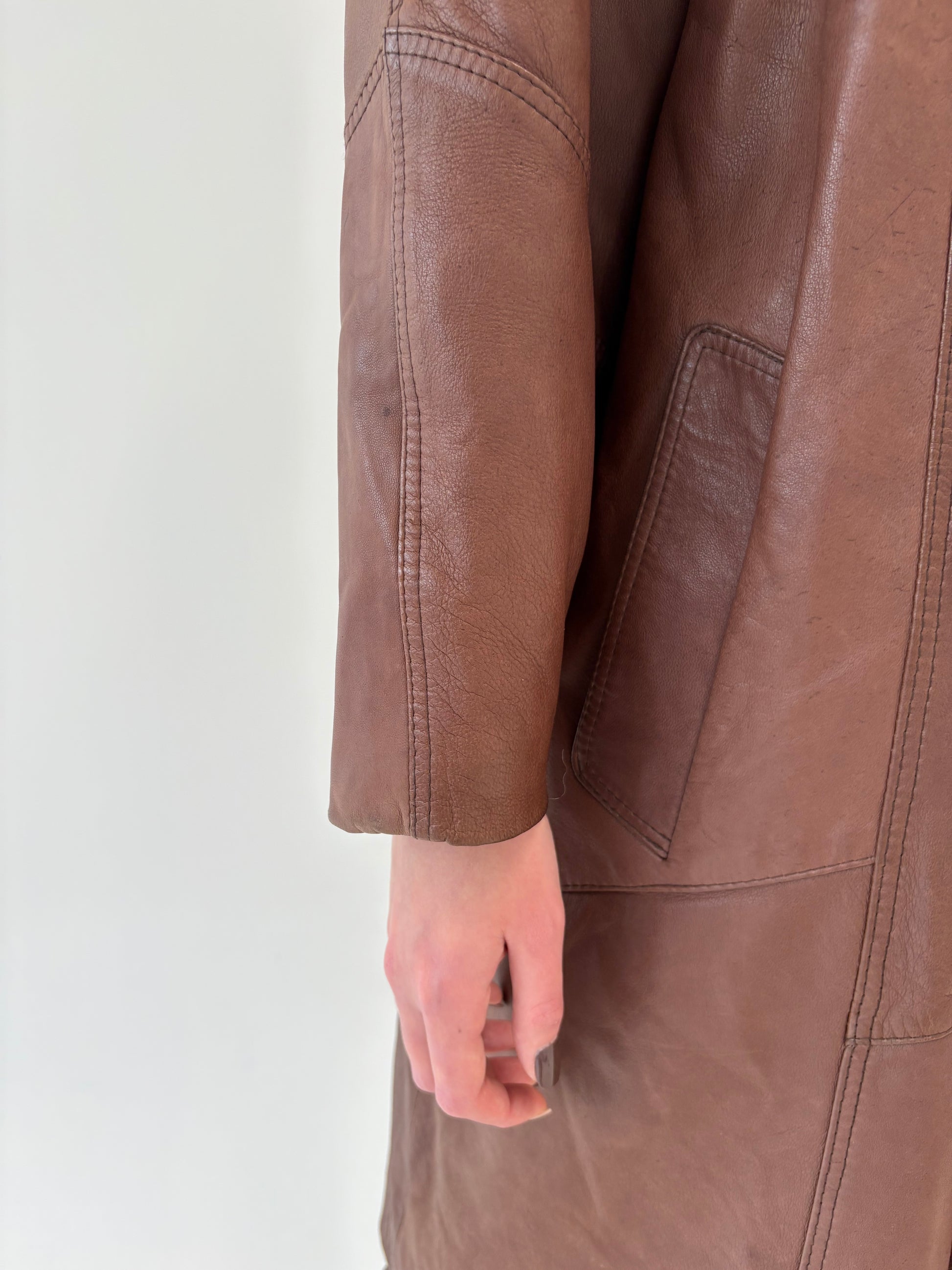 Pardesiu vintage chocolate brown petite în croi drapat din piele naturală