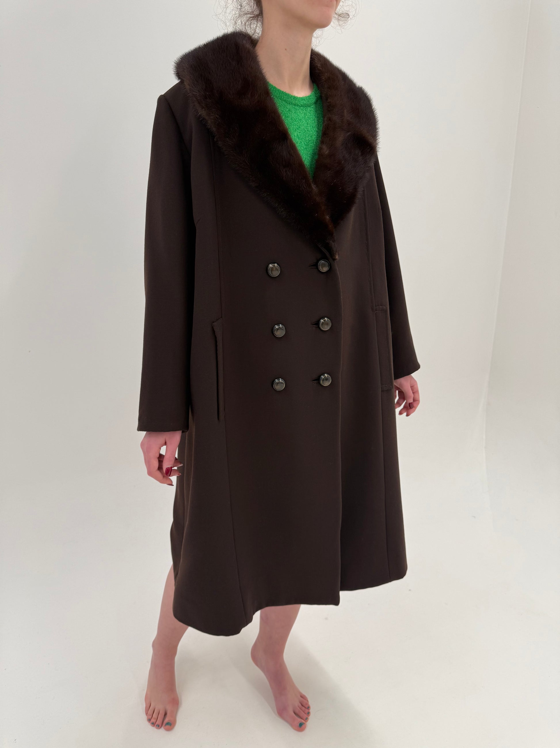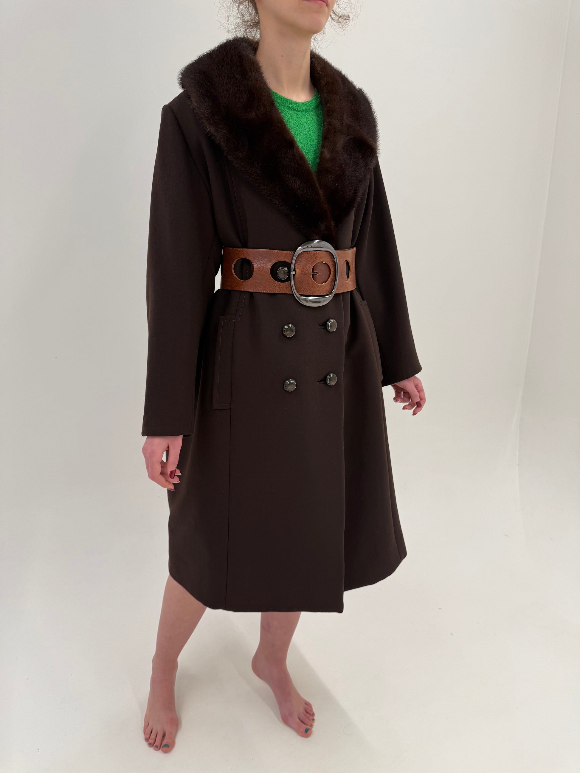 Palton vintage din stofă structurată chocolate brown cu guler din blană de nurcă