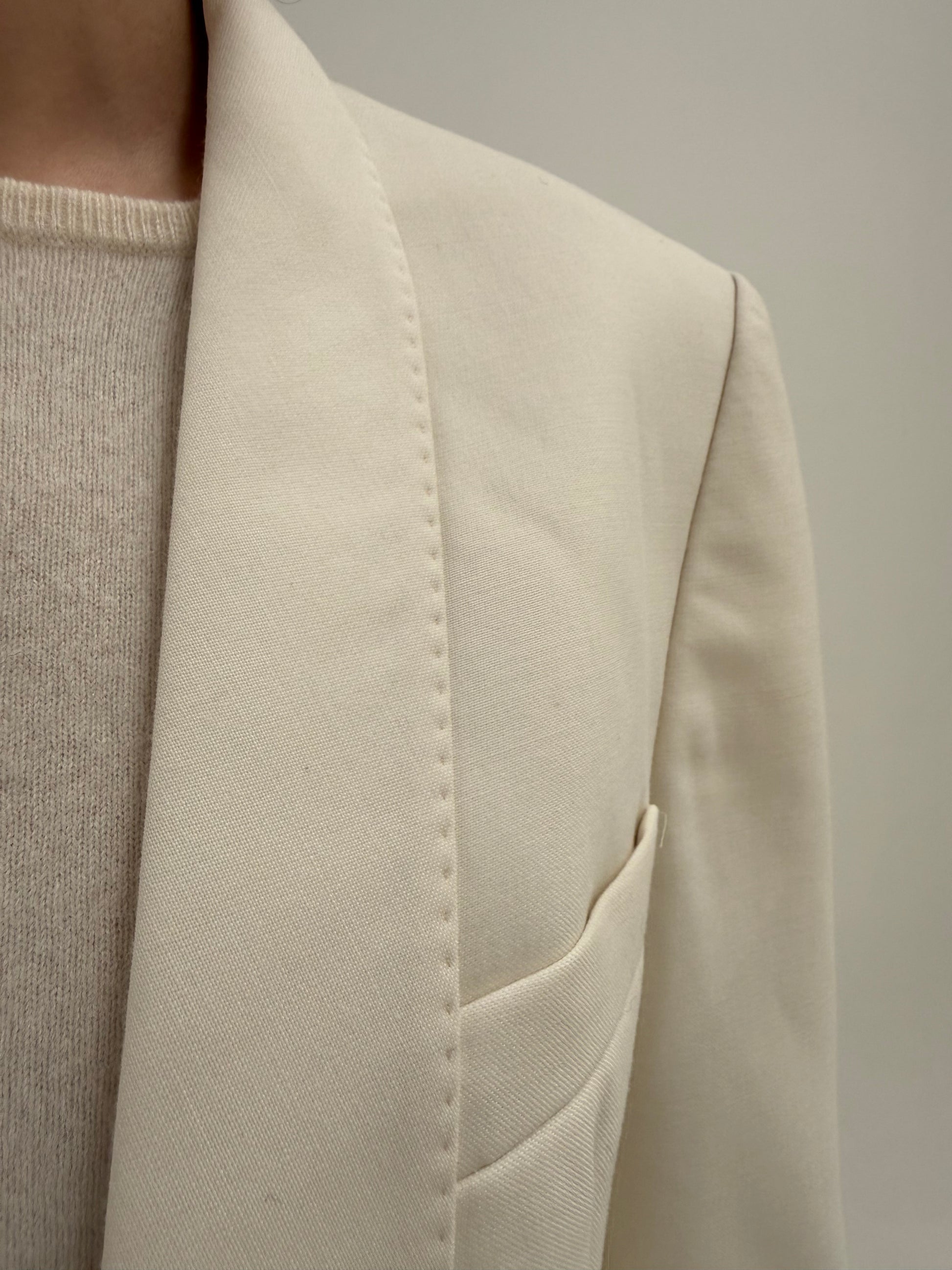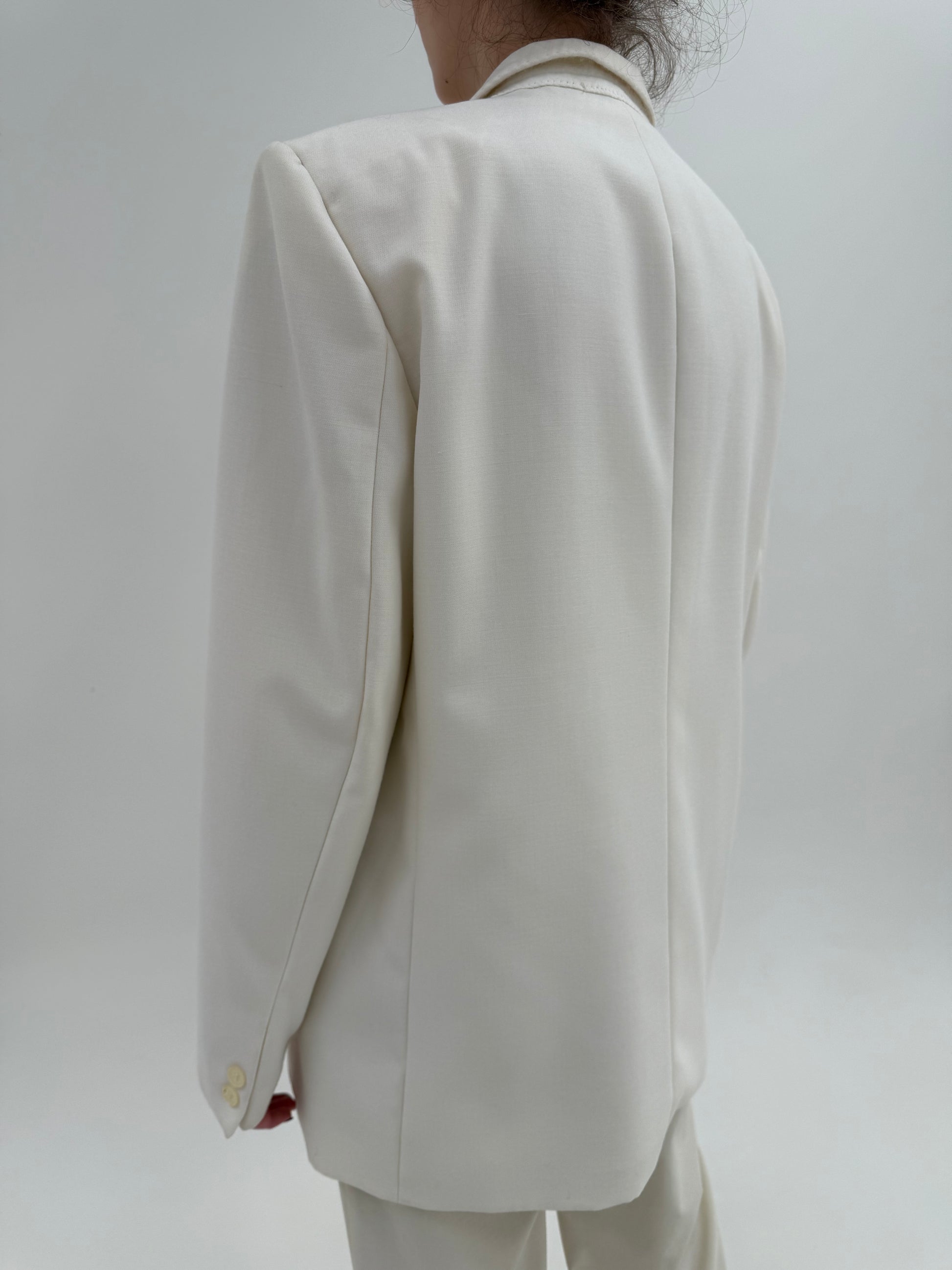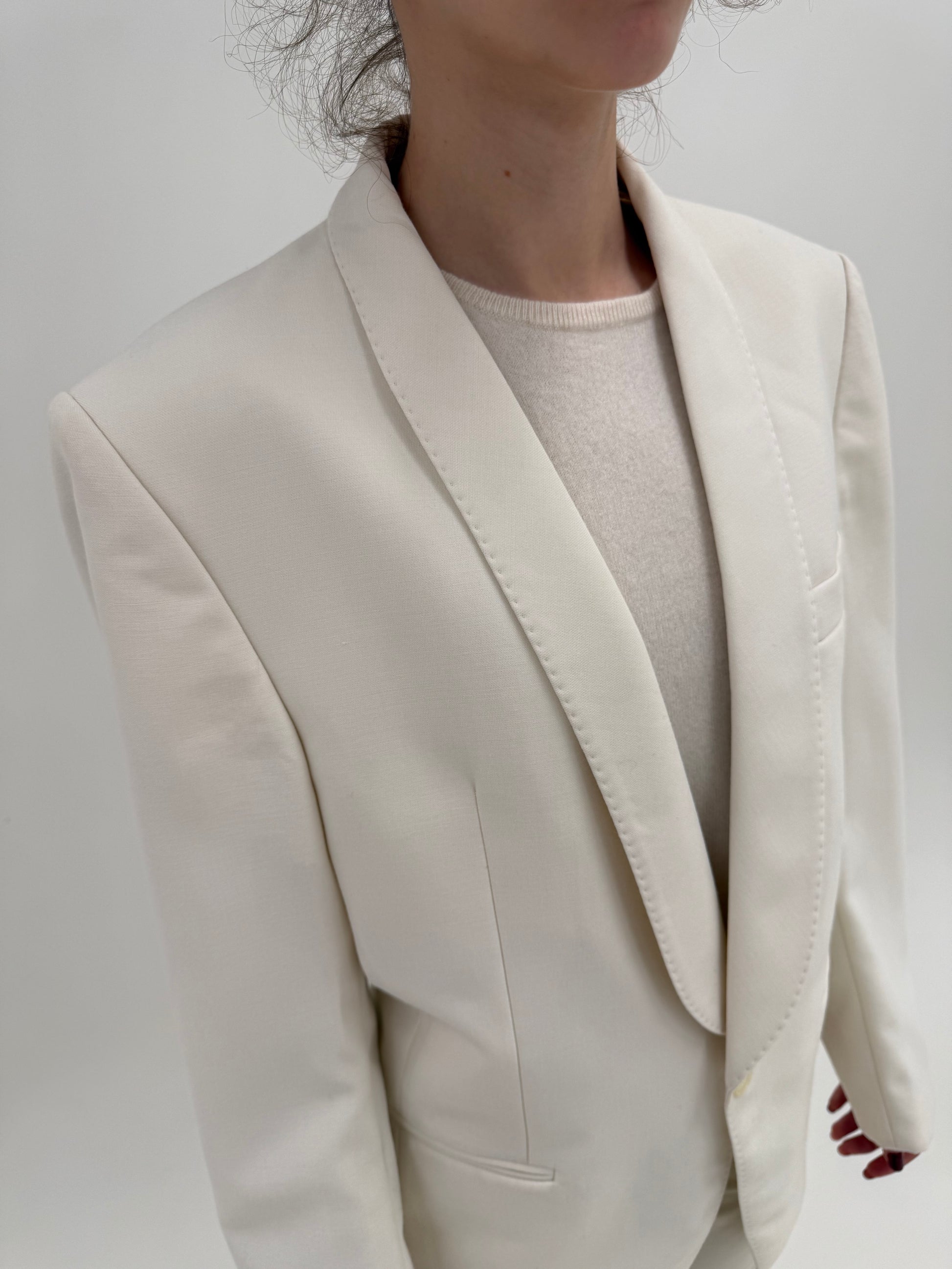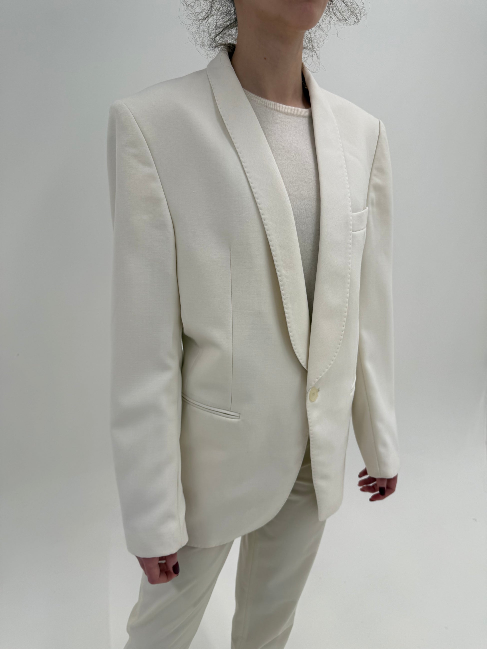 Smoking alb din lana extrafina structurată cu revere rotunjite