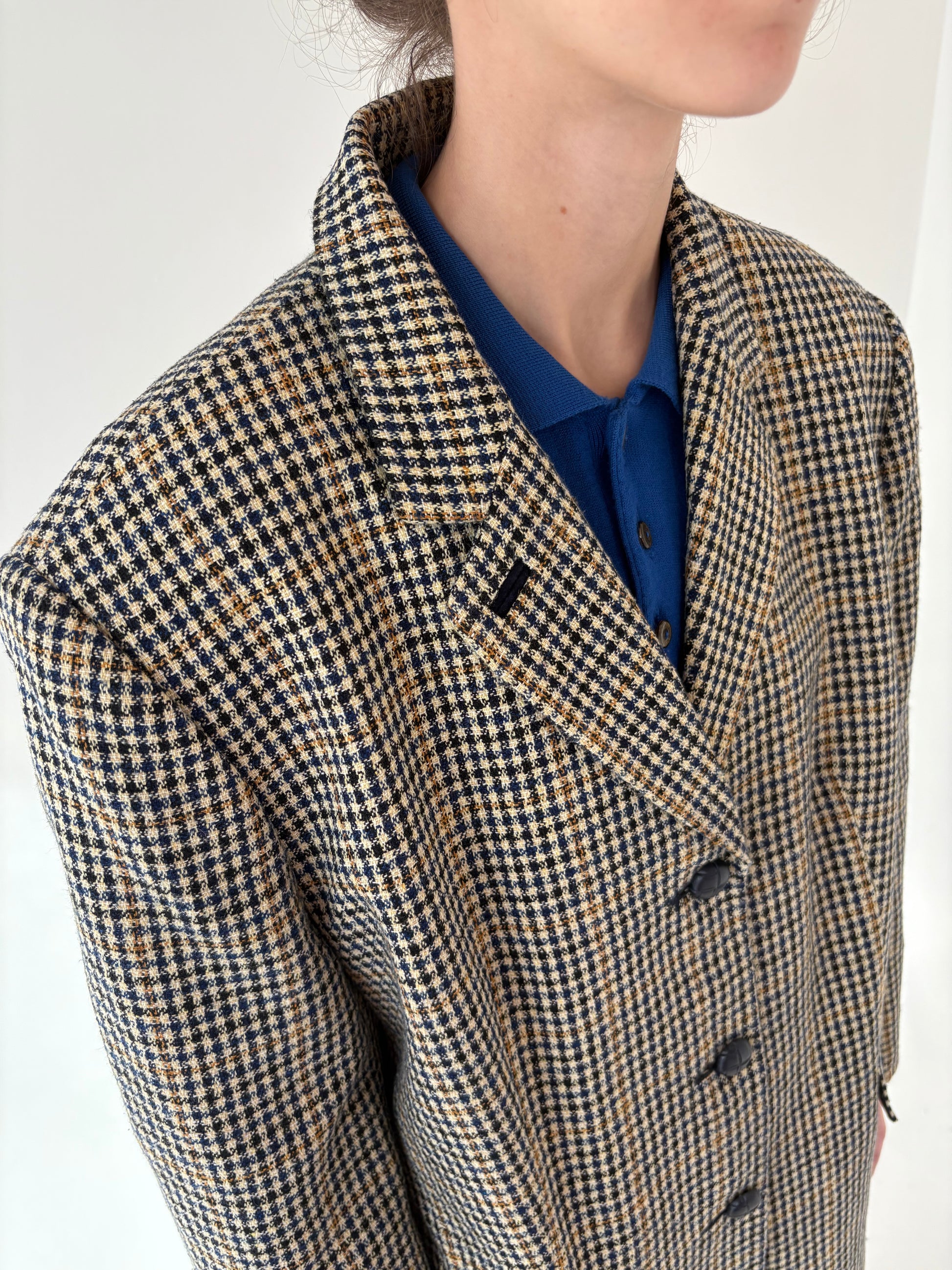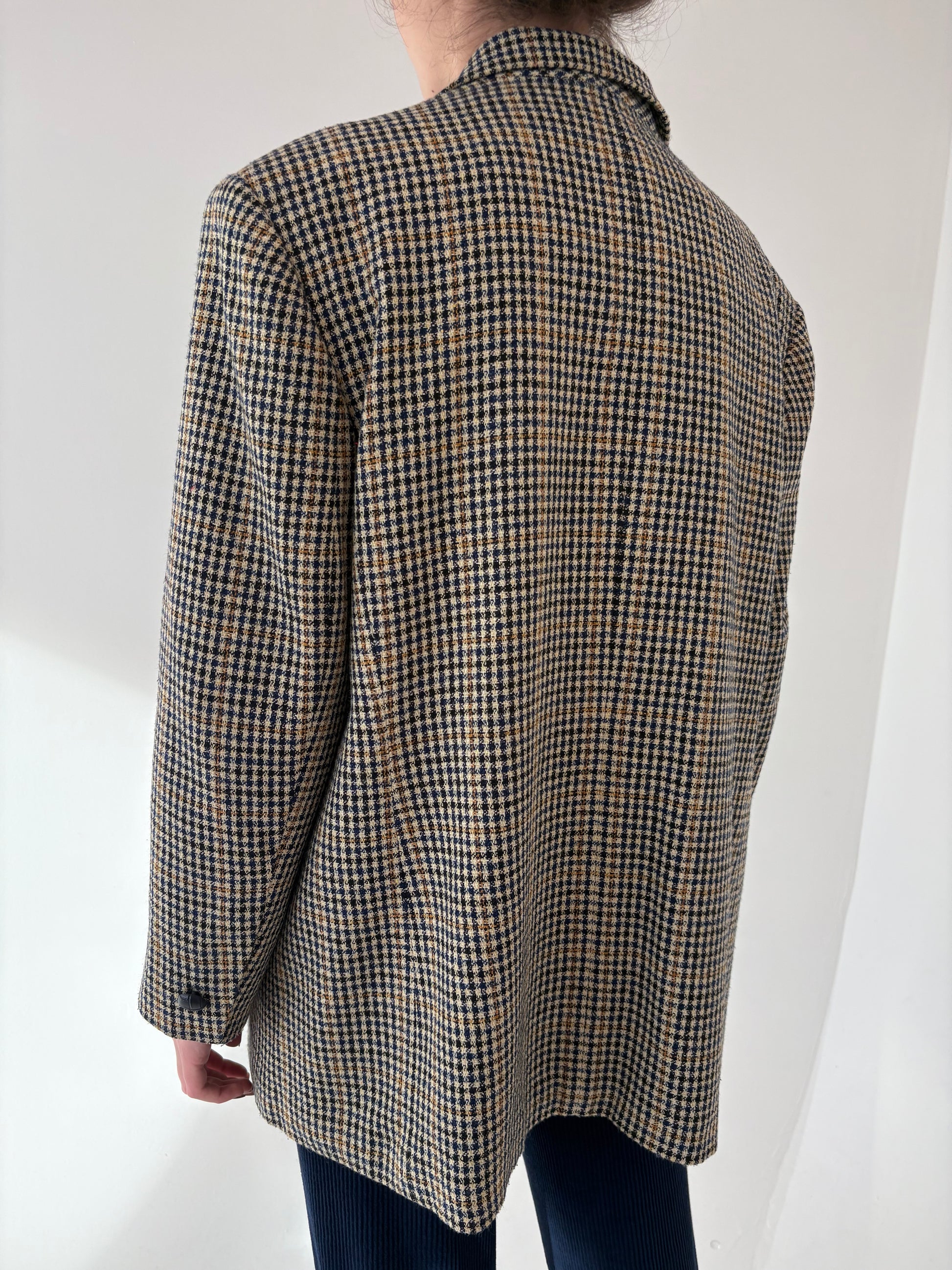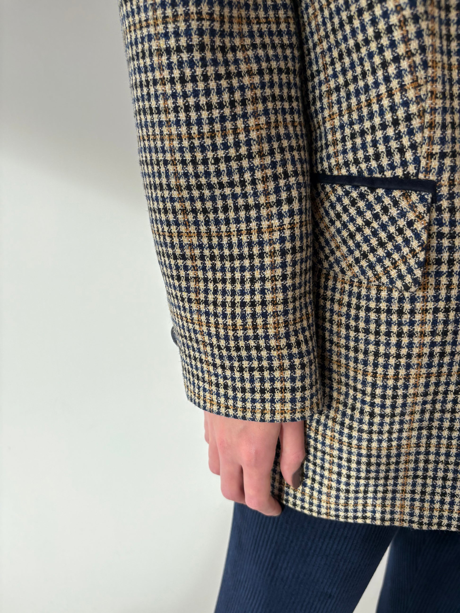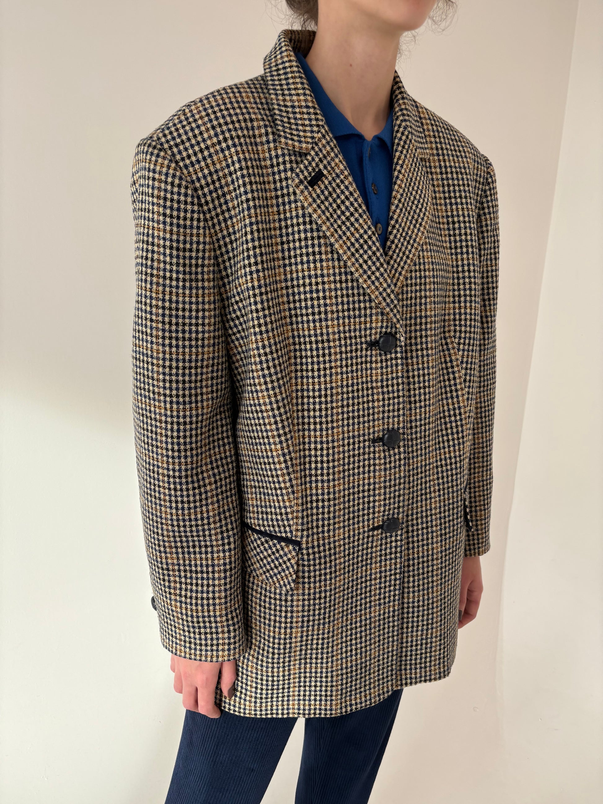Sacou camel din lana plină în căruței și combinație clasică de culori