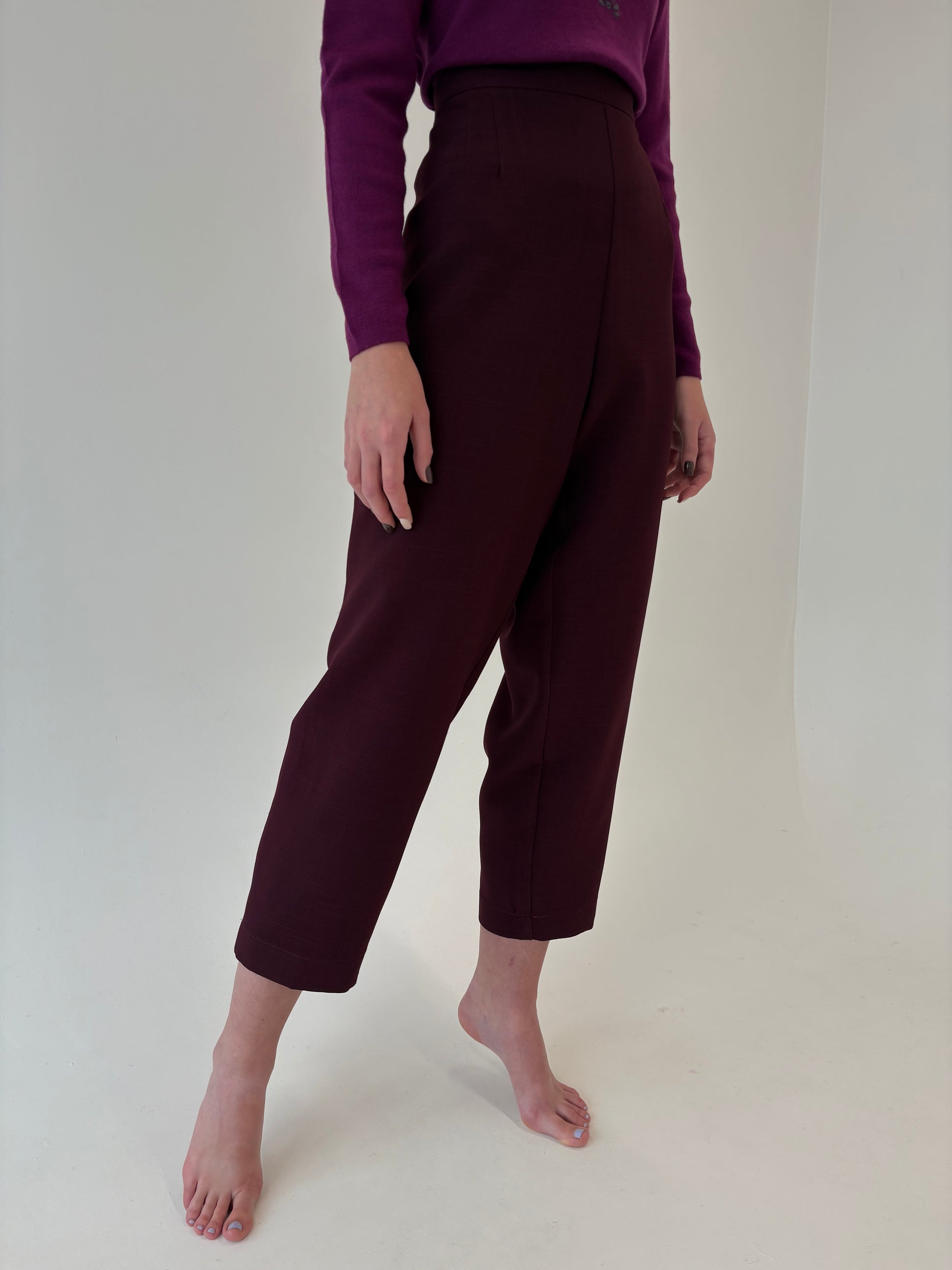 Pantaloni țigaretă dark burgundy din mix de lana extrafina cu talie ultra înaltă