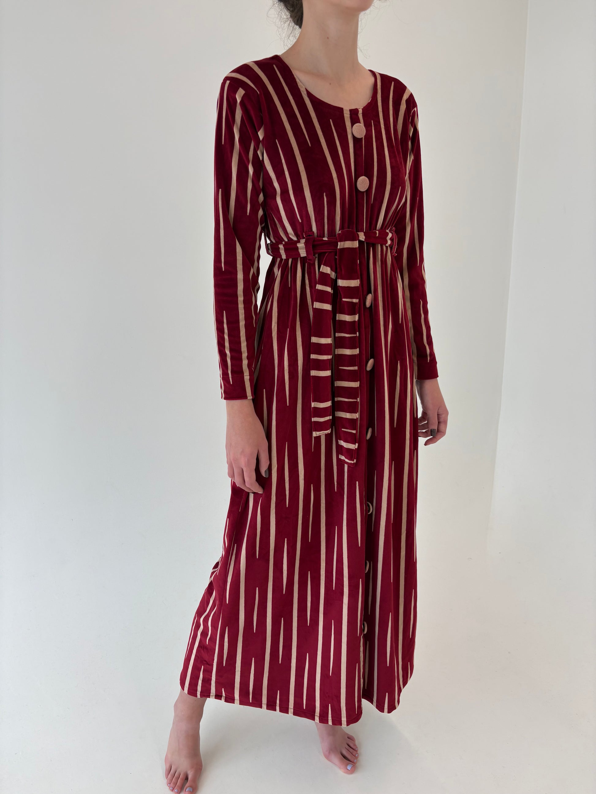 Rochie maxi din catifea burgundy cu dungi verticale camel și talie marcată