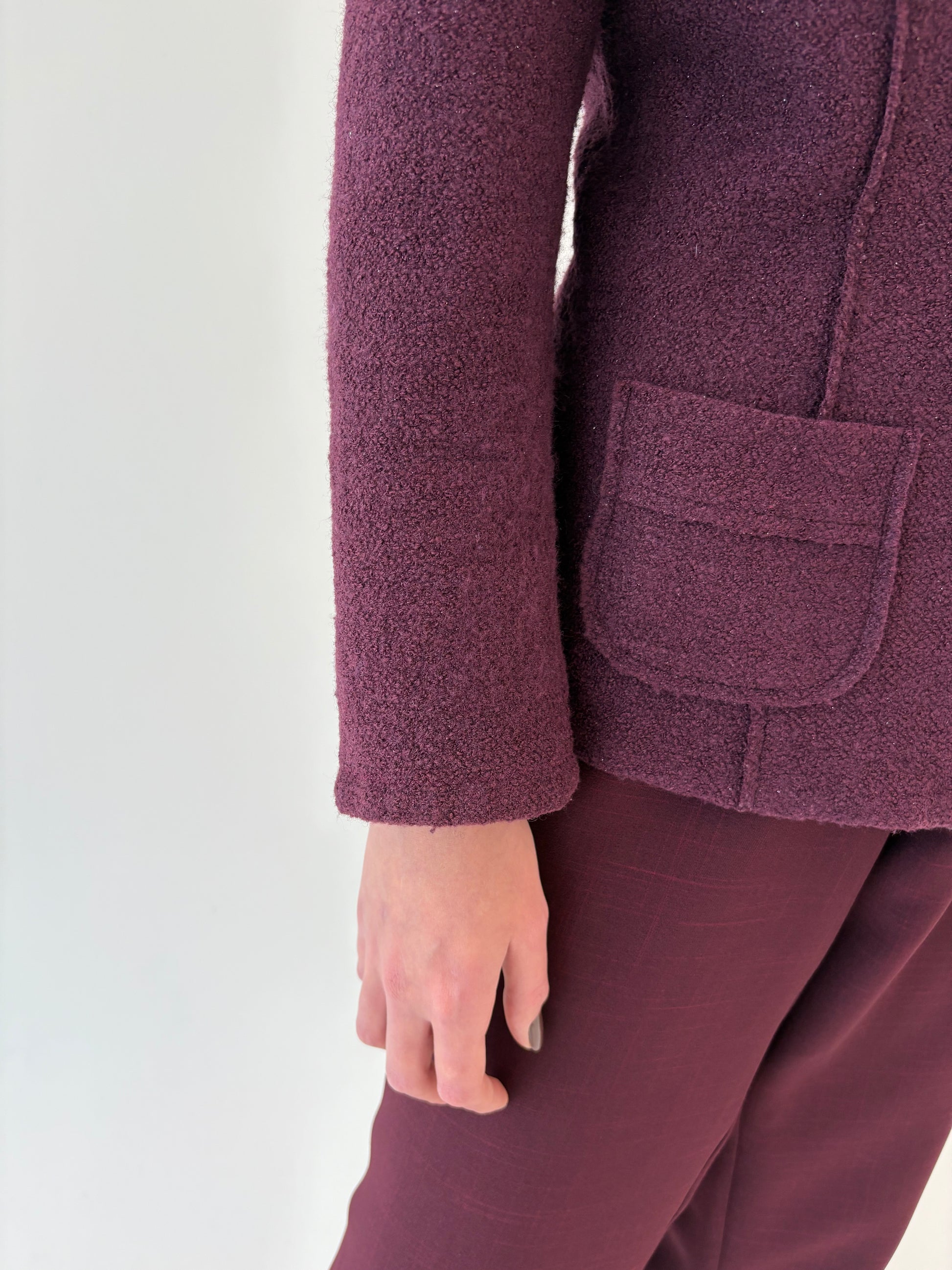 Sacou dark burgundy cambrat din boiled wool cu inserții extrafine de lurex