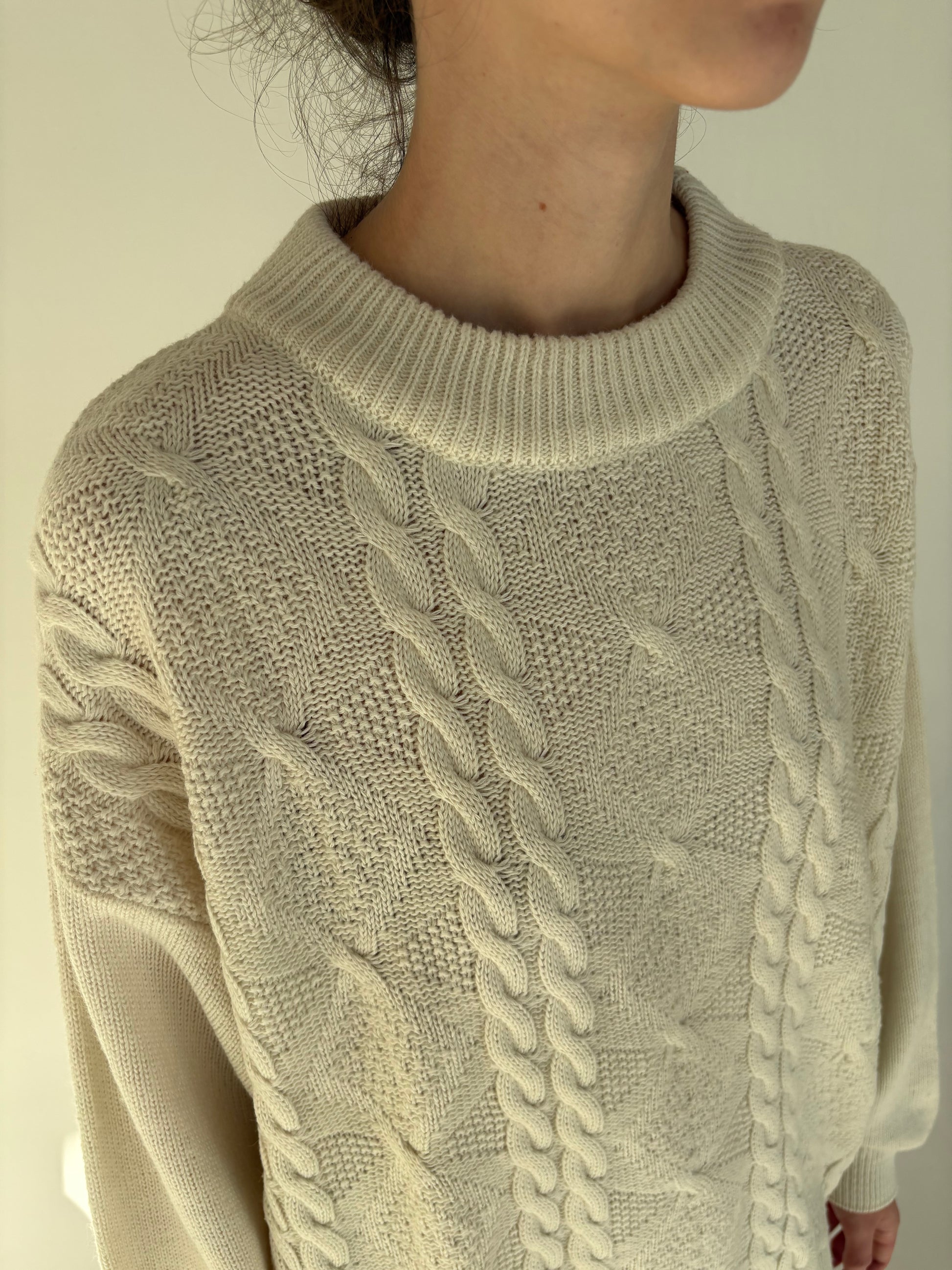 Pulover super gros butter white cu torsade din lana extrafina în croi lejer