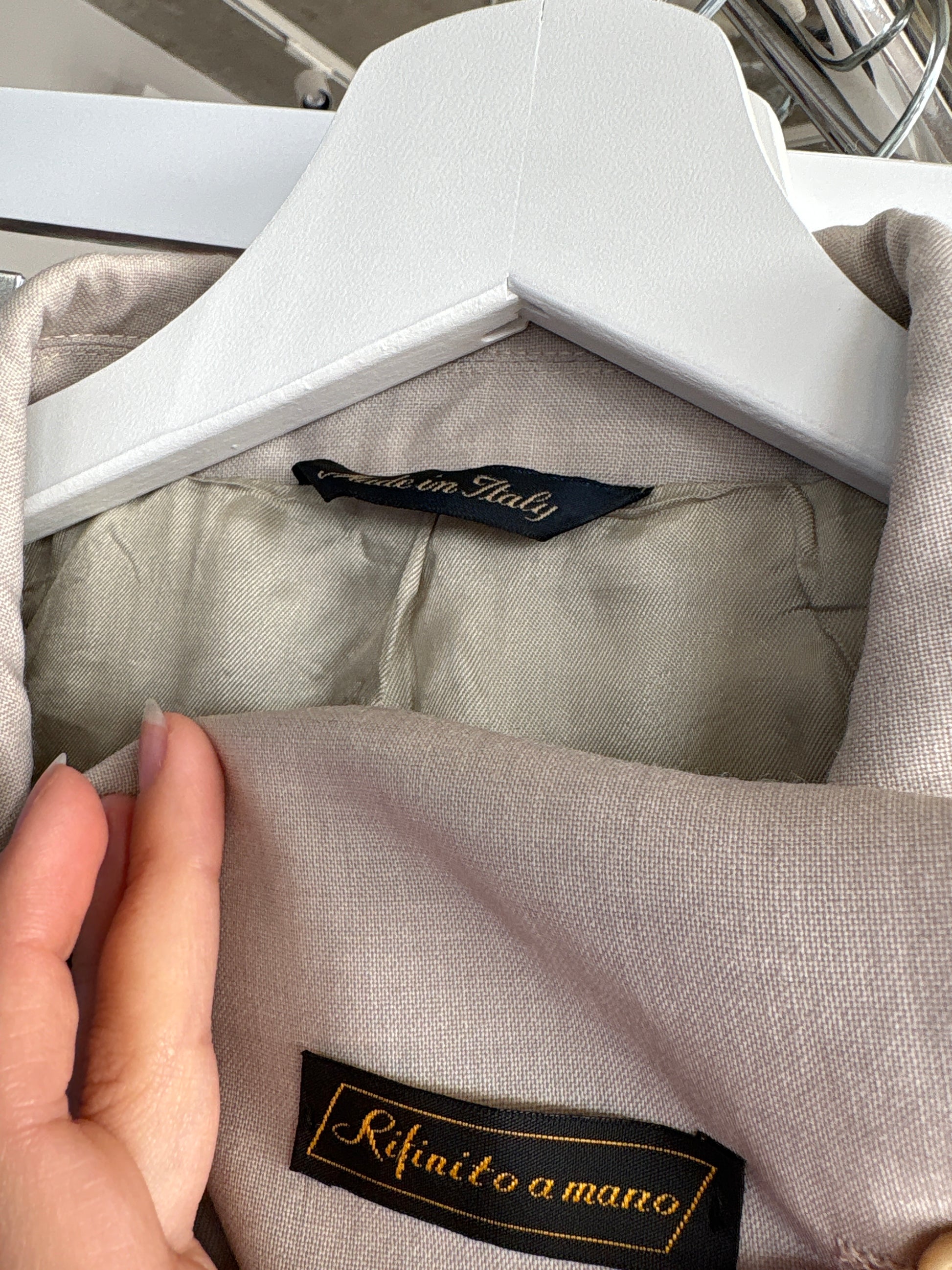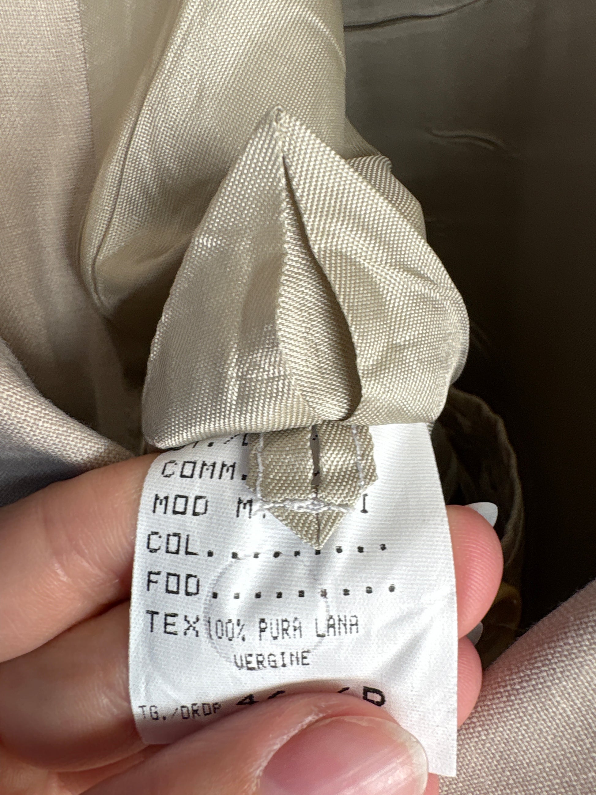finisat manual - pe sacourile italiene această mențiune arată că anumite detalii (margini, butoniere, cusături) au fost lucrate manual, nu doar la mașină, ceea ce indică un nivel mai înalt de calitate și artizanat.
