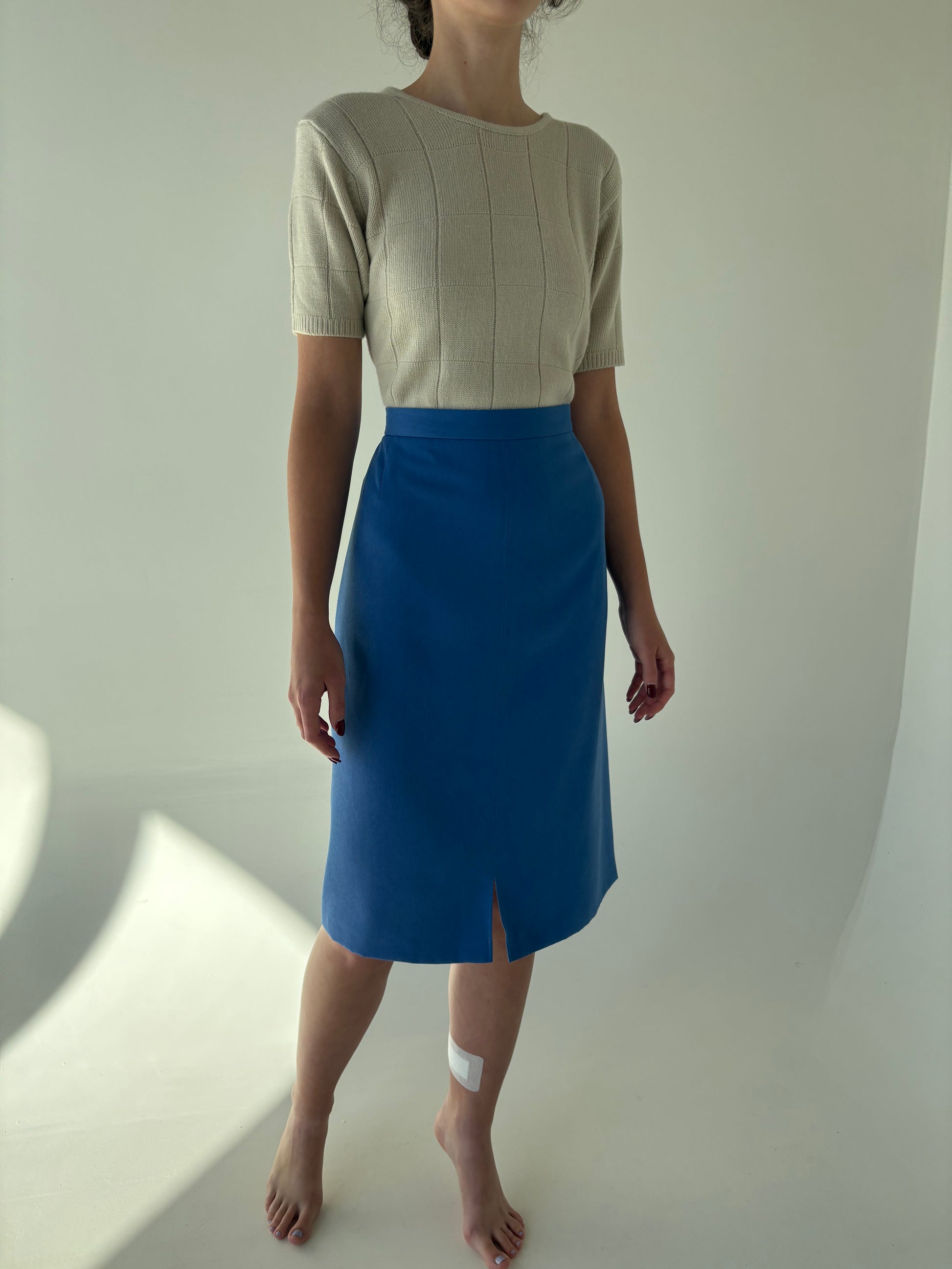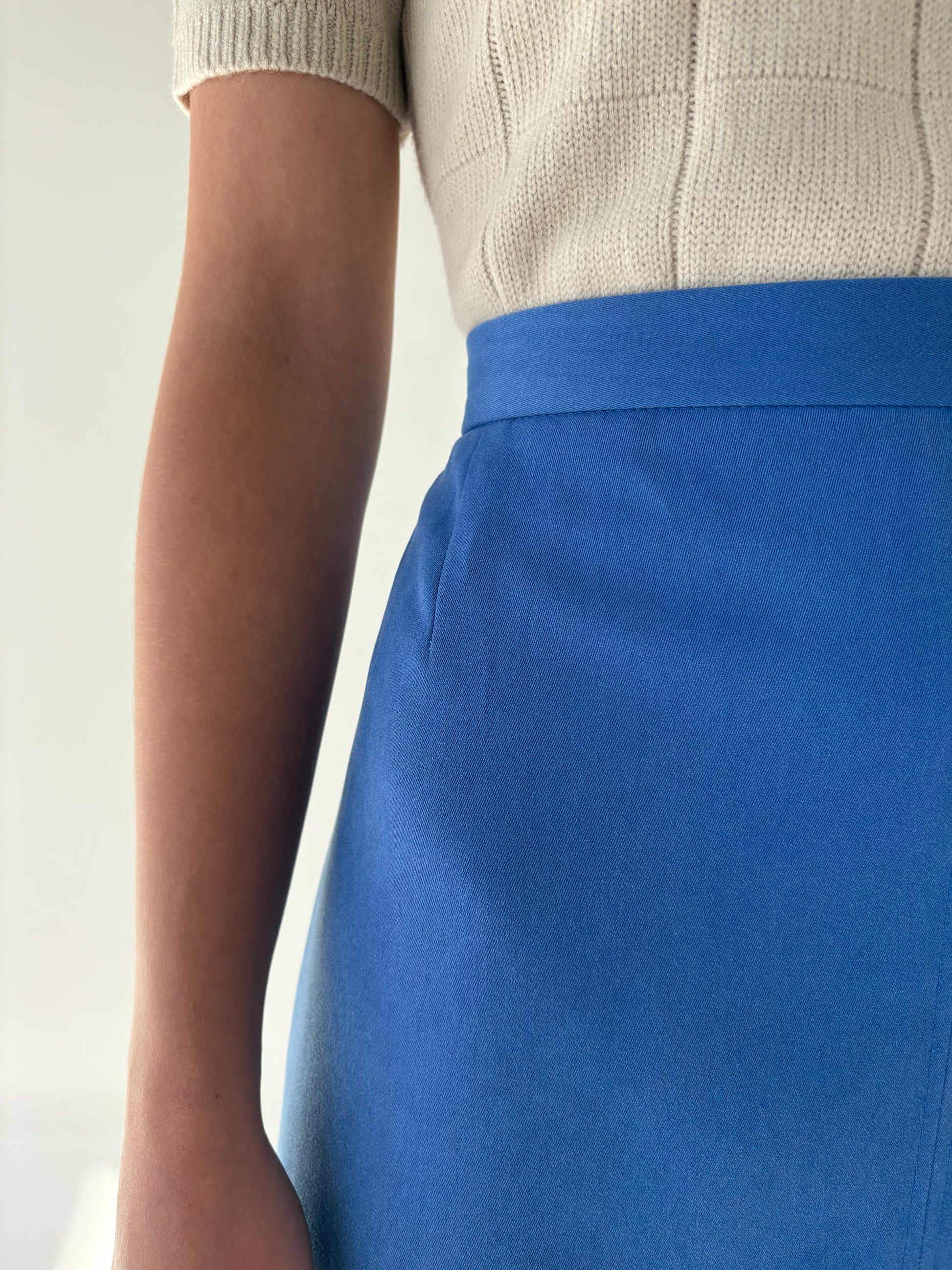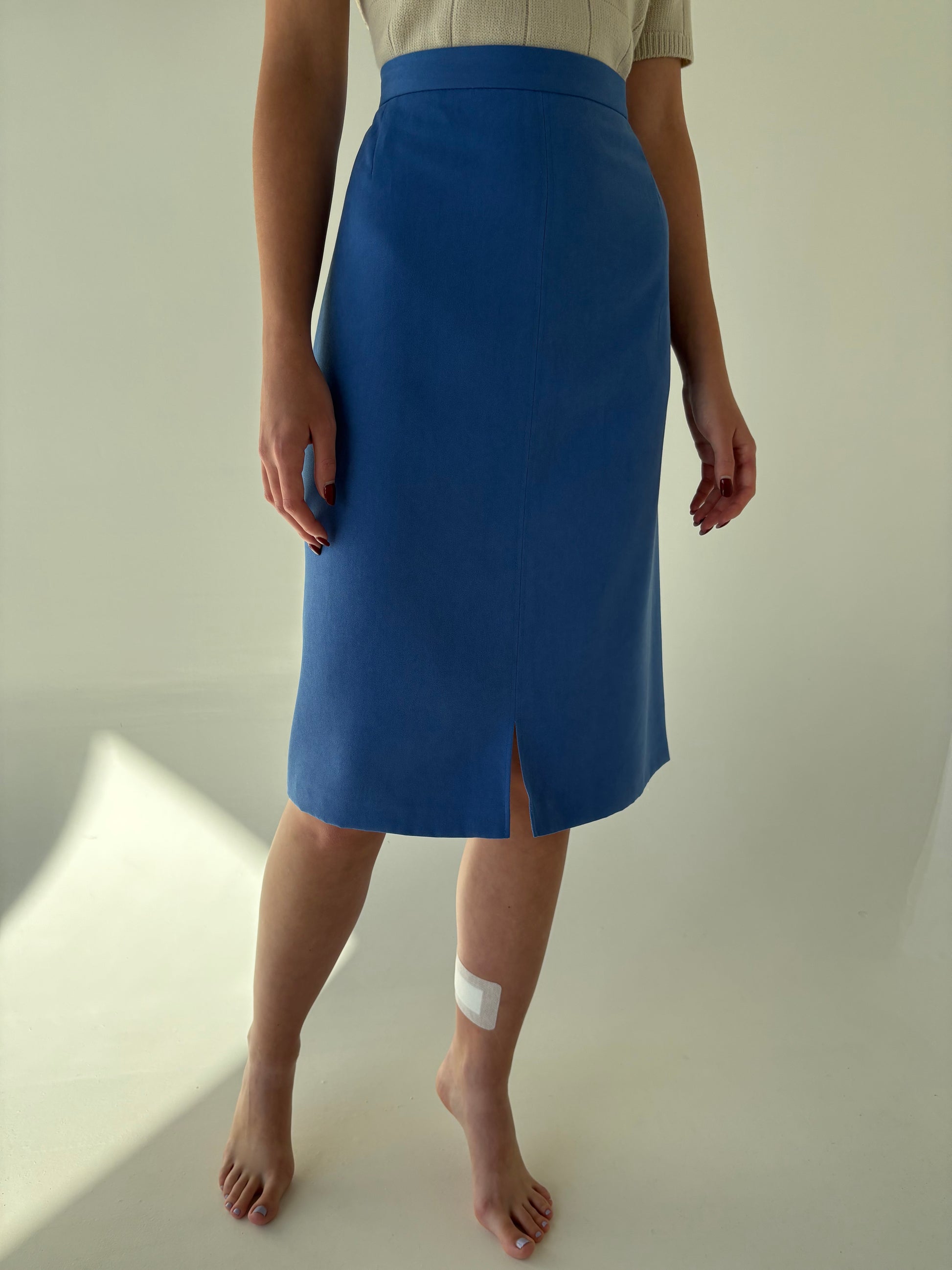 Fustă midi albastru ciel cu talie ultra înaltă și aspect de piele întoarsă