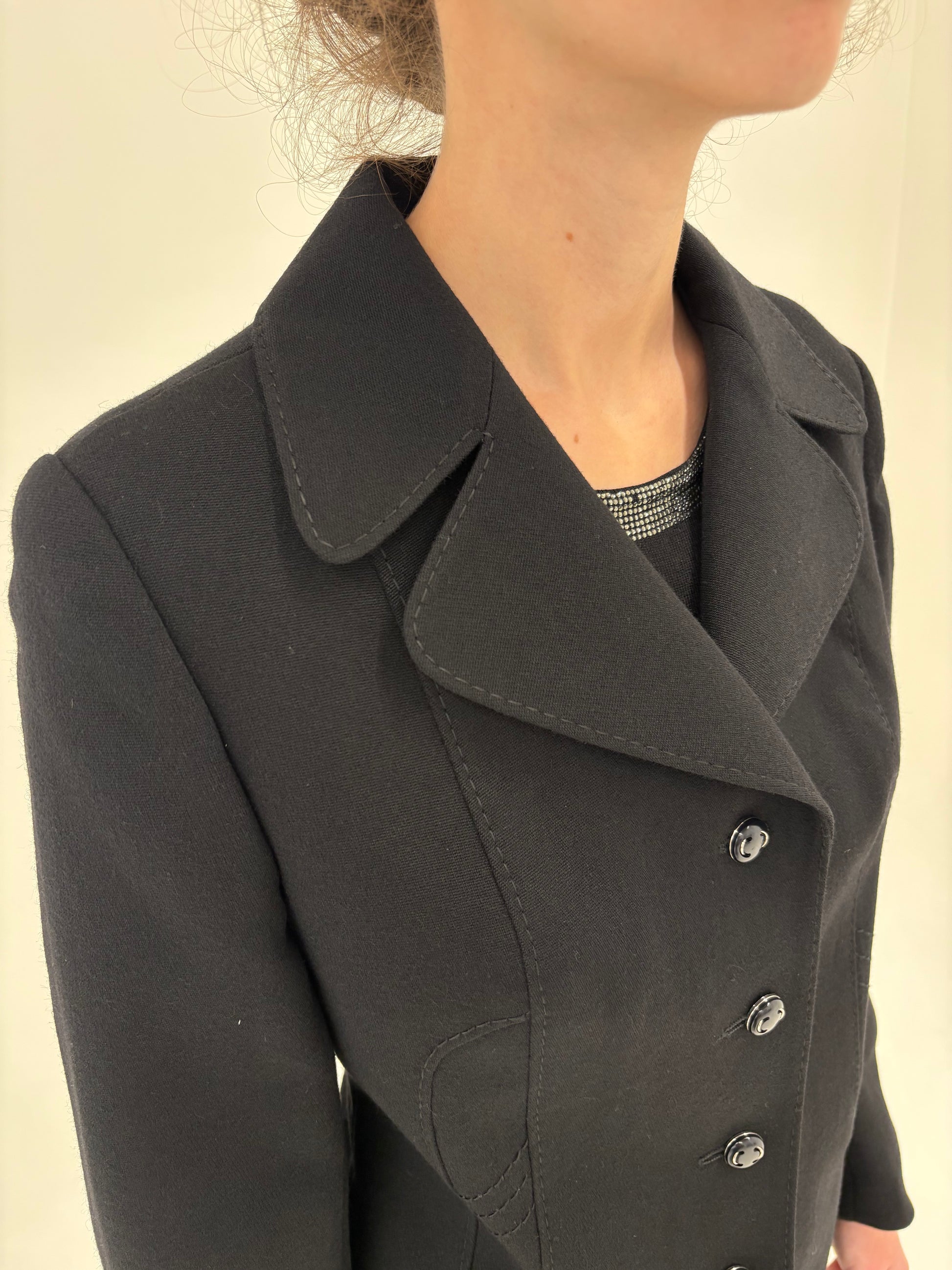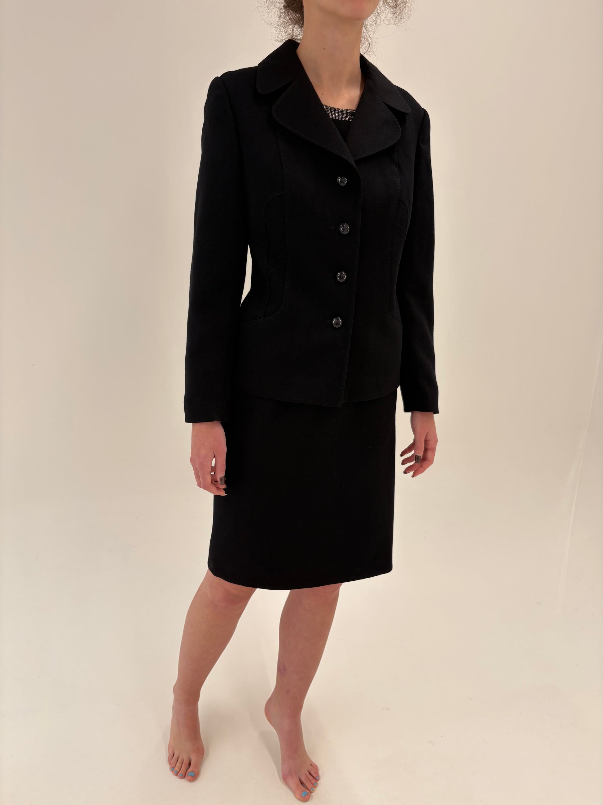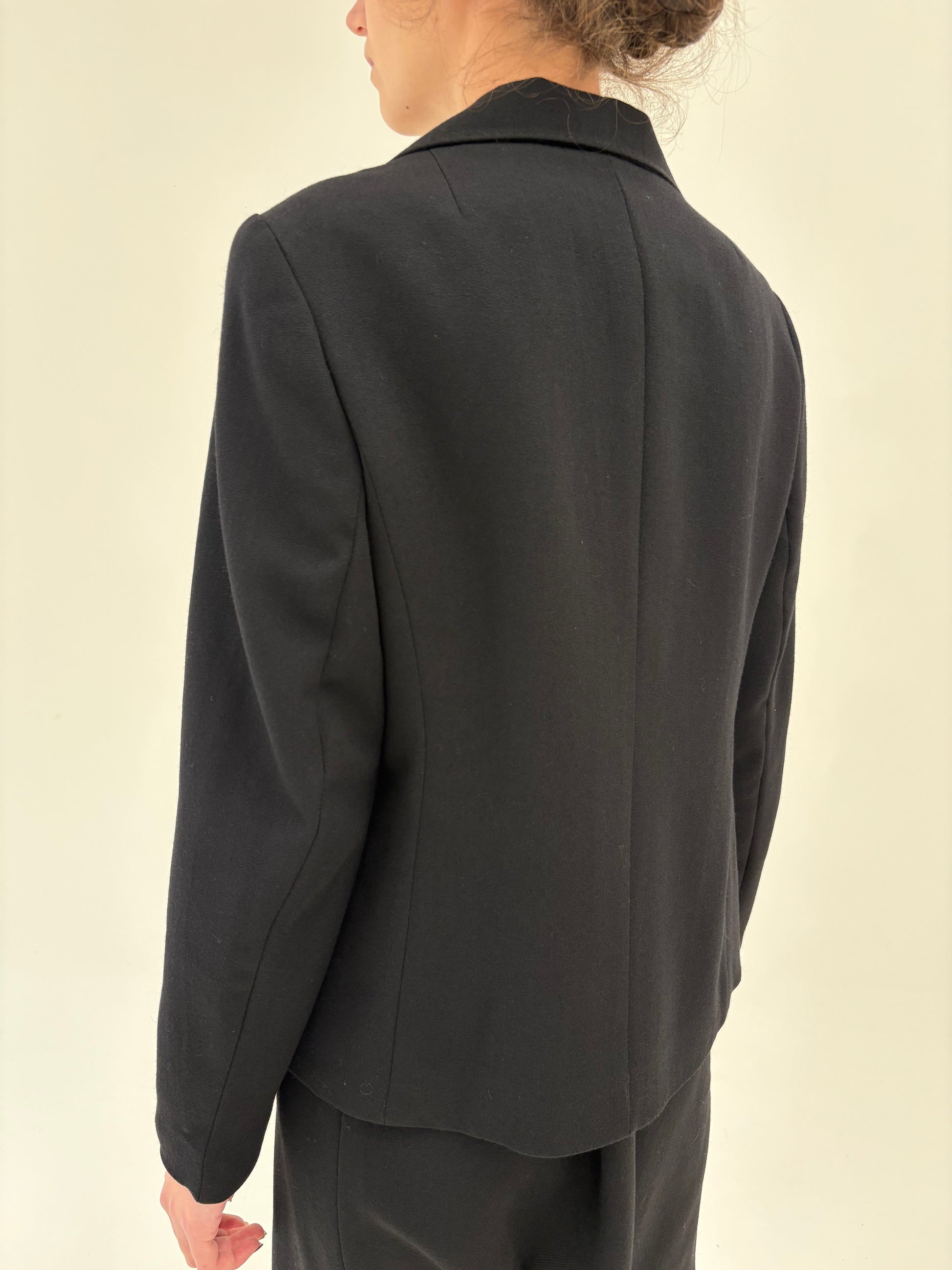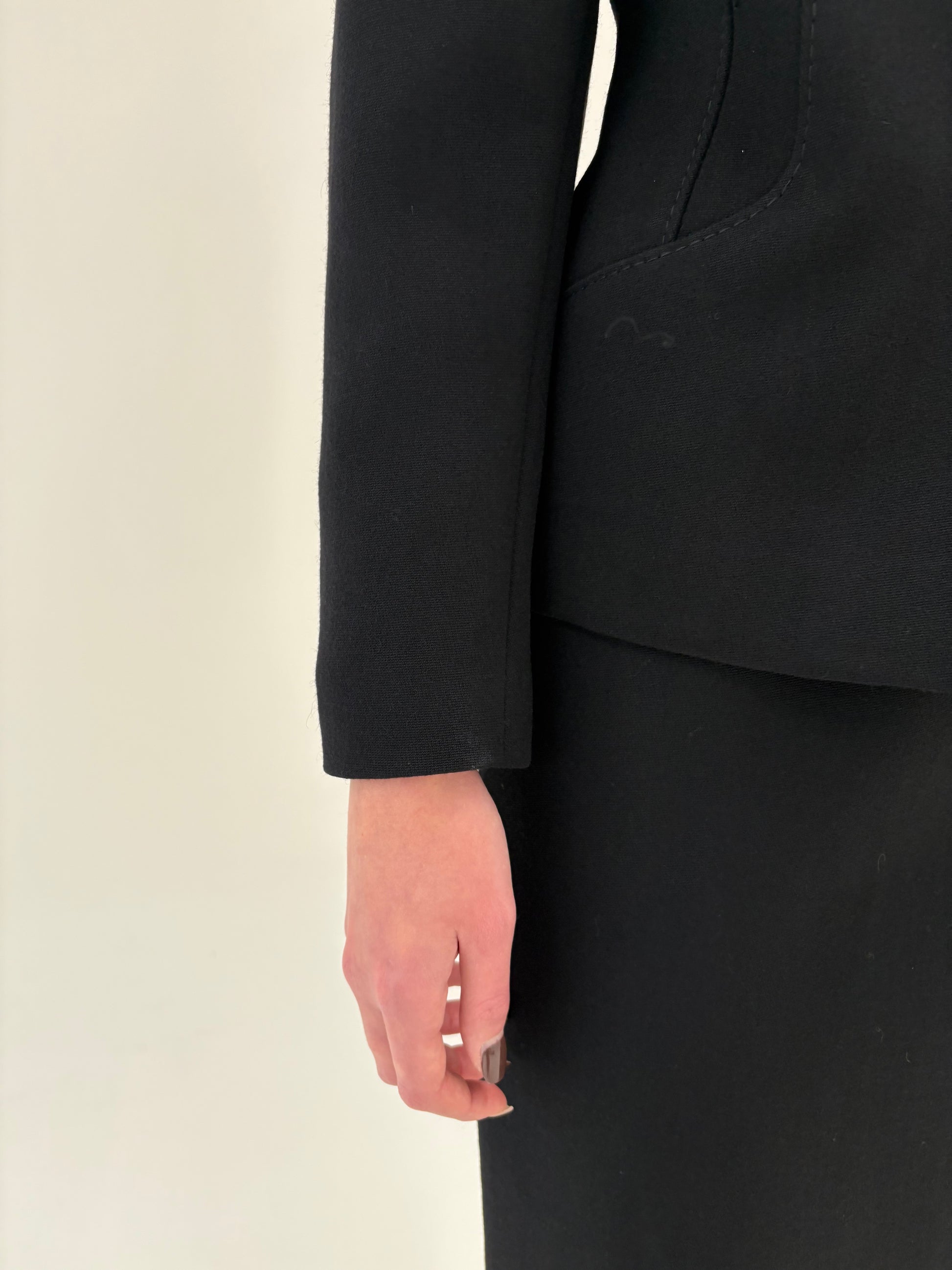 Deux piece vintage negru cu sacou cambrat și revere rotunjite din lana certificată