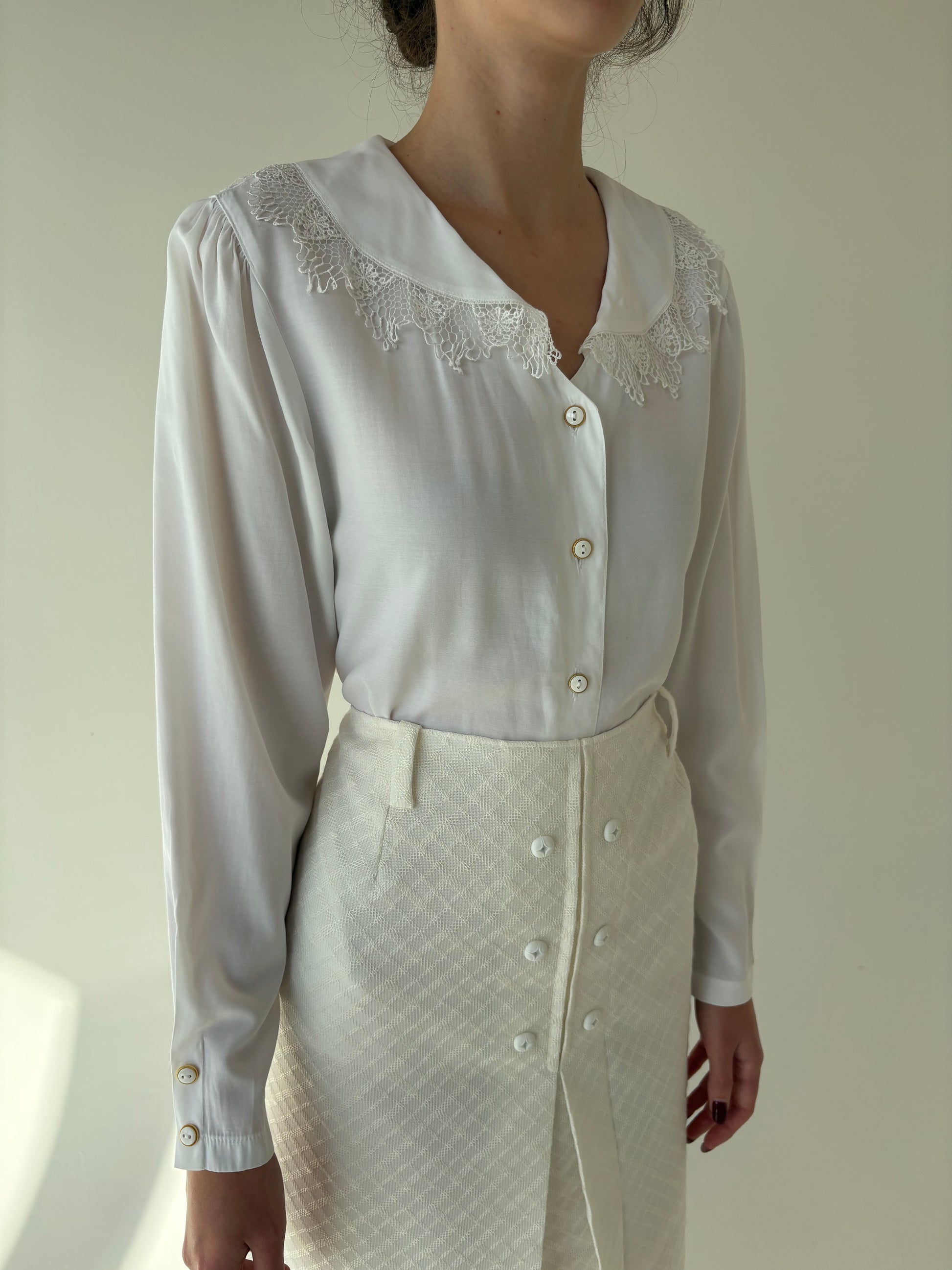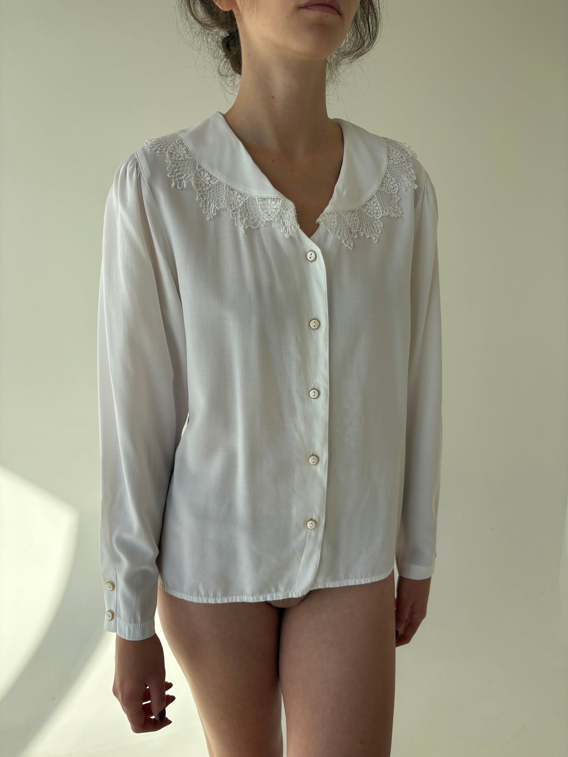 Cămașa vintage cu guler rotunjit și aplicație de dantelă macrame superbă