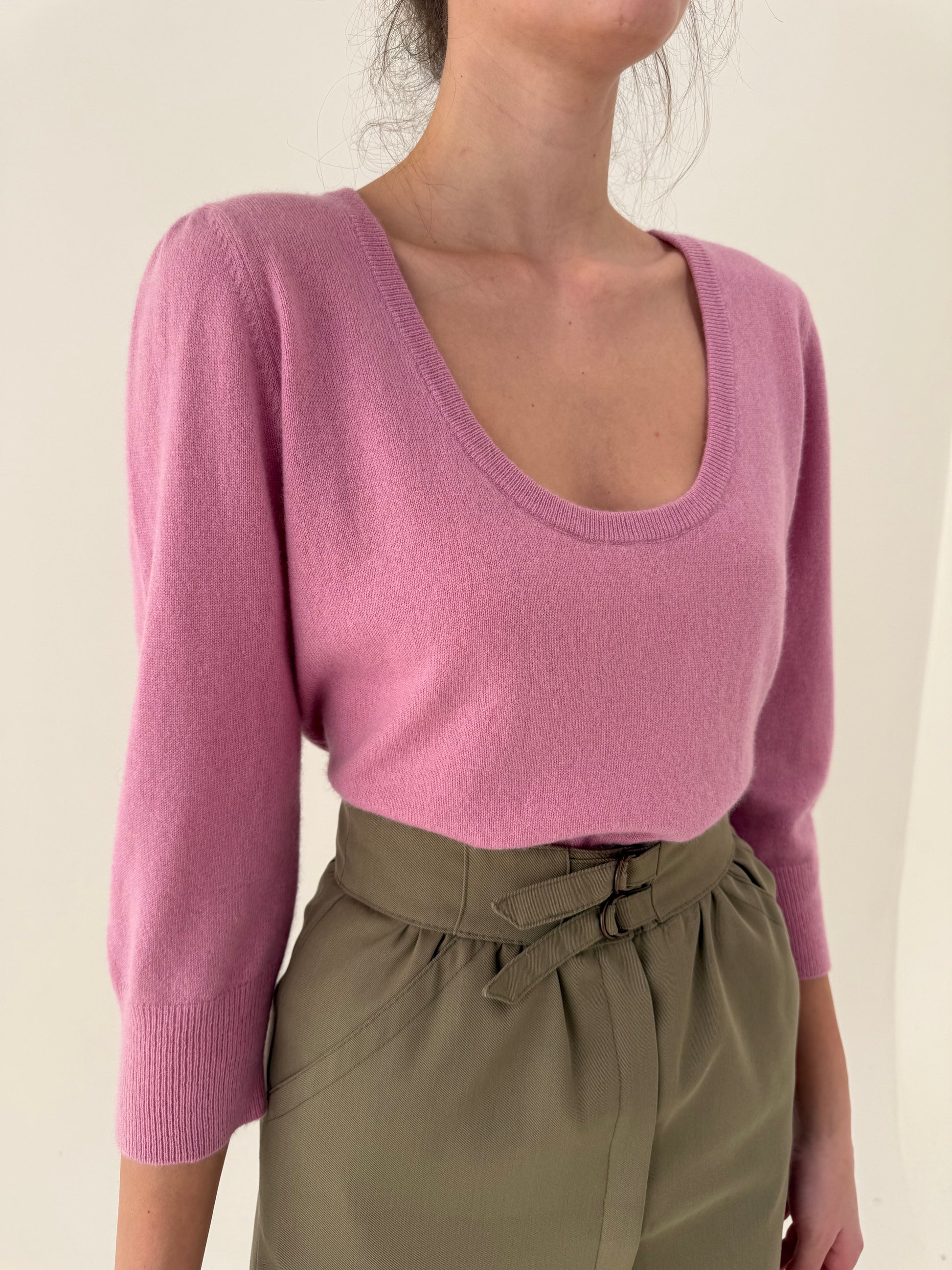 Puloveras din cașmir cu manșete ultra înalte powder Pink și mânecă 3/4