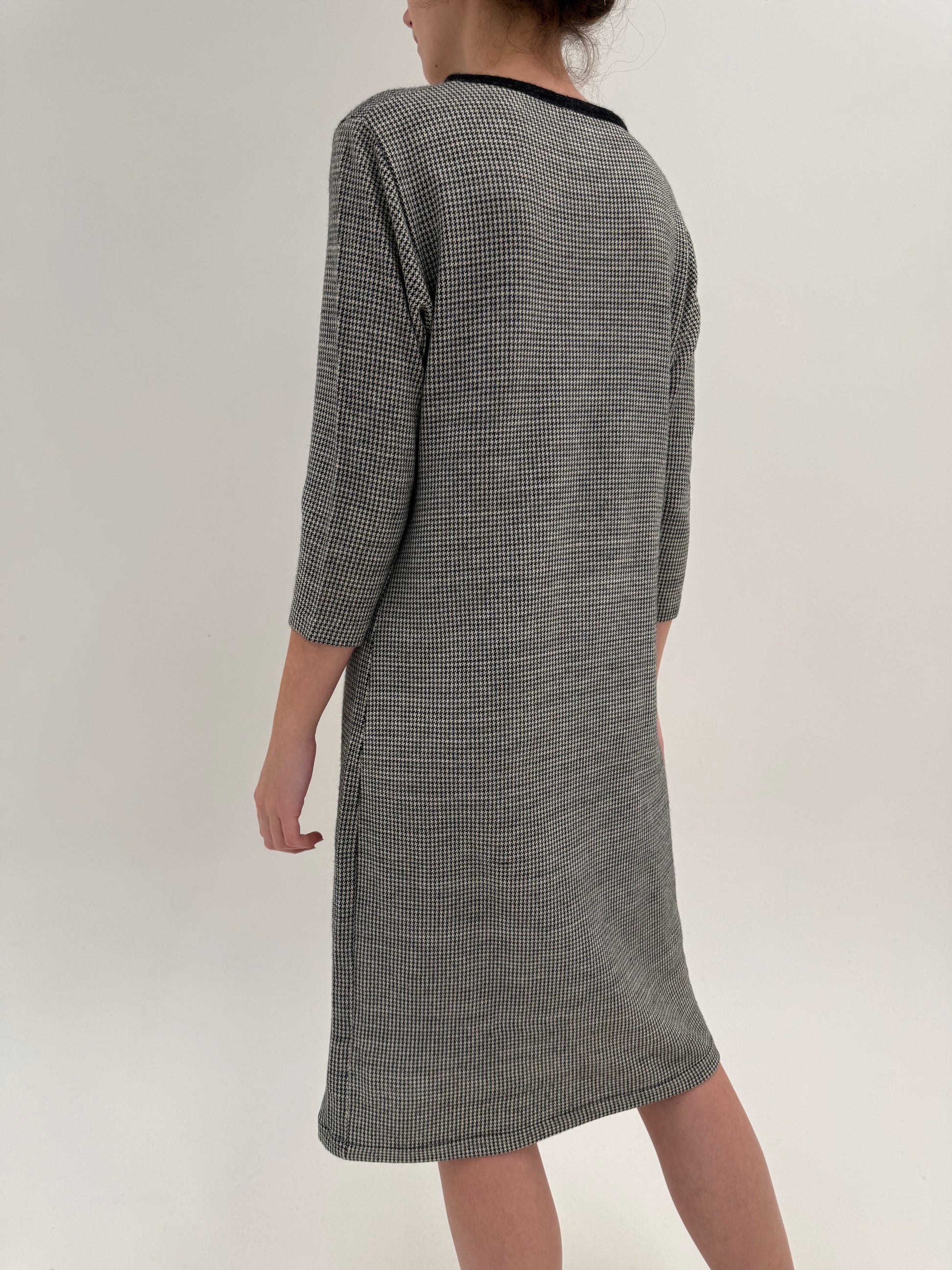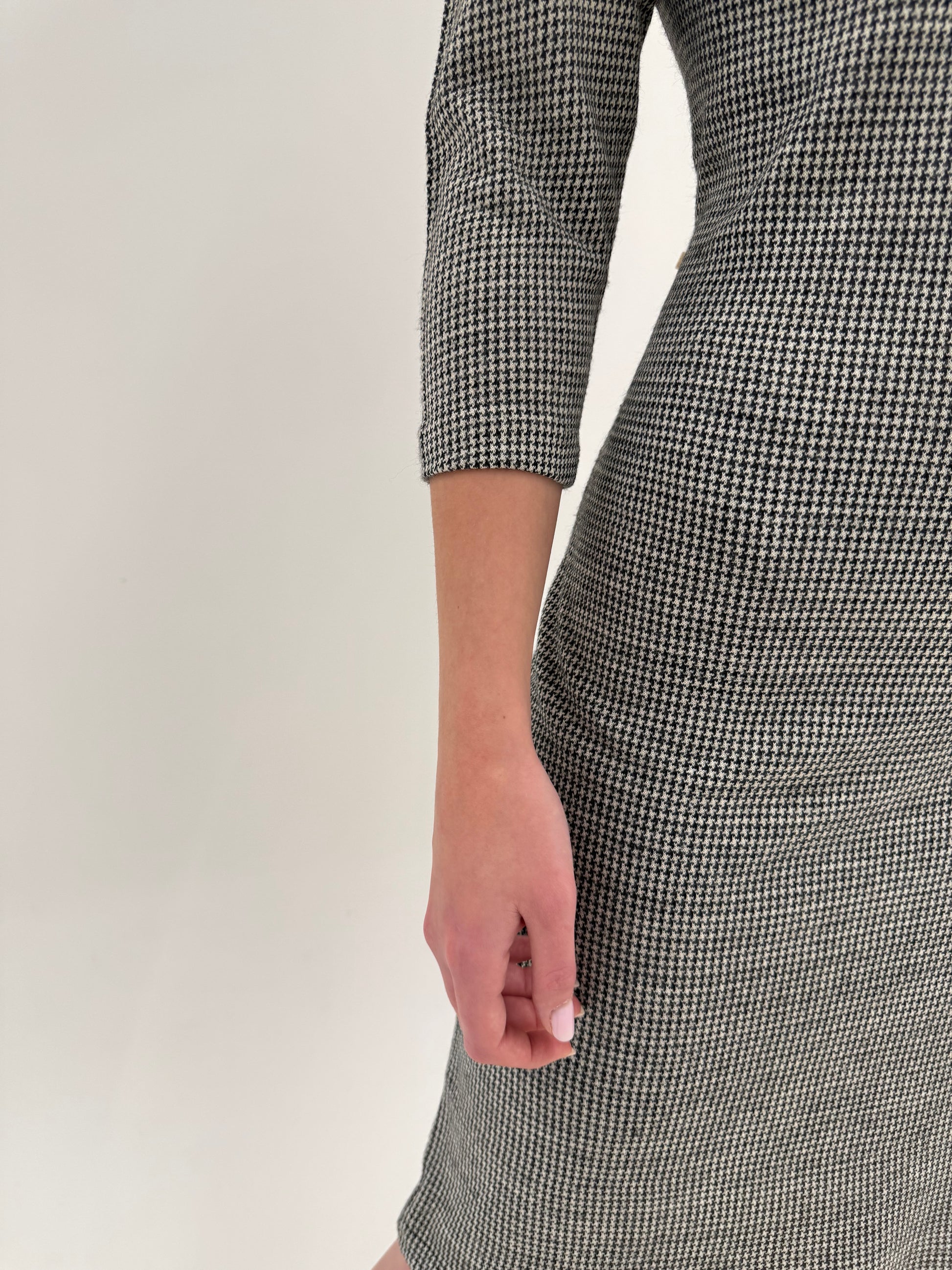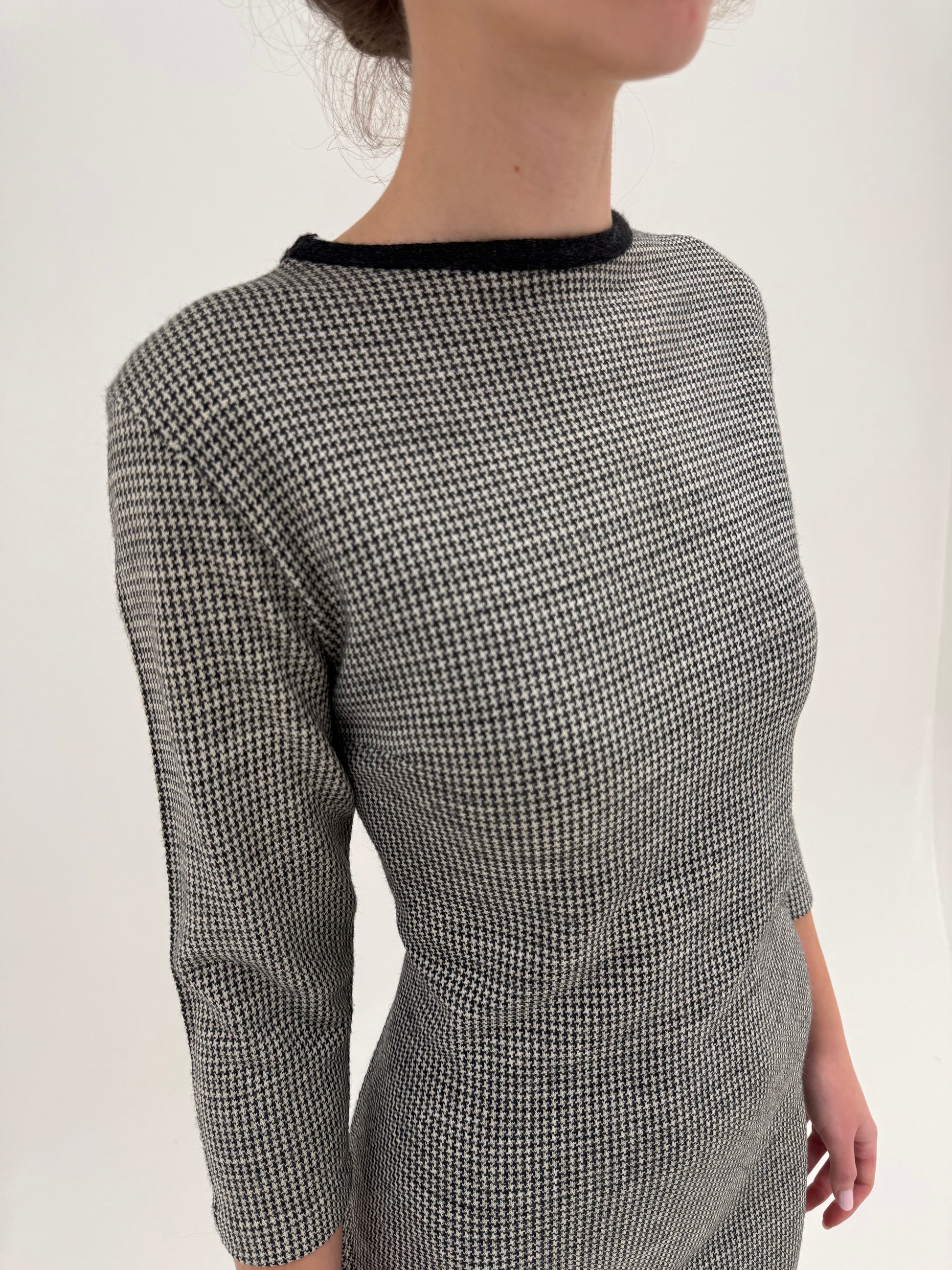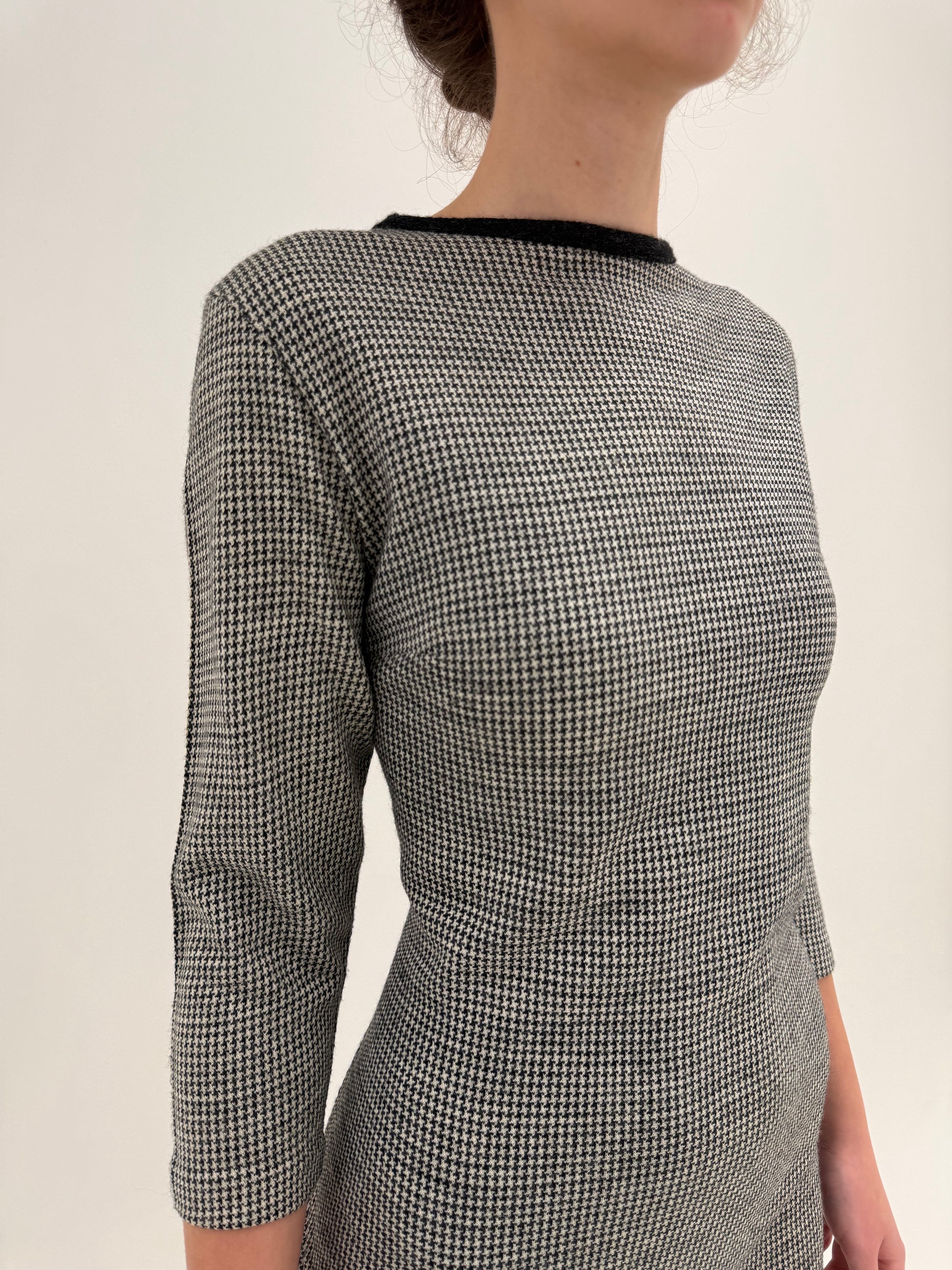 tricotajul fin, cu micro-pattern în două culori, foarte comun la rochiile din lână de sfârșit de 60s