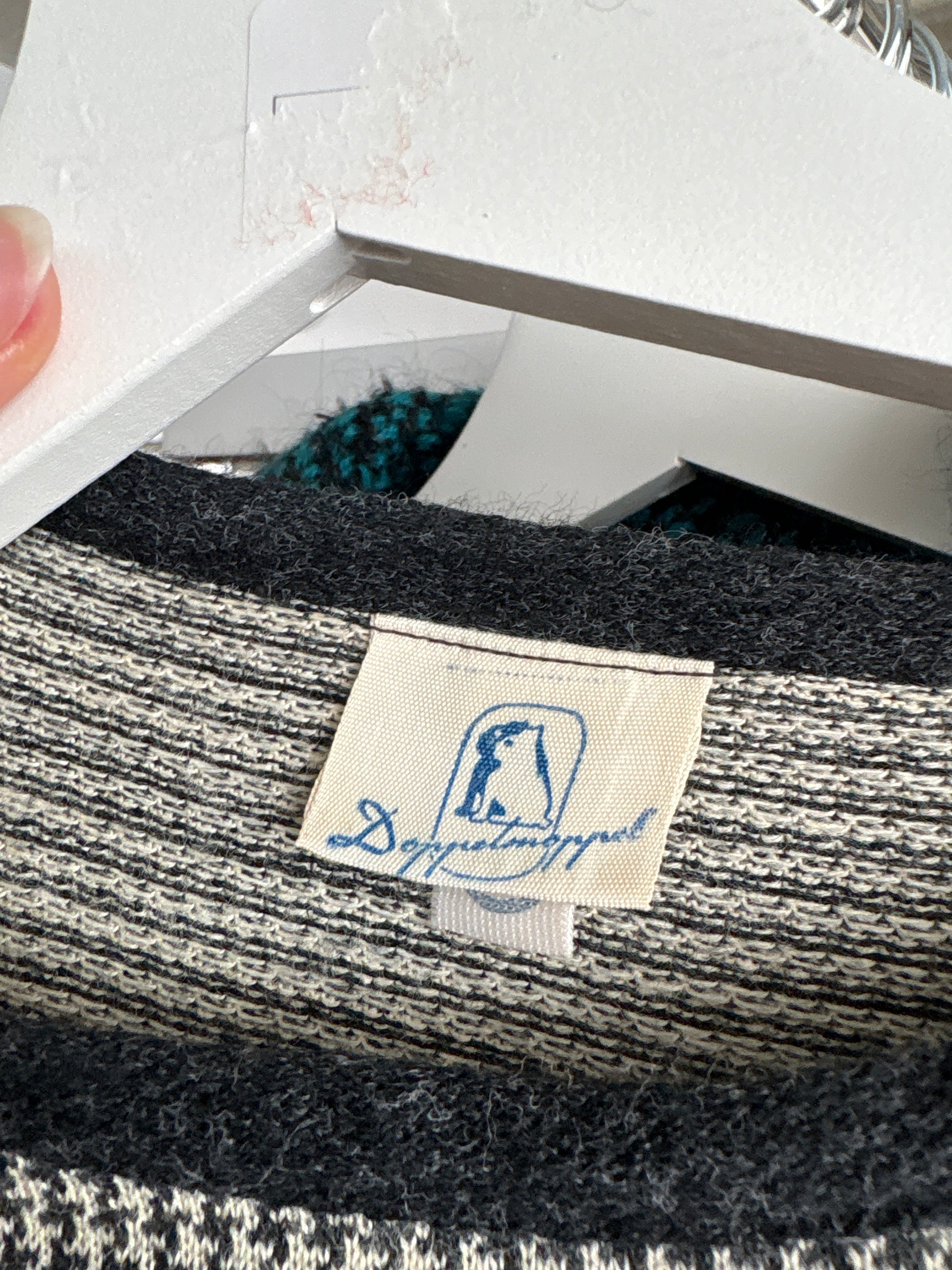 eticheta grafică – desen stilizat, font cursiv, materialul etichetei și modul de coasere sunt specifice 60s