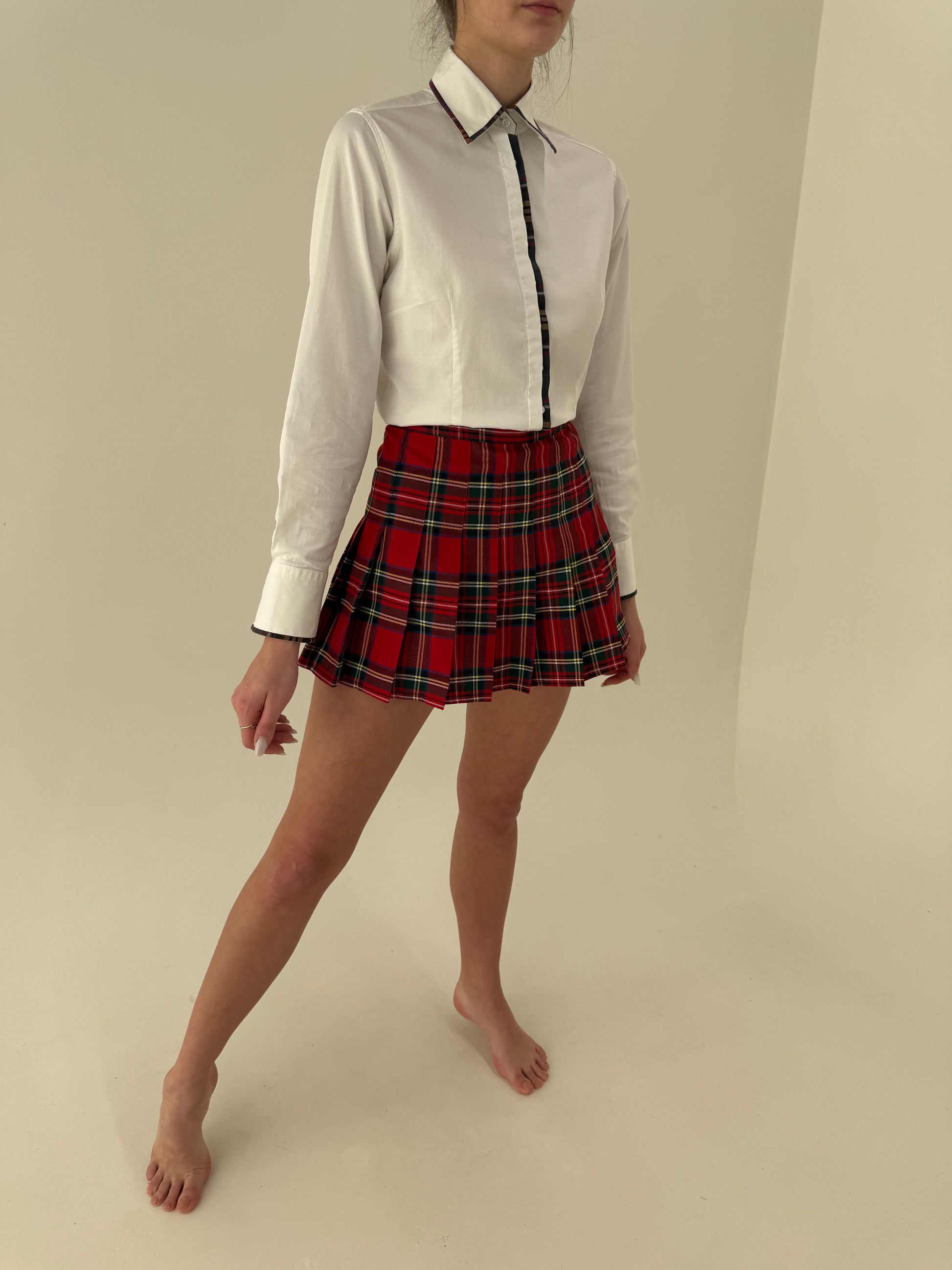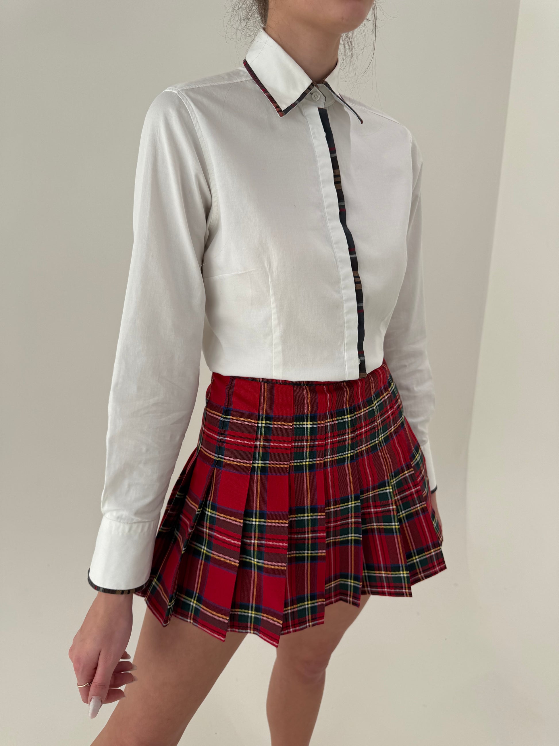Fustă plisată cu pantaloni scurți pe dedesubt în carouri și talie ultra înaltă