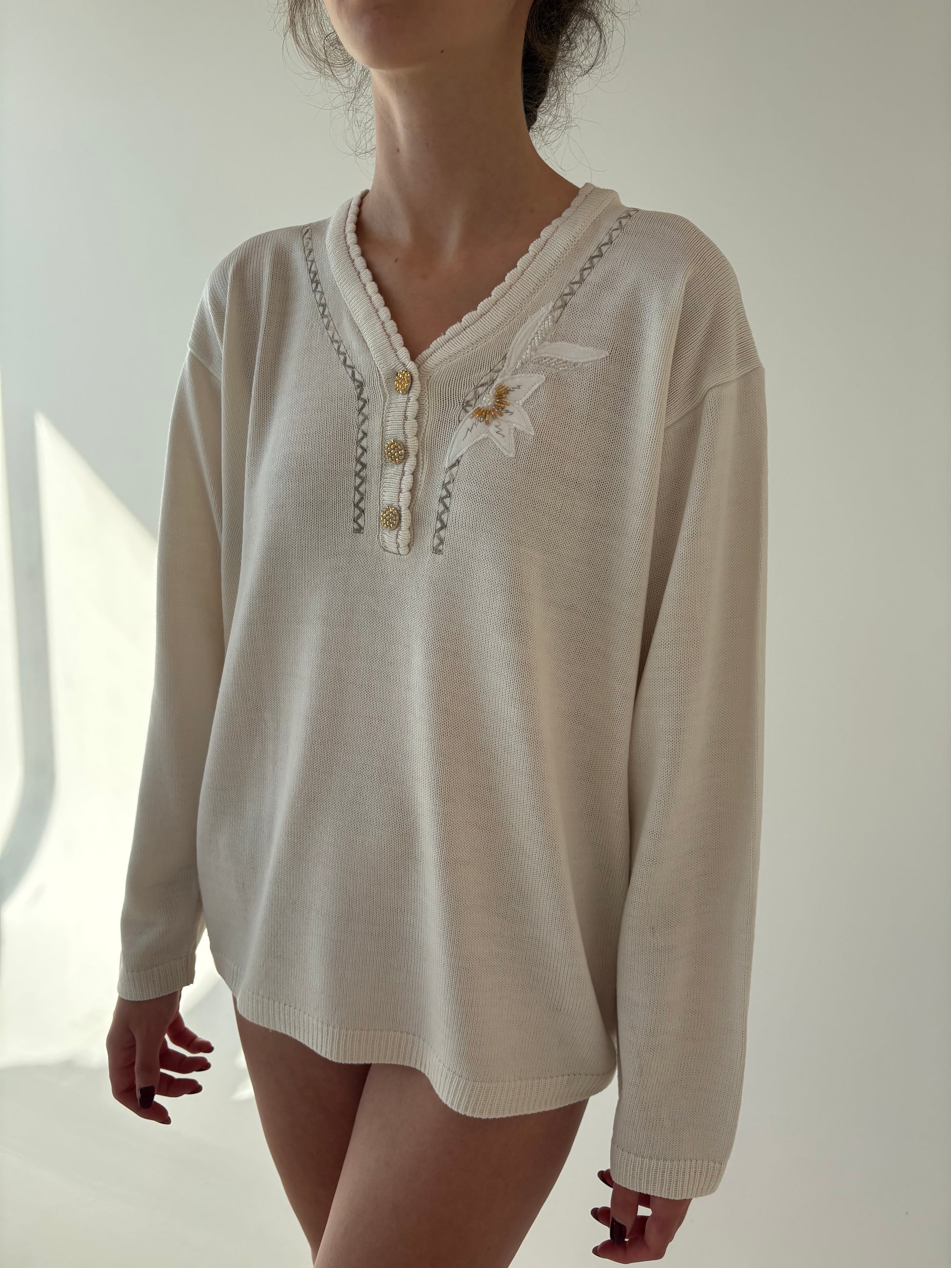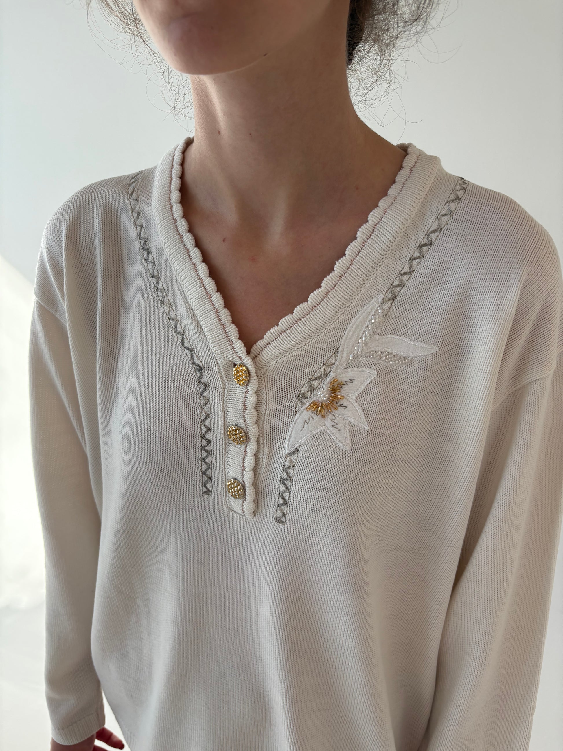 Puloveras vintage butter white cu aplicații delicate din mix de lana