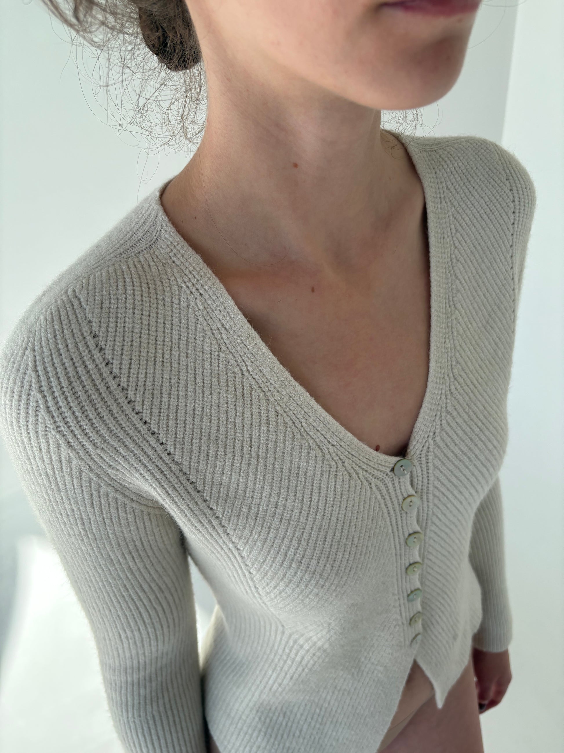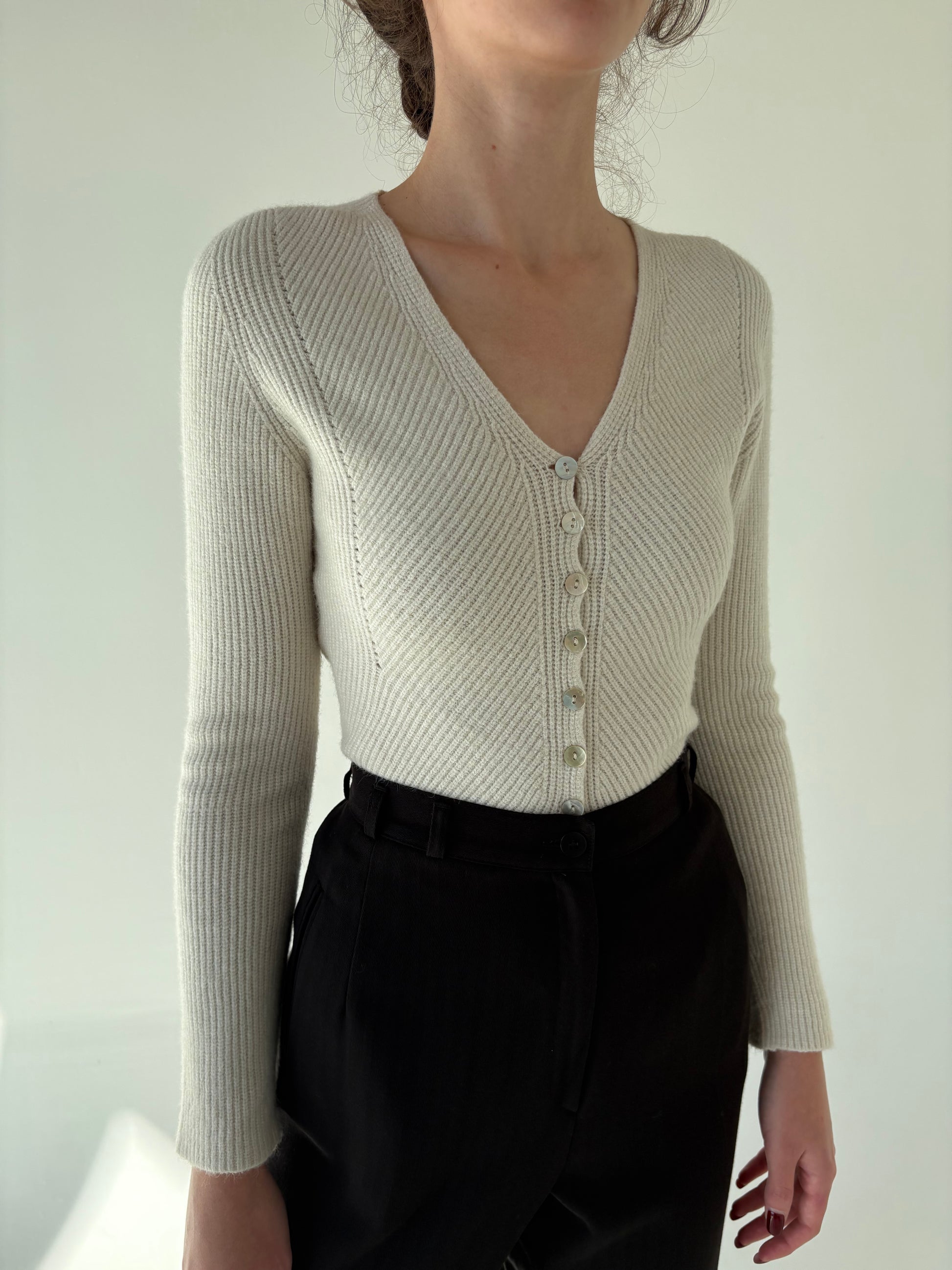 pulover excepțional din jerse pufos și plin, cambrat, cu nasturi mother of pearl