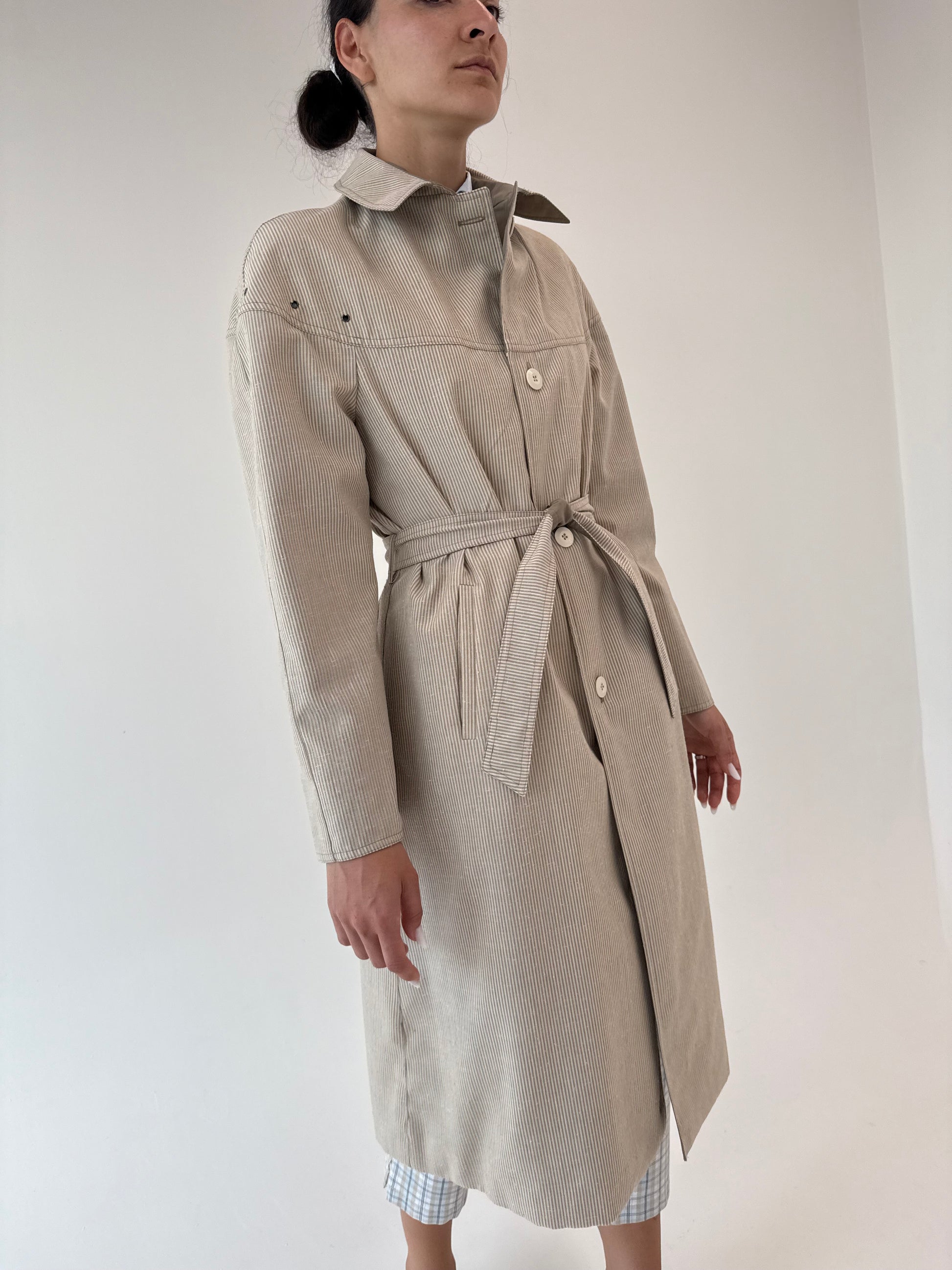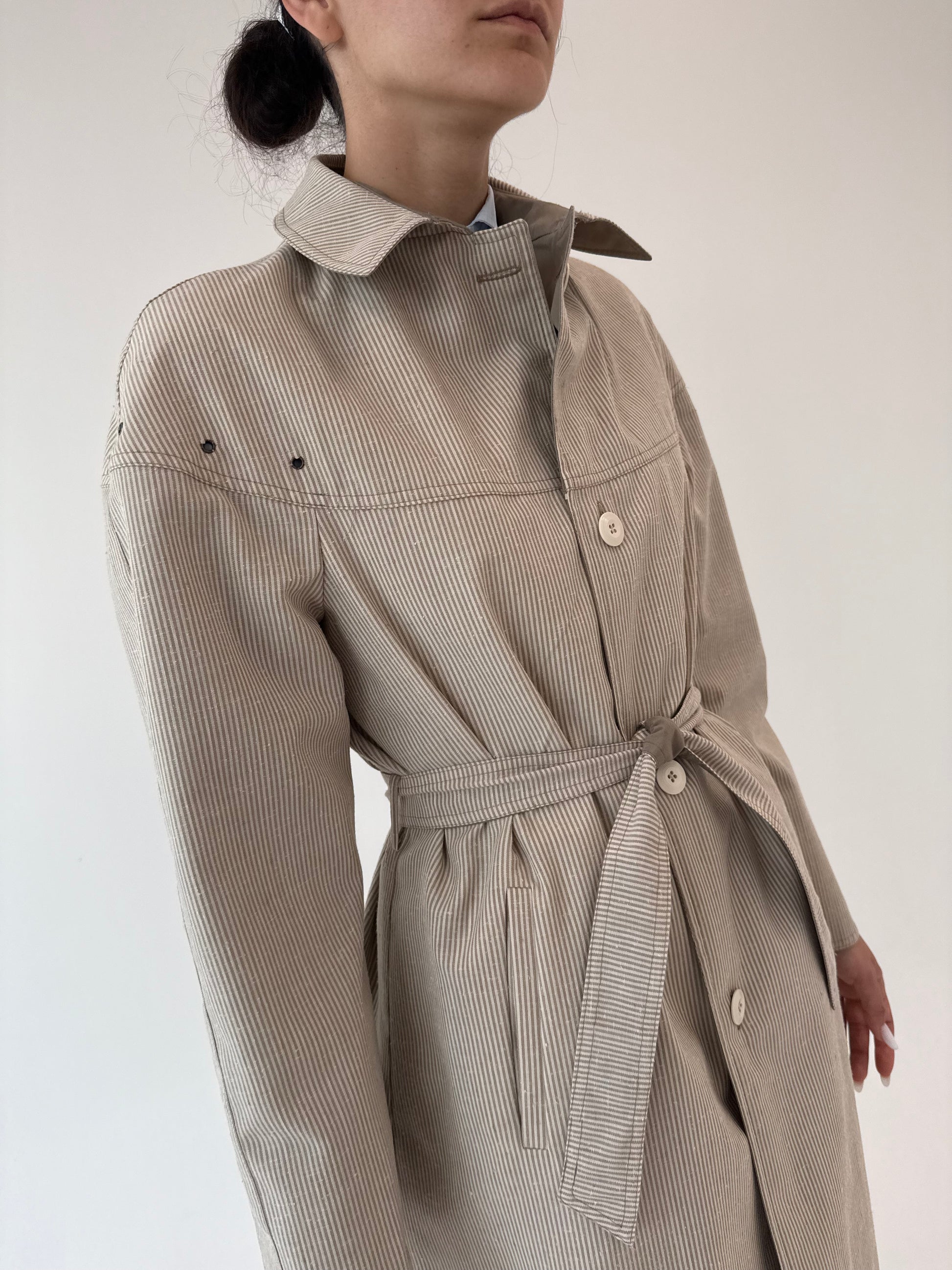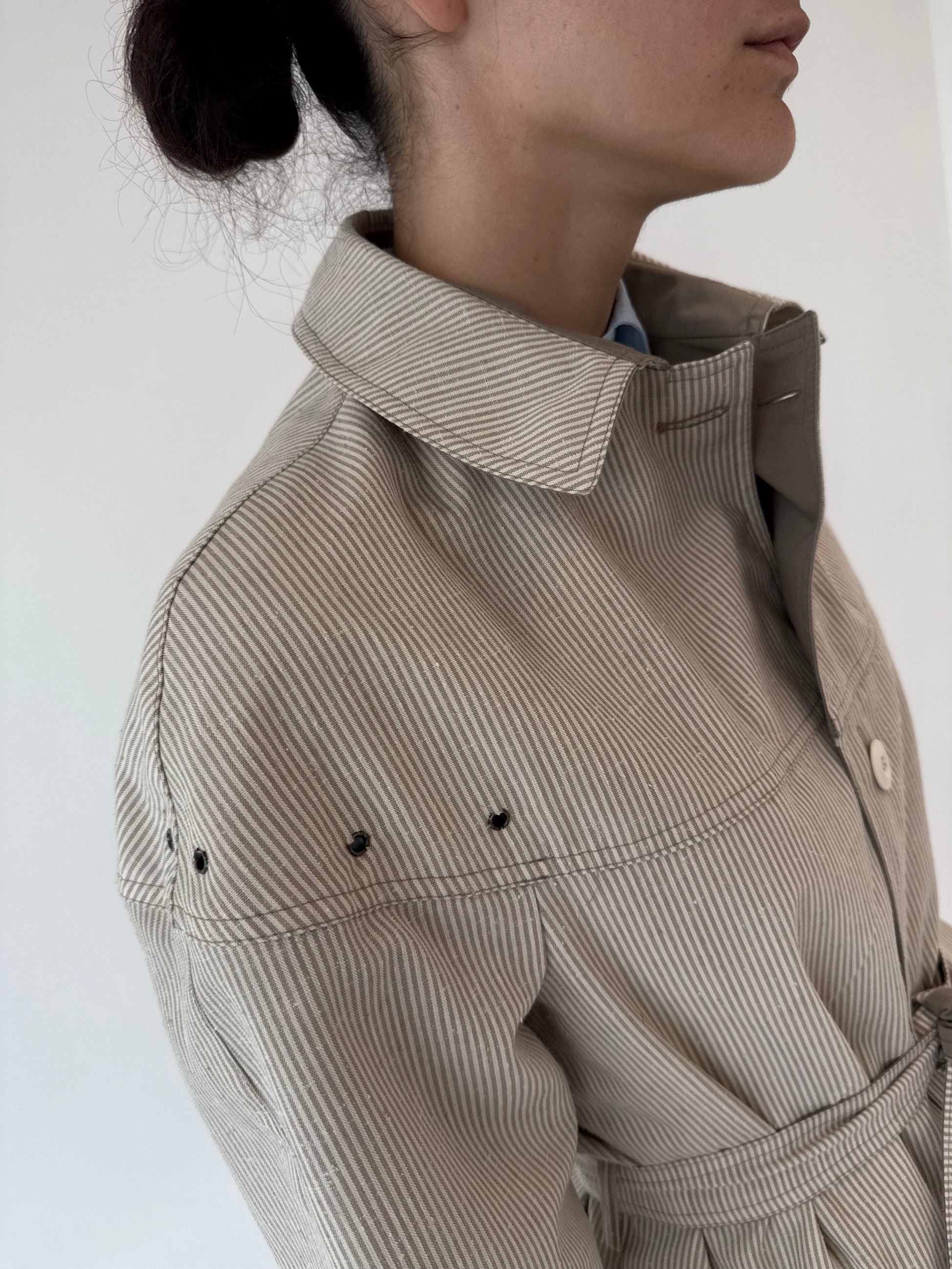are o croială minimalistă cu influențe utilitare, dintr-un material cu dungi foarte fine, aproape ca o țesătură de denim sau doc mai plin, extrem de calitativ . Are nasturi mari, găici de aerisire la umeri și cordon în talie. Detaliul cu două fețe (reversibil) și lipsa epoletilor, dar cu structură clară, îl plasează în perioada anilor 1980 spre sfârșit, când se experimenta mult cu materiale tehnice, croiuri mai line și funcționalitate dublă.