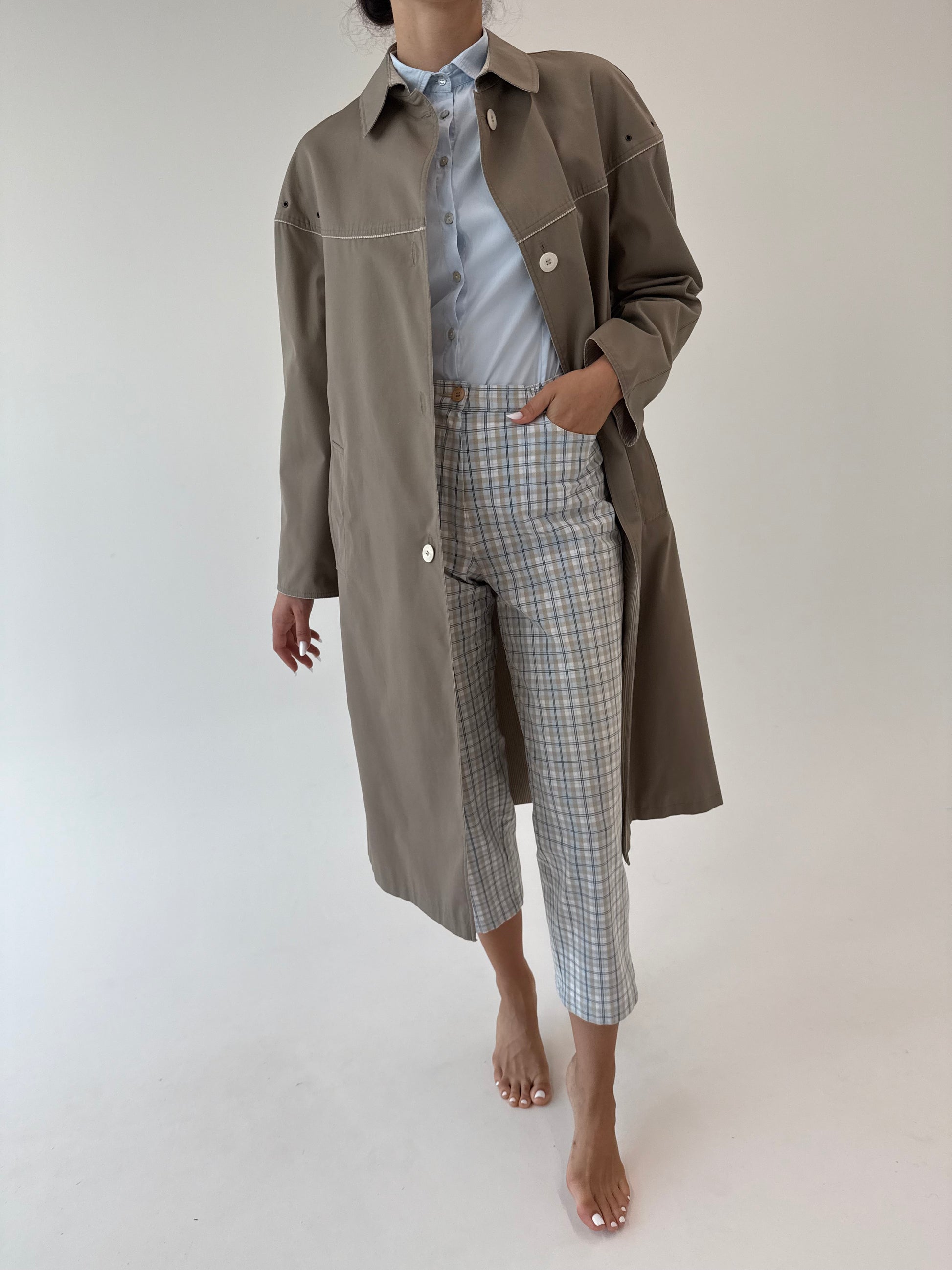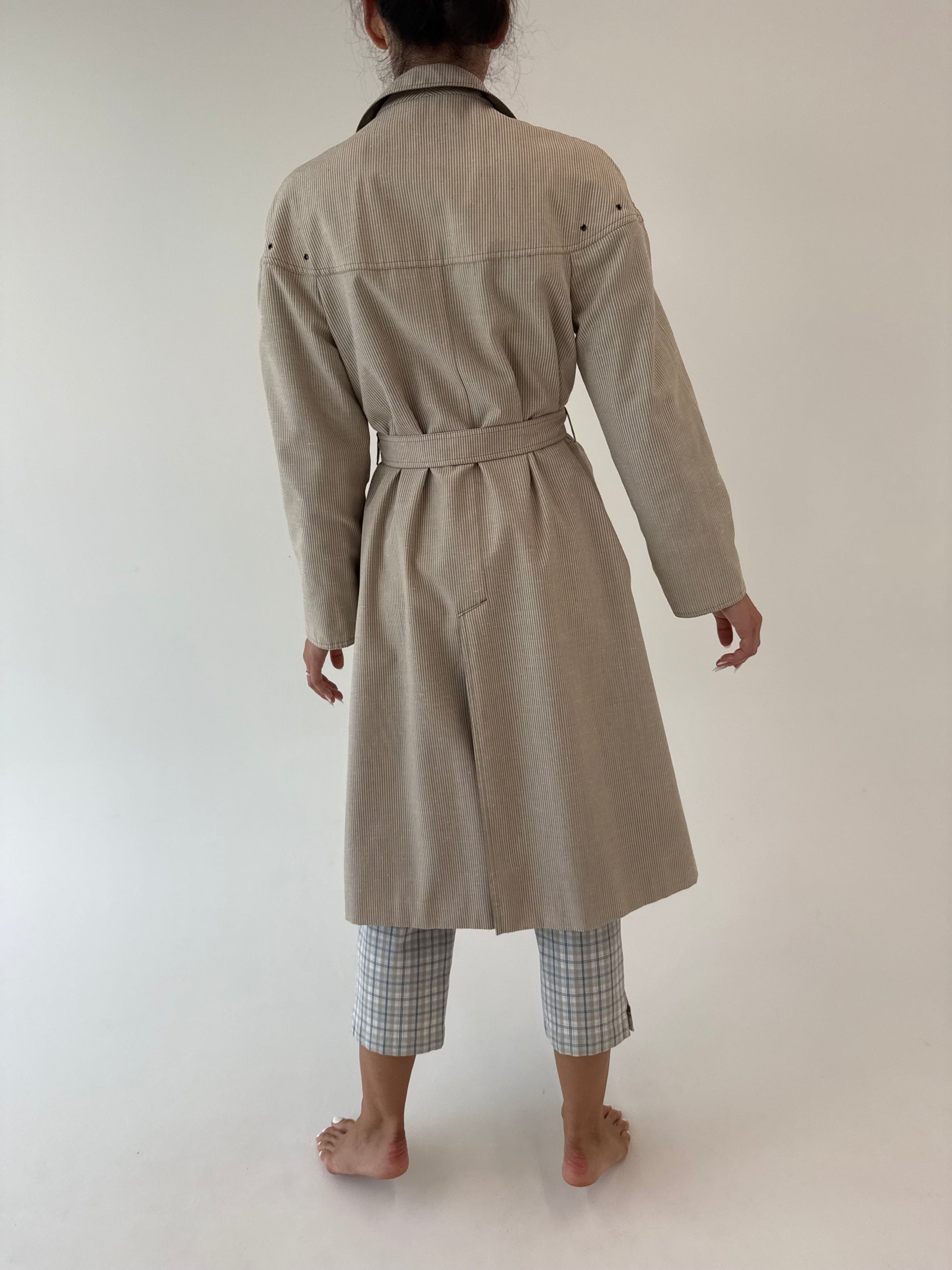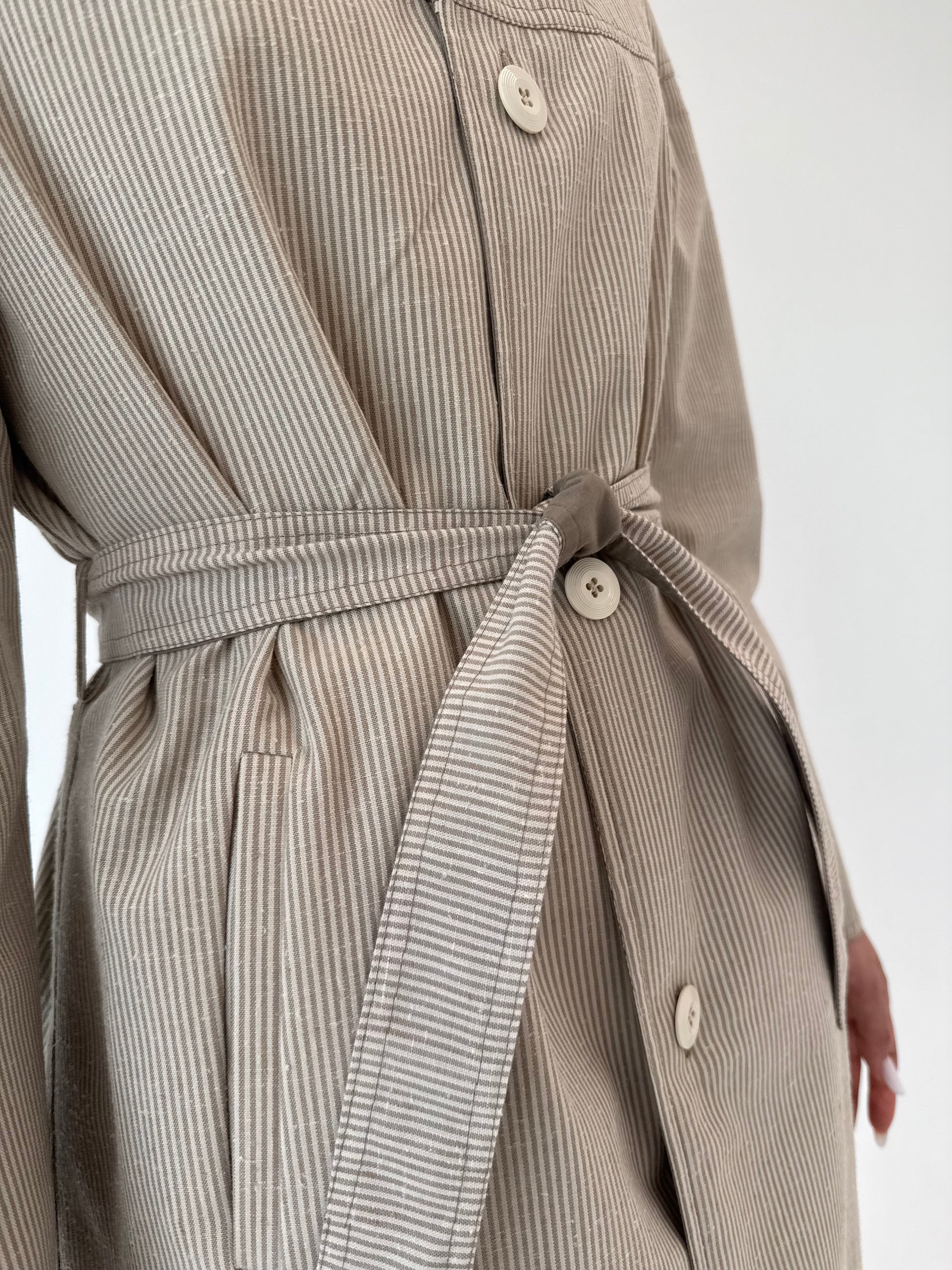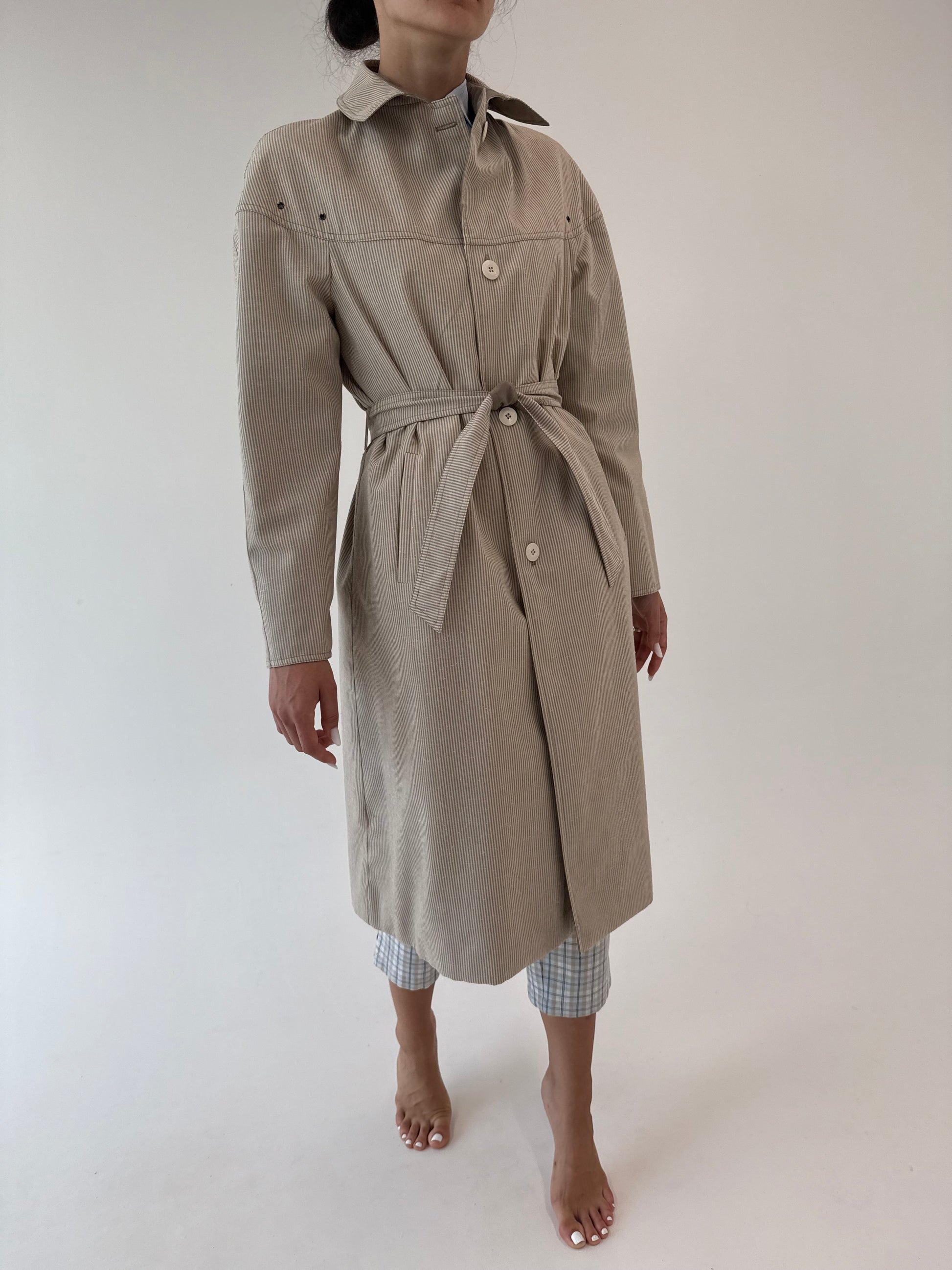 are o croială minimalistă cu influențe utilitare, dintr-un material cu dungi foarte fine, aproape ca o țesătură de denim sau doc mai plin, extrem de calitativ . Are nasturi mari, găici de aerisire la umeri și cordon în talie. Detaliul cu două fețe (reversibil) și lipsa epoletilor, dar cu structură clară, îl plasează în perioada anilor 1980 spre sfârșit, când se experimenta mult cu materiale tehnice, croiuri mai line și funcționalitate dublă.
