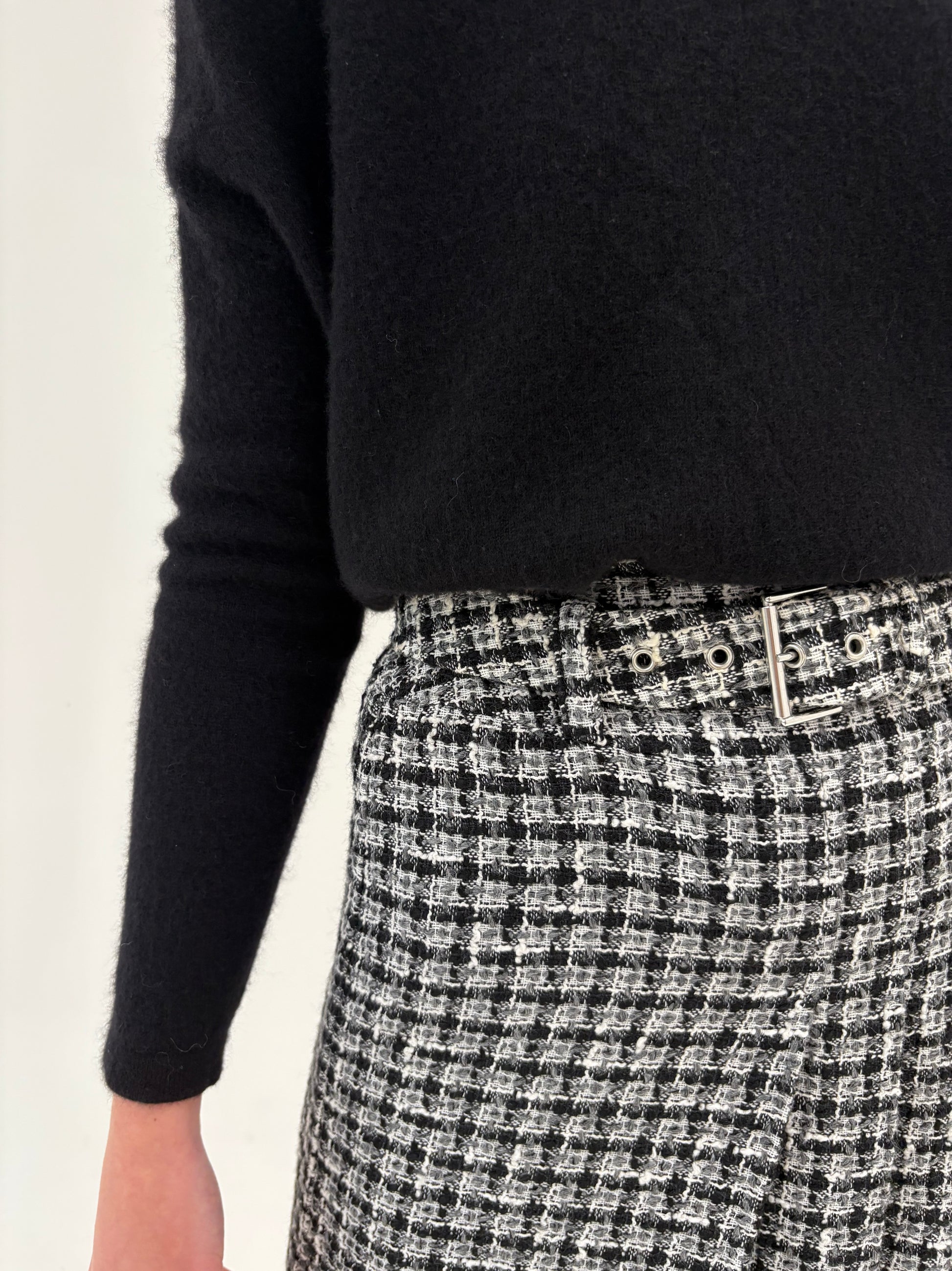 Deux piece in stil Chanel din tweed de lana alb negru cu fusta mini plisată